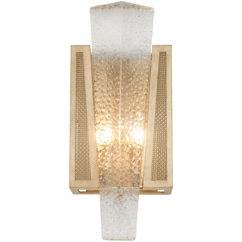 A transformative element of classical architecture has been captured in cast glass by highly skilled artists in our Miami studio. All available in silver leaf or gold leaf finish, with either white textured linen or metal mesh. Sconce shown in gold leaf f