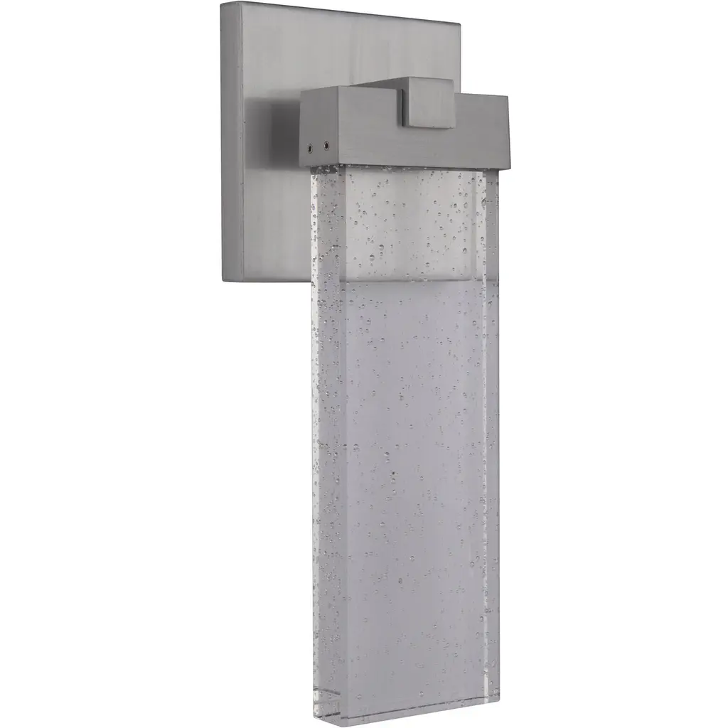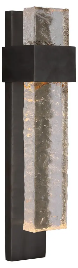 Indoor only wall-mounted art-glass sconce of aluminum in silver leaf finish with handcrafted, polished block of crystal shards. This fixture is photographed with a bright white 4100K bulb(USA). For export, we recommend a 13W threaded CFL. Export configura