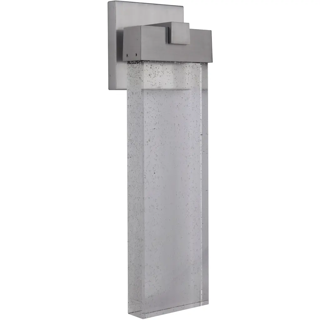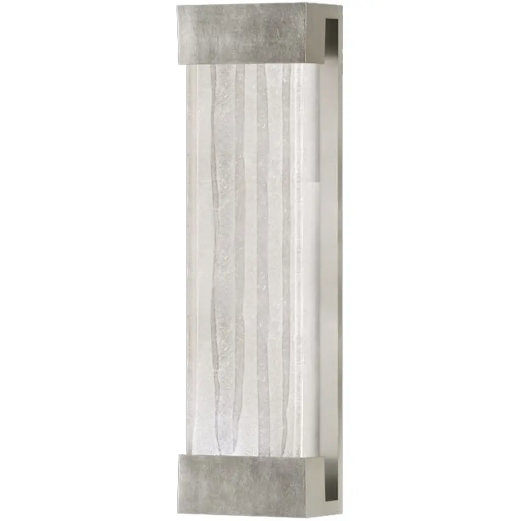Indoor only wall-mounted art-glass sconce of aluminum in silver leaf finish with handcrafted, polished block of crystal shards. This fixture is photographed with a bright white 4100K bulb(USA). For export, we recommend a 13W threaded CFL. Export configura