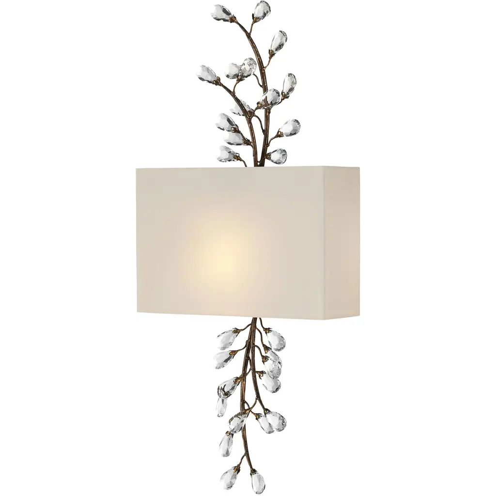 The Crystal Bud Tall Wall Sconce has delicate faceted crystals unfurling from vines that flow above and below its shade. The rust-colored metal in a Cupertino finish serves as a warm contrast to the luminous glass; the interplay making the profile of this crystal sconce complex and interesting. This is one of the fixtures in the varied Crystal Bud family of lights. The crystal sconce has a beautifully placed rectangular shade made of off-white shantung to make the fixture ADA compliant.