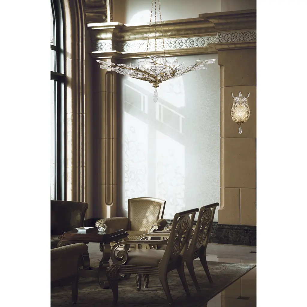 Coupe in antique warm gold leaf featuring antique candlesticks and stylized faceted crystal leaves.