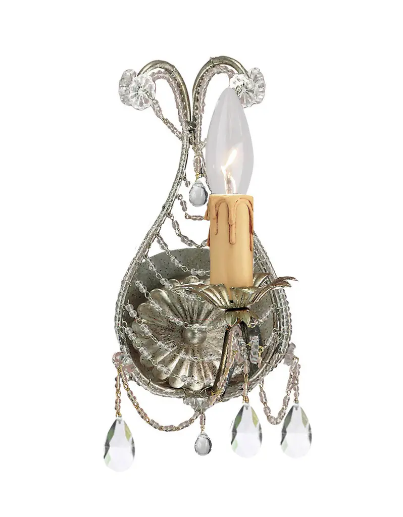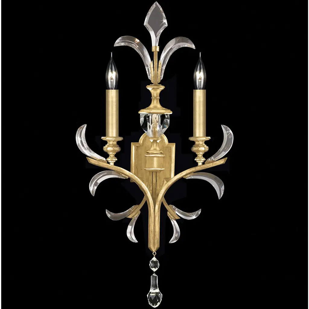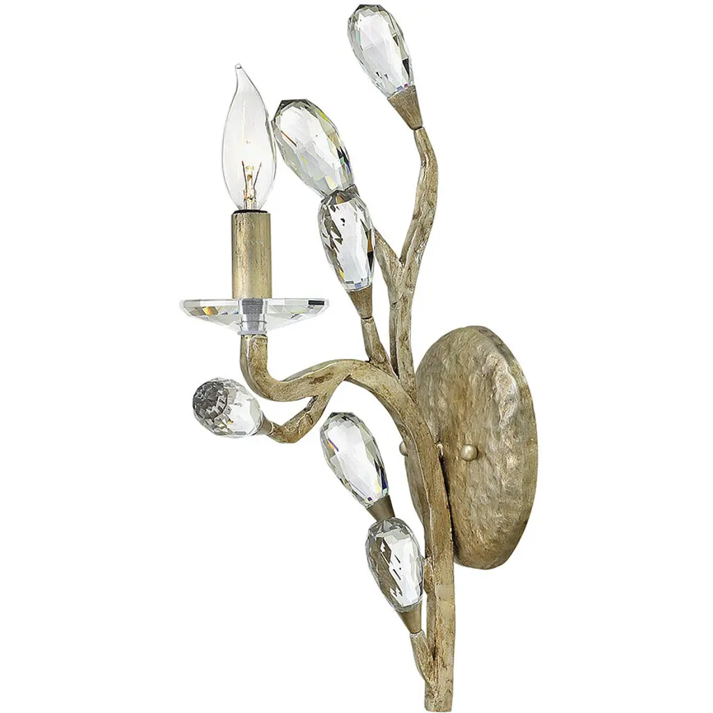 Sconce in a silver leaf finish with warm gray candlesticks featuring stylized faceted crystal leaves.