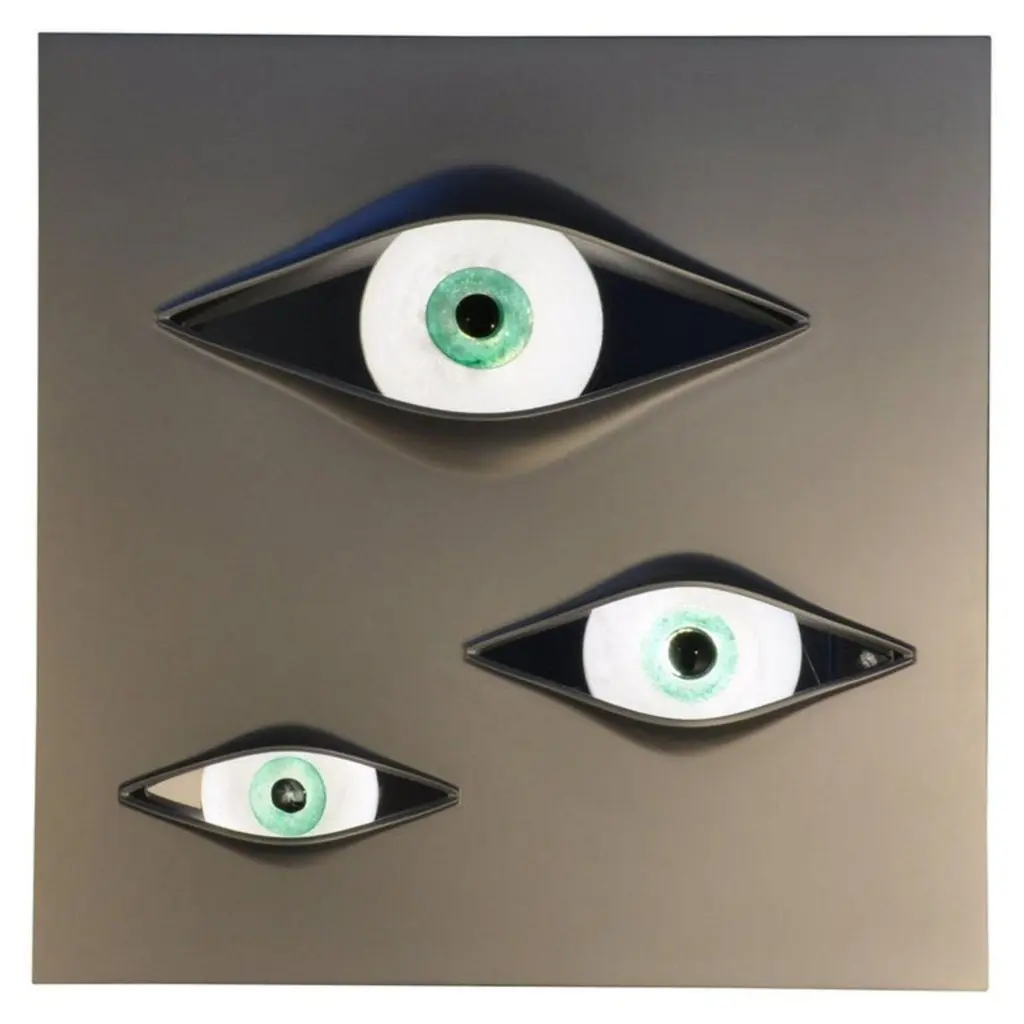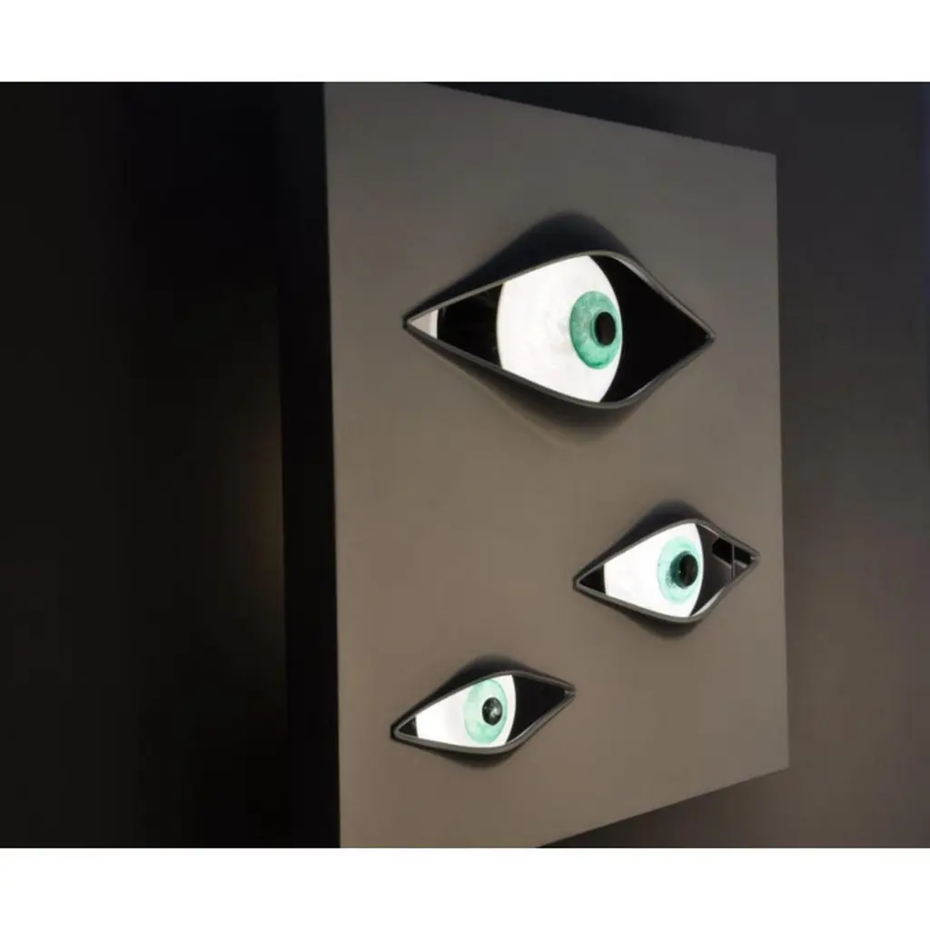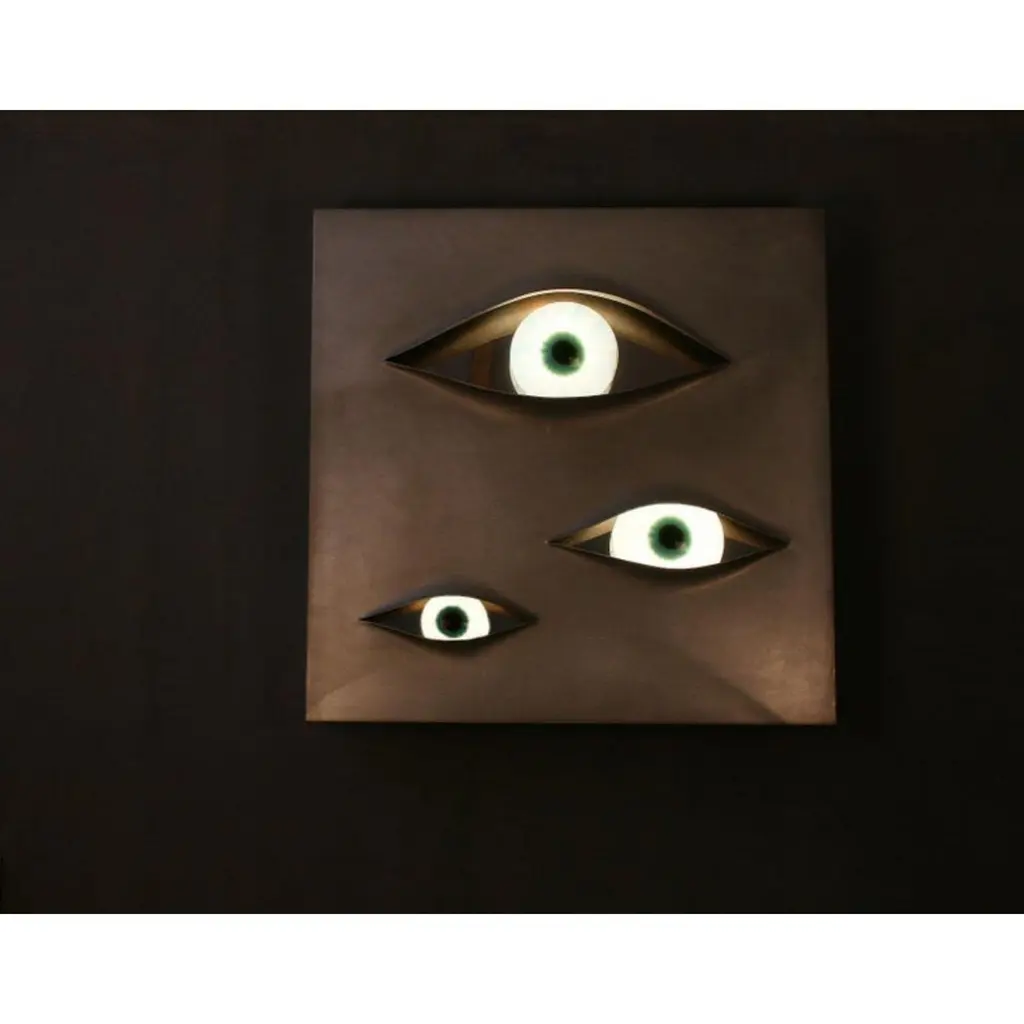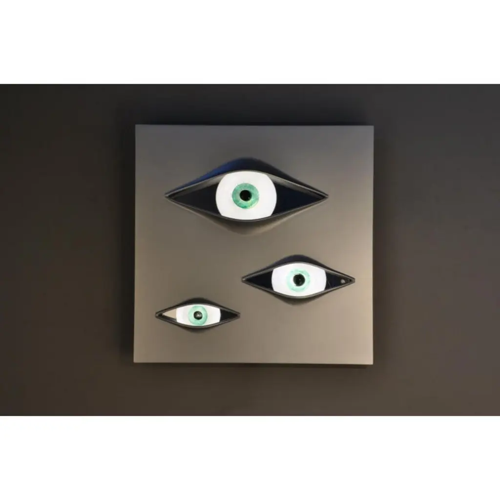 Crystal "Malizia" wall lamp, Angelo BrottoDimensions: 80 x 4 x 80cmMaterials: aluminium, murano glass, sikablockDesigned by Angelo Brotto in 1973. Luminous wall sculpture made with a panel of sikablock and a brushed aluminium finish. The three eyes are made out of crystal.