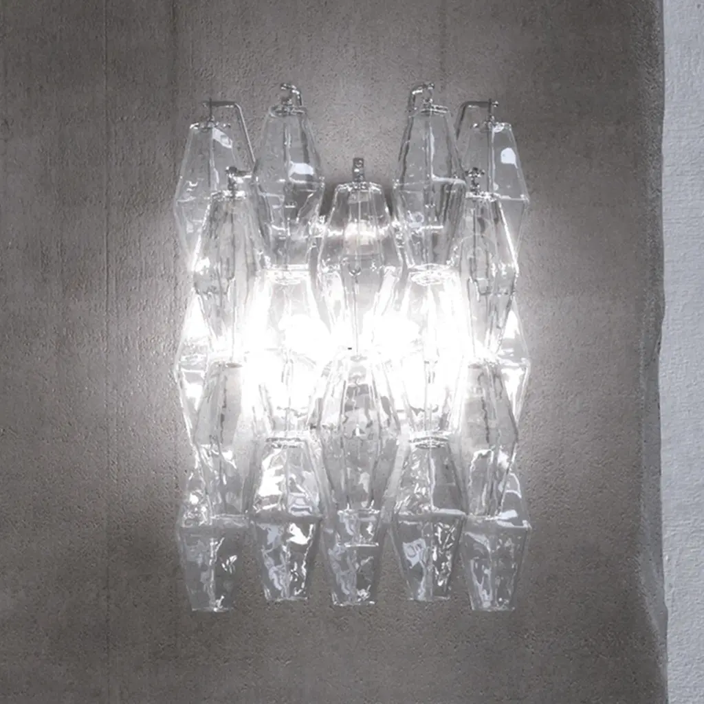 The Poliedri were first proposed as compositional elements of the large Venini chandelier, designed by Ignazio Gardella, Paolo Venini and Enrico Peresutti, presented at the Brussels Expo in 1958, placed in the central hall of the Italian Pavilion. The famous cascade chandelier proposed at the Turin Expo “Italia '61" by Venini with Carlo Scarpa was created with this module. These blown glass elements allow the creation of lighting fixtures of ever-changing shapes and sizes. Spherical chandelier composed of the Poliedri elements, made of blown crystal glass and arranged on multiple levels. The structure of this large suspension is made of chromed metal.