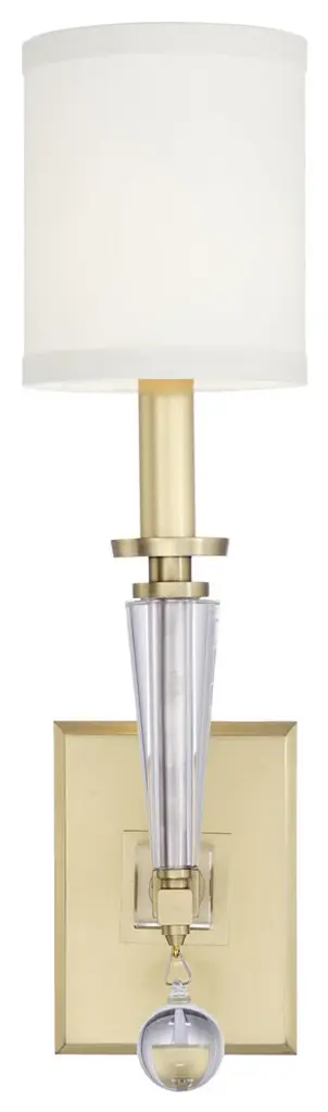 The Paxton collection combines geometrically arranged chunky glass bobeches with a frame of super-sleek, tapered crystal column ending with a single hanging glass ball. The delicate lines of the shapely frame, combined with the precisely balanced arms and simple, tailored shade, create a clean, transitional feeling with a distinct, mid-century modern flair. Stylish, modern and minimal, Paxton brings luxurious appeal to a variety of interior spaces.There is undeniable magic when light meets exquisite crystal and glass. The family-owned design house of Crystorama has been celebrating this marriage for more than 60 years in its lighting creations. Crystorama is known for its standout lighting, which is exceptional in quality and design. With every chandelier it manufactures, Crystorama draws upon its history, knowledge, and legacy of stellar craftsmanship, and then embraces modern shapes, inspirations, and materials. From traditional all-crystal designs, to princess mini chandeliers, to even transitional lighting collections, Crystorama offers styles that will match any decor and are always in fashion.Paxton collection features a versatile modern & contemporary design.A merging of design utilizing minimalist styling and clean lines that add visual appeal to a space.Shipped with Shades included.Aged Brass metal finish is treated to look aged and have a rich hue. This shade is adds a luxurious touch to any room and is perfect for modern and contemporary settings.4.5'''' W x 17'''' H x 8'''' D1 light 60- watt, E12 Candelabra baseMaterials : SteelAuthorized for use in dry interior locations. Meets United States UL Underwriters Laboratories Product Safety Standards.The Paxton is a transitional family offered in two finishes.Product Finish : Aged BrassCrystal Type / Bead Material : Clear Glass DropsItem Shape : Armed SconceGlass/Shade Material : SilkRate- Wet/Damp/Dry : DryListing : UL,CUL,CSAHanging Weight (lbs) : 5Item Width : 4.5"Item Height : 17"Item Depth : 8"Overall Height : 17"ADA Compliant : NoTotal Number of Light : 1Wattage : 60Bulb Base : E12 CandelabraVoltage : 120v