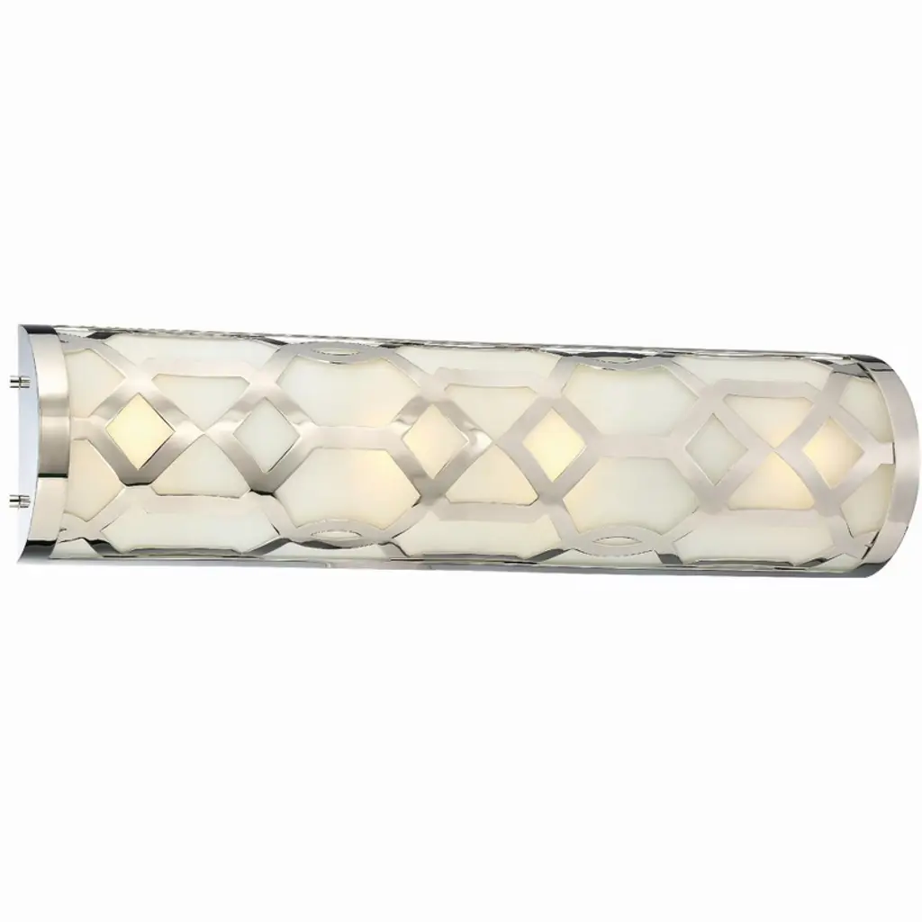 A striking geometric statement, the Jennings collection pairs Libby Langdon's signature classic design with a modern flair. The Jennings is an open, graphic metal design with a white glass shade. A perfect marriage of classic and modern creating the ideal elegance. Jennings collection features a versatile design. / A balanced blend of traditional and contemporary elements, featuring clean lines, neutral finishes, and subtle detailing, offering versatile designs that complement a variety of interiors. / The Jennings drum shade features Libby Langdon's signature pattern. Fixture is Pre-Integrated with LED PCB. CRI: 90 Color Temp: 3000, Lumens: 2,800. / Polished Nickel metal finish, perfect for modern & contemporary settings. / 24"W x 6.5"H x 4"D / 1 light 28- watt, Integrated LED base / Steel / Authorized for use in damp, high-humidity interior locations or protected exterior locations. Meets United States UL Underwriters Laboratories Product Safety Standards / This drum shaded series i