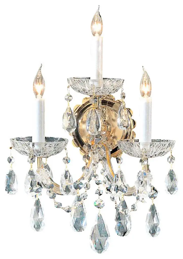 Draped in an abundance of crystal, the Maria Theresa collection is the epitome of high style. The fixture is stunning with glass arm frame decked with strands of faceted cut crystal. The fixture showcases opulence and decadence and is the perfect traditional accent to any space. Whether in a living room, or even closet or hallway, this fixture bring a luxurious addition to any decor. Maria Theresa collection features a versatile traditional design. / Timeless designs with intricate metalwork, curved arms, crystal embellishments, and classic finishes, bringing a sense of warmth and heritage to any space. / The glass paneled arms of the Maria Theresa collection is a true nod to the classics. / Gold metal finish, perfect for traditional settings. / 11"W x 22.5"H x 8"D / 3 light 60- watt, E12 Candelabra base / Glass / Authorized for use in damp, high-humidity interior locations or protected exterior locations. Meets United States UL Underwriters Laboratories Product Safety Standards / Thi