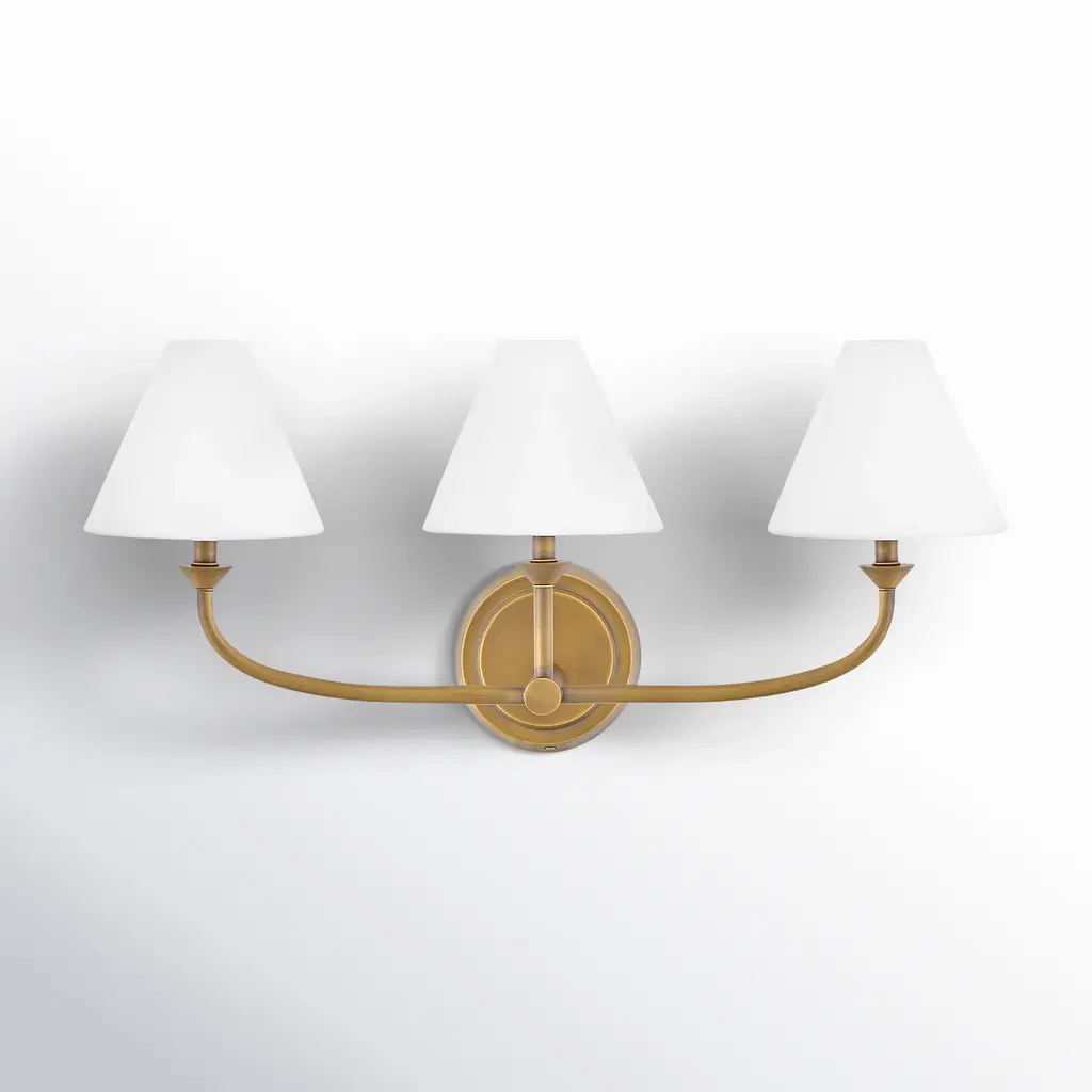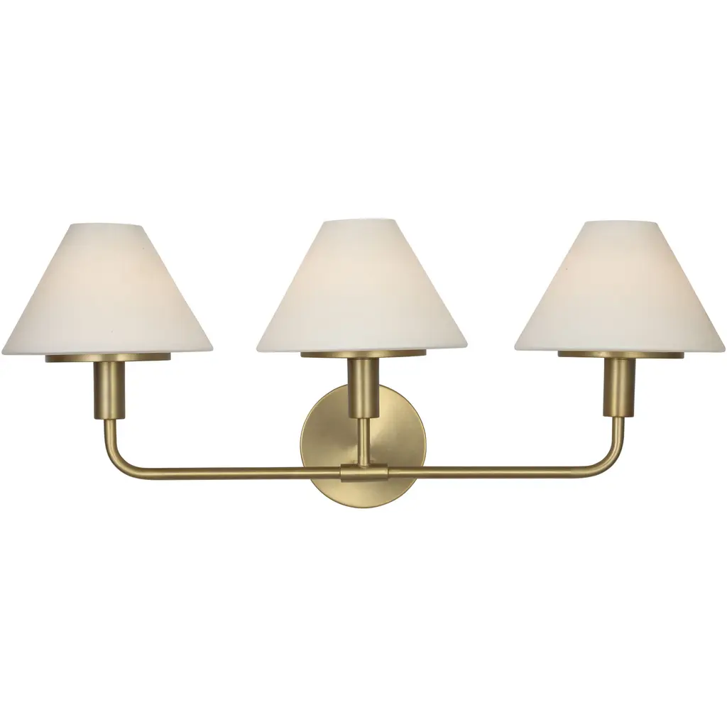 The Libby Langdon designed Sylvan wall mount offers a simple yet sophisticated design to brighten up any space. The circular backplate has gracefully upward sweeping arms, complemented by a tapered glass shade. The Sylvan adds a touch of tailored elegance and modern styling to any interior. Sylvan collection features a versatile transitional design. / A balanced blend of traditional and contemporary elements, featuring clean lines, neutral finishes, and subtle detailing, offering versatile designs that complement a variety of interiors. / Includes white enclosed glass shades. / The Vibrant Gold metal finish has a softer gold color. This finish adds sophistication to any space and pairs elegantly with traditional, transitional, and contemporary d�cor. / 23.25"W x 13.25"H x 9.75"D / 3 light 60- watt, E26 Medium base / Steel + Glass / Authorized for use in damp, high-humidity interior locations or protected exterior locations. Meets United States UL Underwriters Laboratories Product Safe