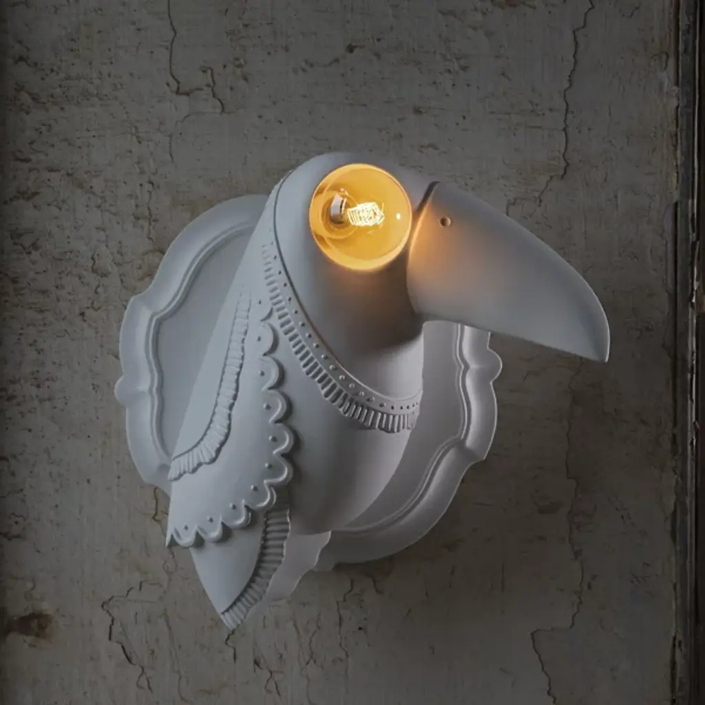 A sleek and stylish modern piece, the Cubano Wall Sconce from Karman elevates the décor of your home as it rests gently against the wall. Designed by Matteo Ugolini as an attempt to keep nature in focus within the home, this piece resembles a toucan perched along the wall. A single eye is warmly lit by a large bulb, and subtle details made of graceful lines and small dots are decorated throughout the neck and wings of the creature.