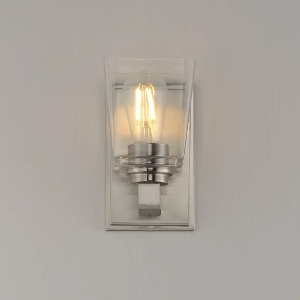 A composition of square forms that feature a Clear tapered square glass shade, these bath vanities provide a transitional design that suits both modern and traditional spaces. Available in Matte Black, Polished Chrome, Satin Nickel, and Natural Aged Brass.