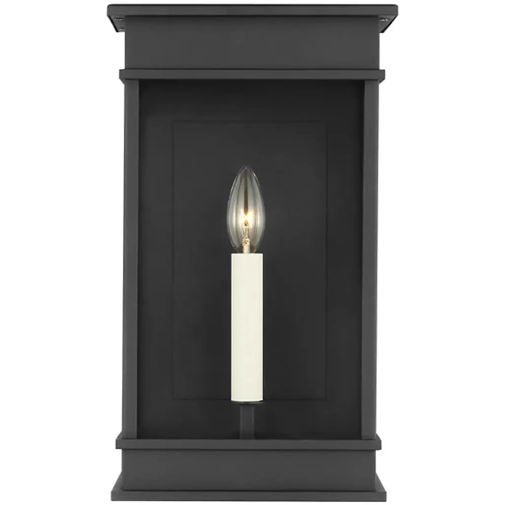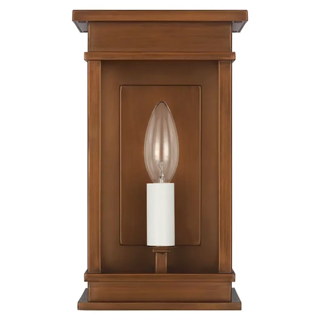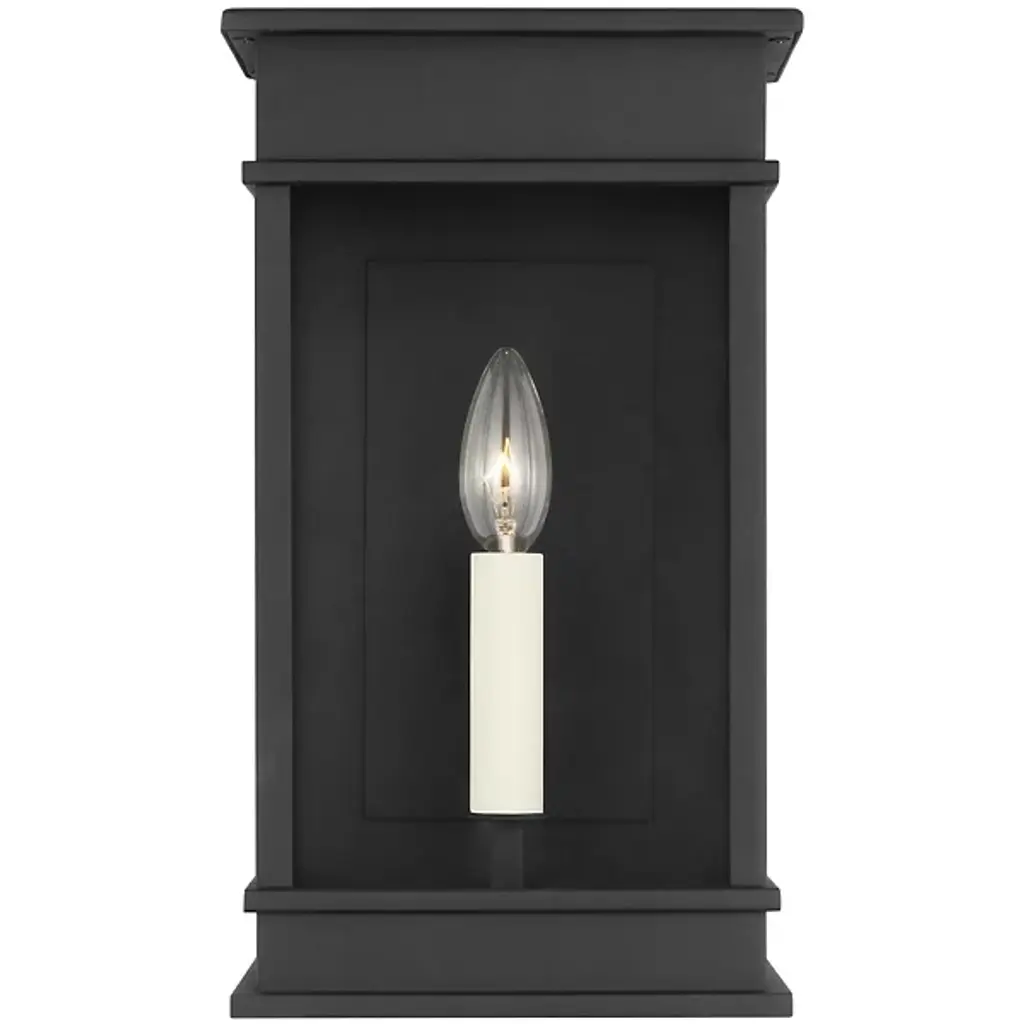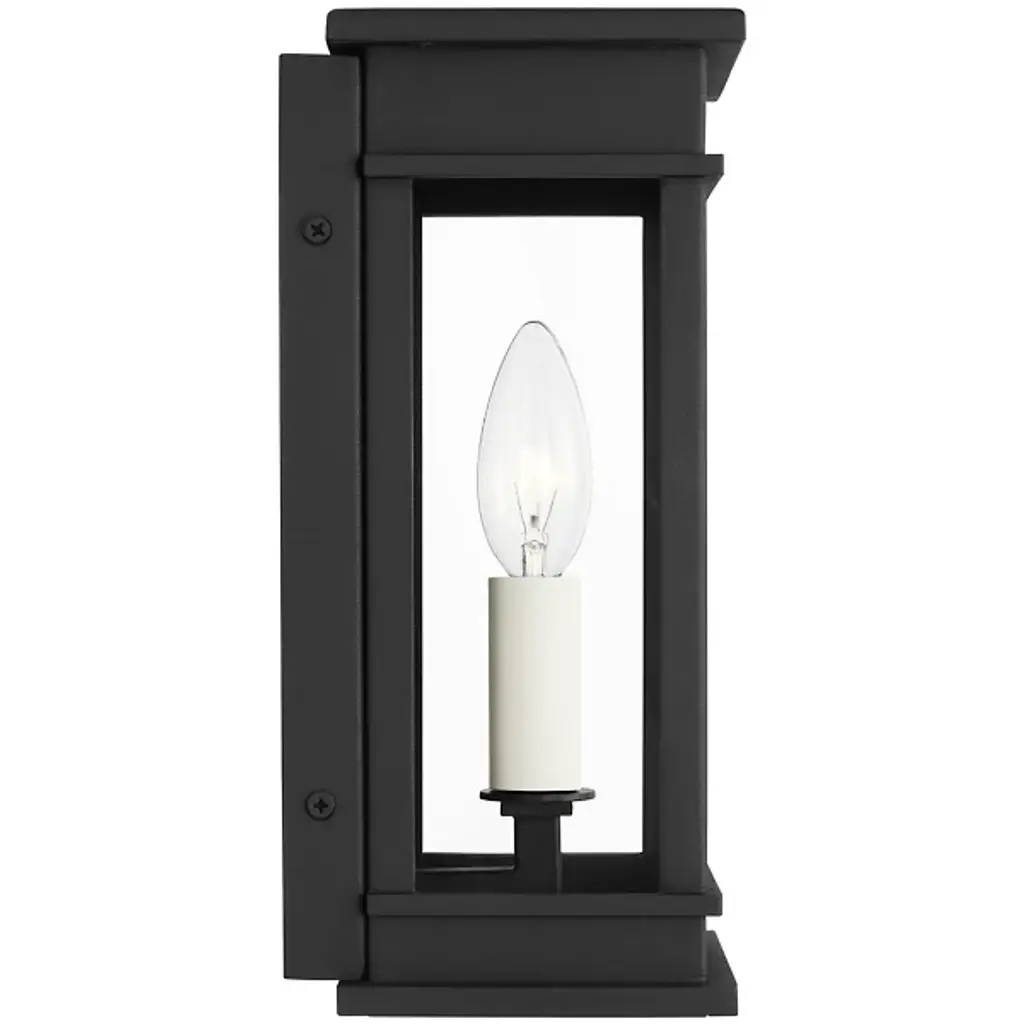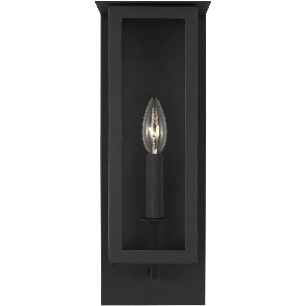 The Cupertino Outdoor Wall Sconce by Visual Comfort Studio brings a transitional style to your environment. The creative work of the Chapman & Myers design team, this light fixture adds a classic note to its surroundings. The steel framework of this sconce resembles a picture frame. The summit and base of this furnishment feature linear edges which slightly extend, giving the Cupertino its distinctive appearance. A flame-shaped LED glows from behind panes of clear glass.