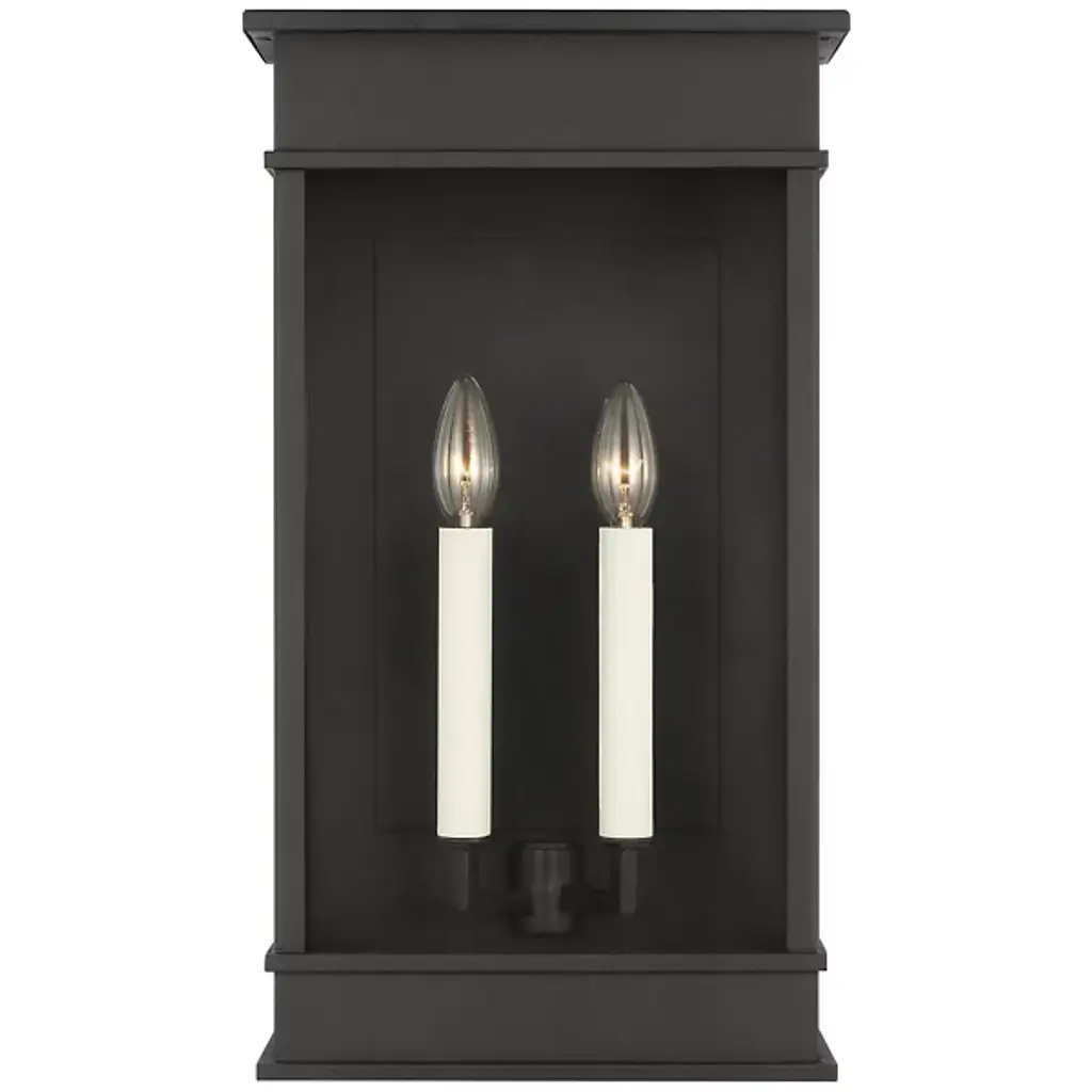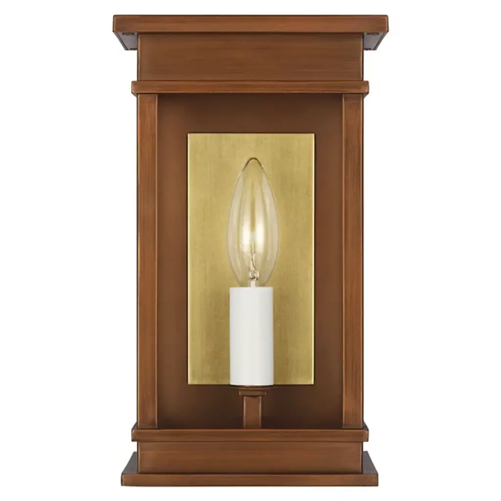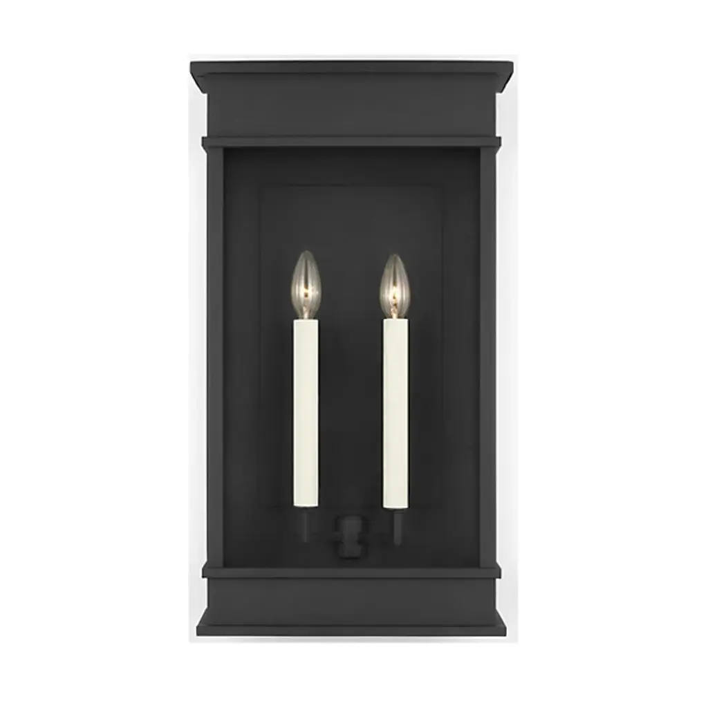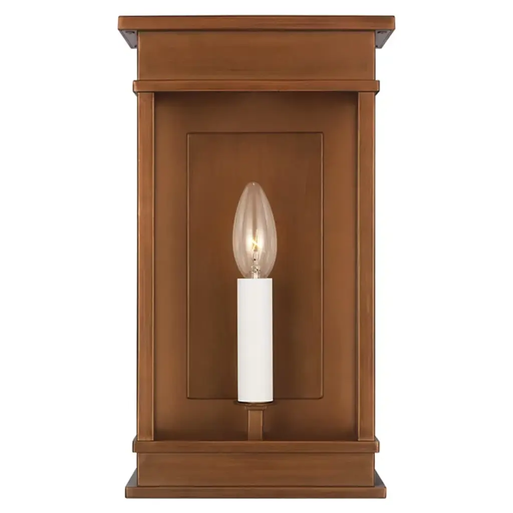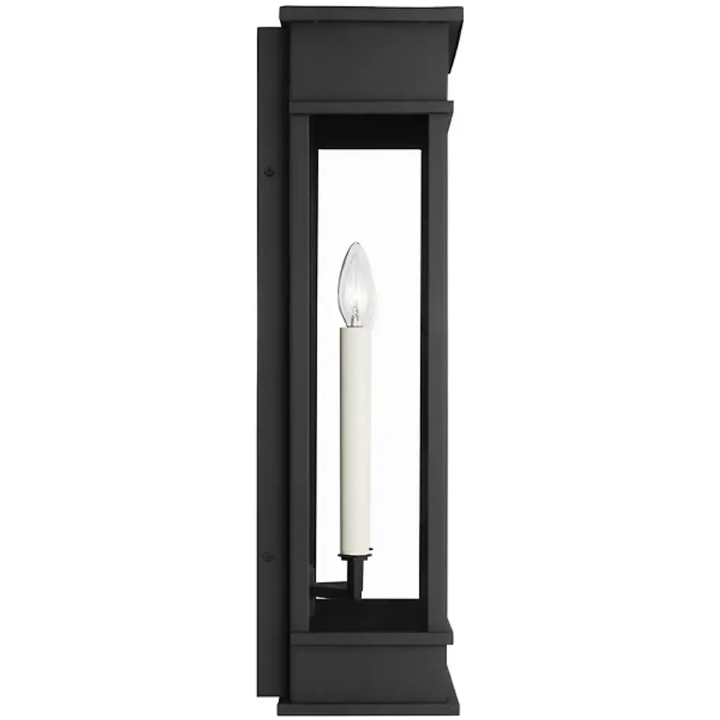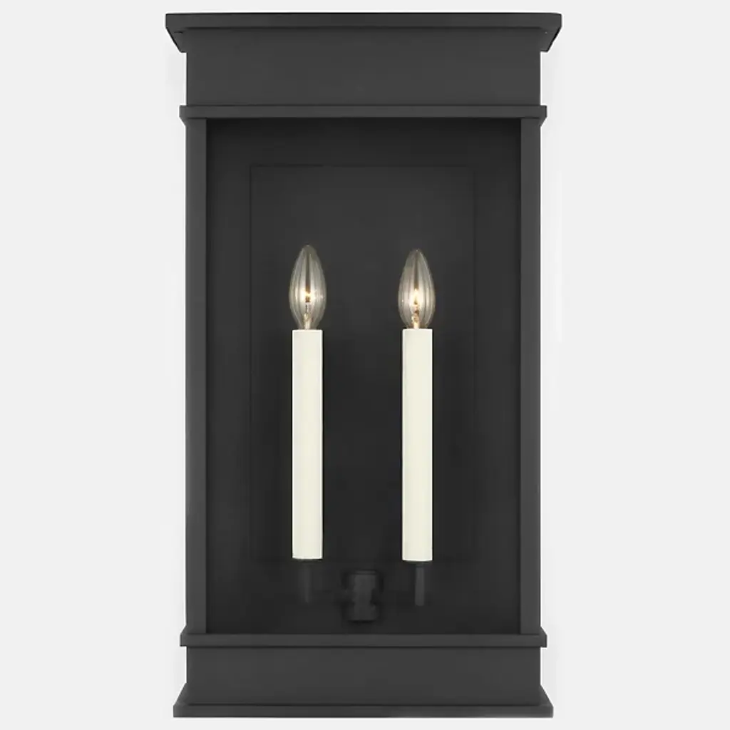 The Cupertino Outdoor Wall Sconce by Visual Comfort Studio brings a transitional style to your environment. The creative work of the Chapman & Myers design team, this light fixture adds a classic note to its surroundings. The steel framework of this sconce resembles a picture frame. The summit and base of this furnishment feature linear edges which slightly extend, giving the Cupertino its distinctive appearance. A flame-shaped LED glows from behind panes of clear glass.