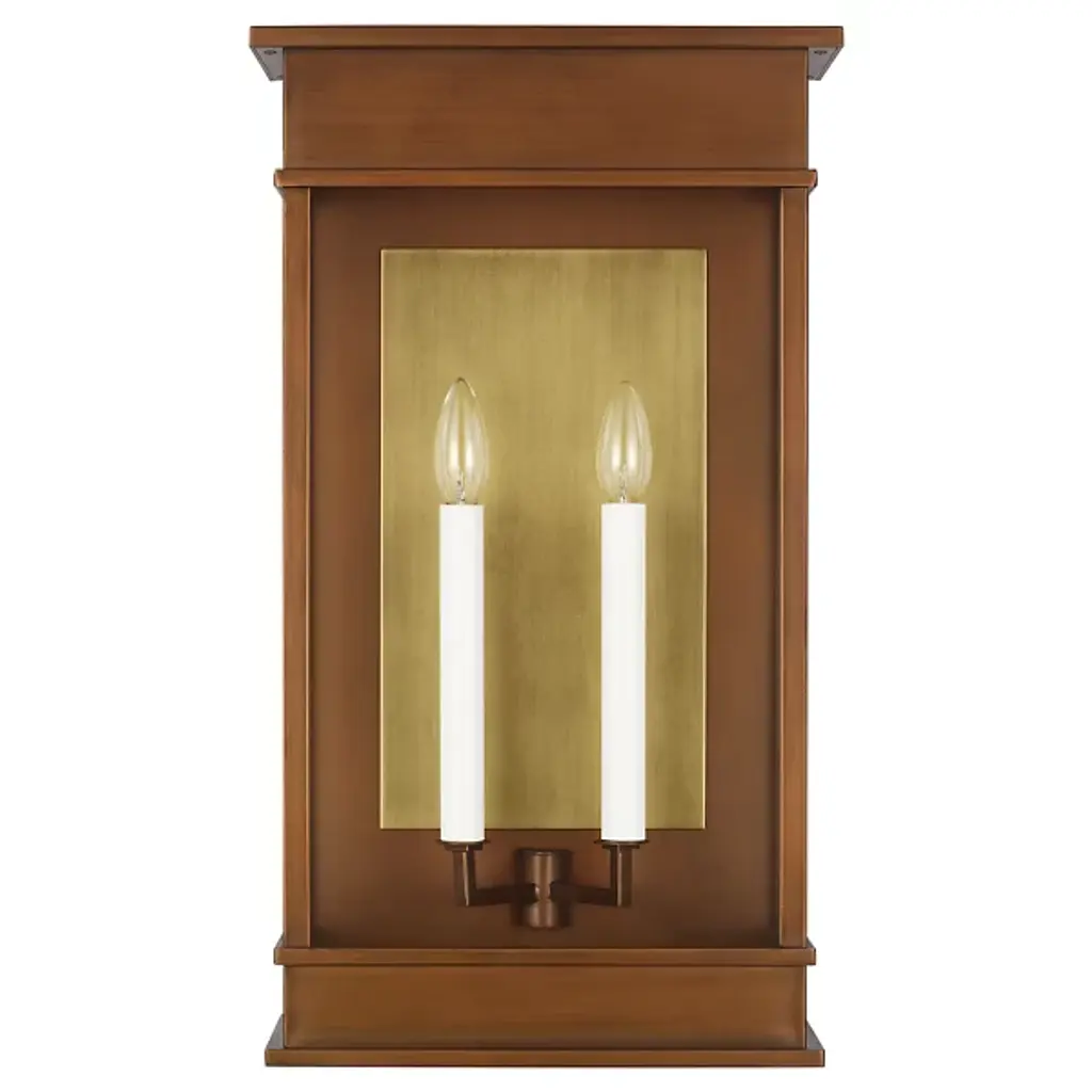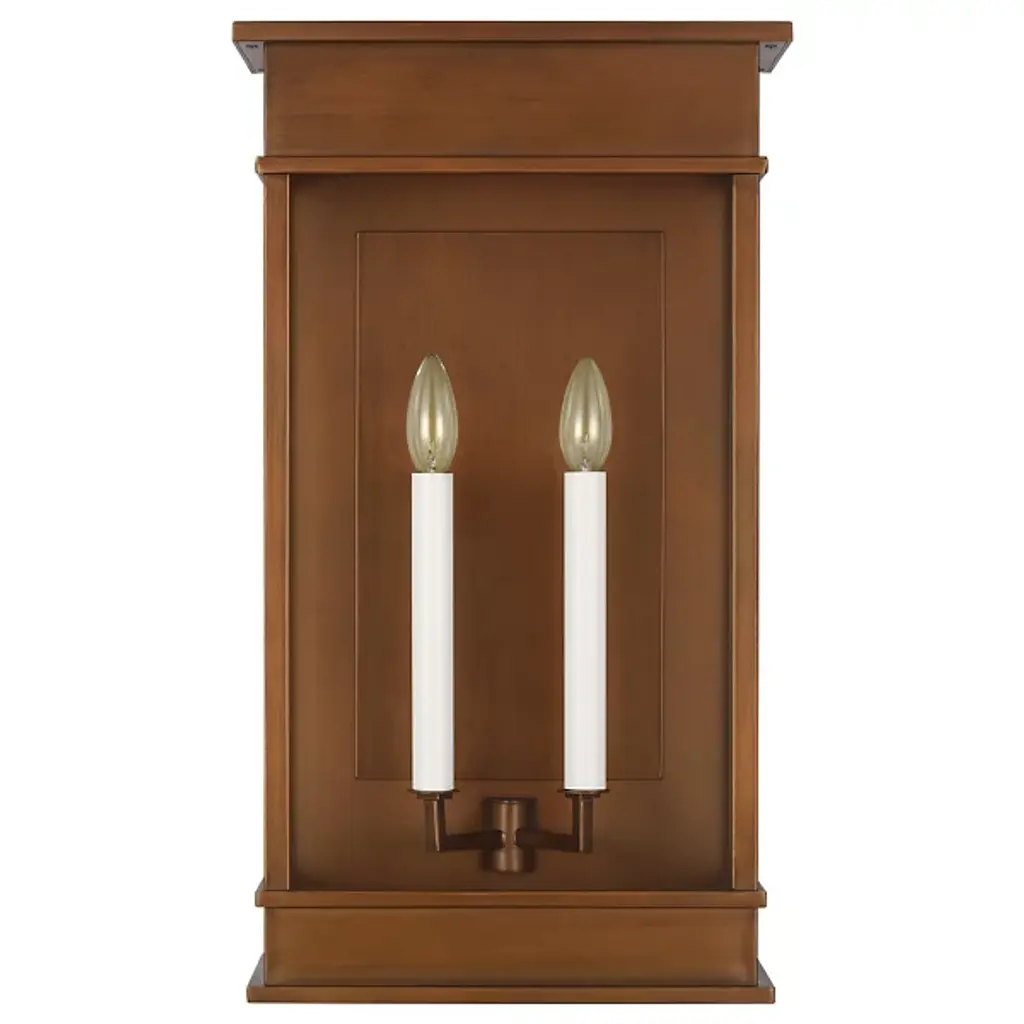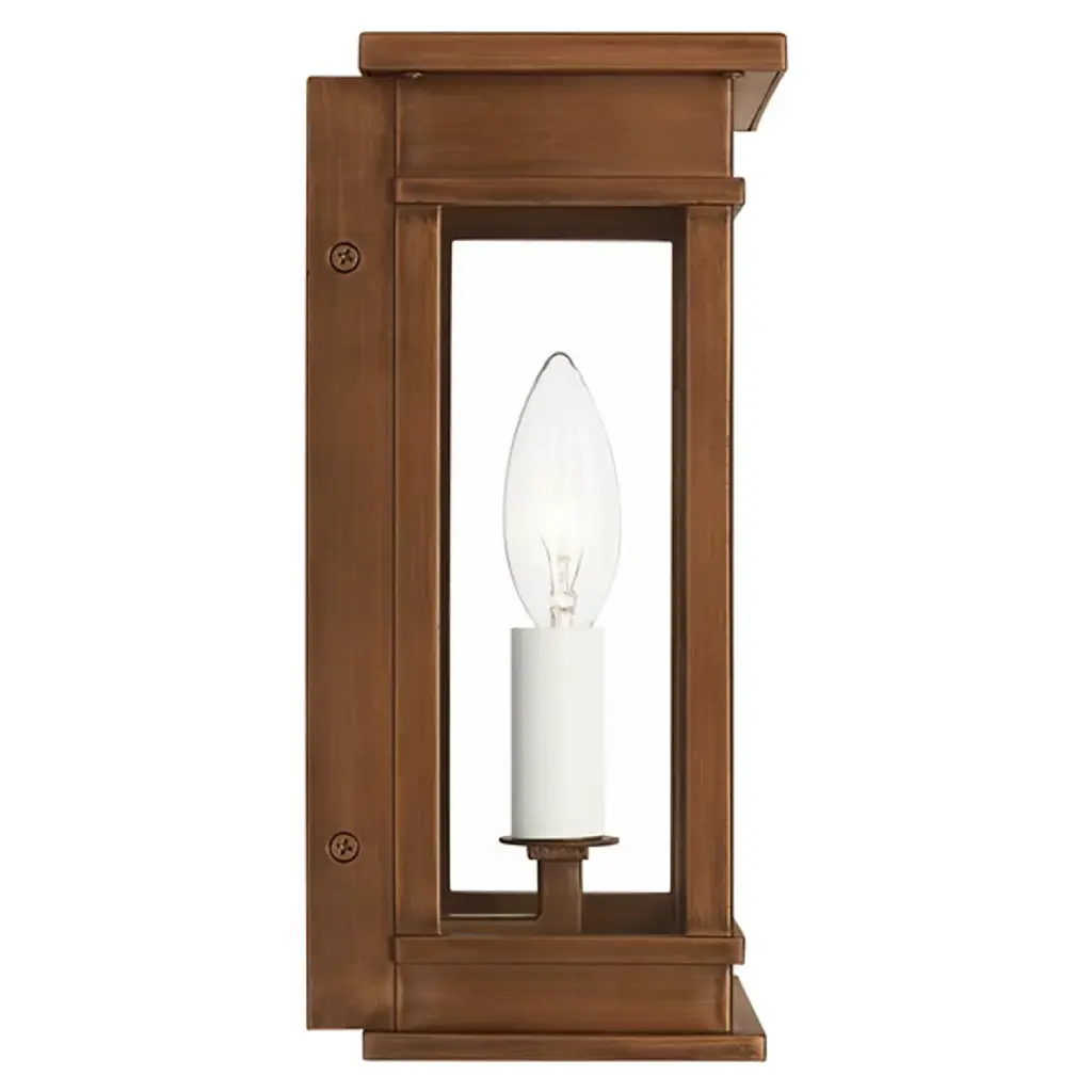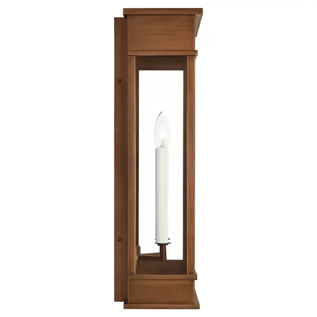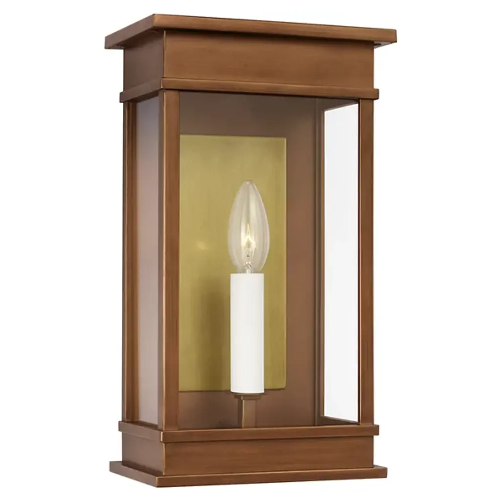 The Cupertino Outdoor Wall Sconce by Visual Comfort Studio brings a transitional style to your environment. The creative work of the Chapman & Myers design team, this light fixture adds a classic note to its surroundings. The steel framework of this sconce resembles a picture frame. The summit and base of this furnishment feature linear edges which slightly extend, giving the Cupertino its distinctive appearance. A flame-shaped LED glows from behind panes of clear glass.