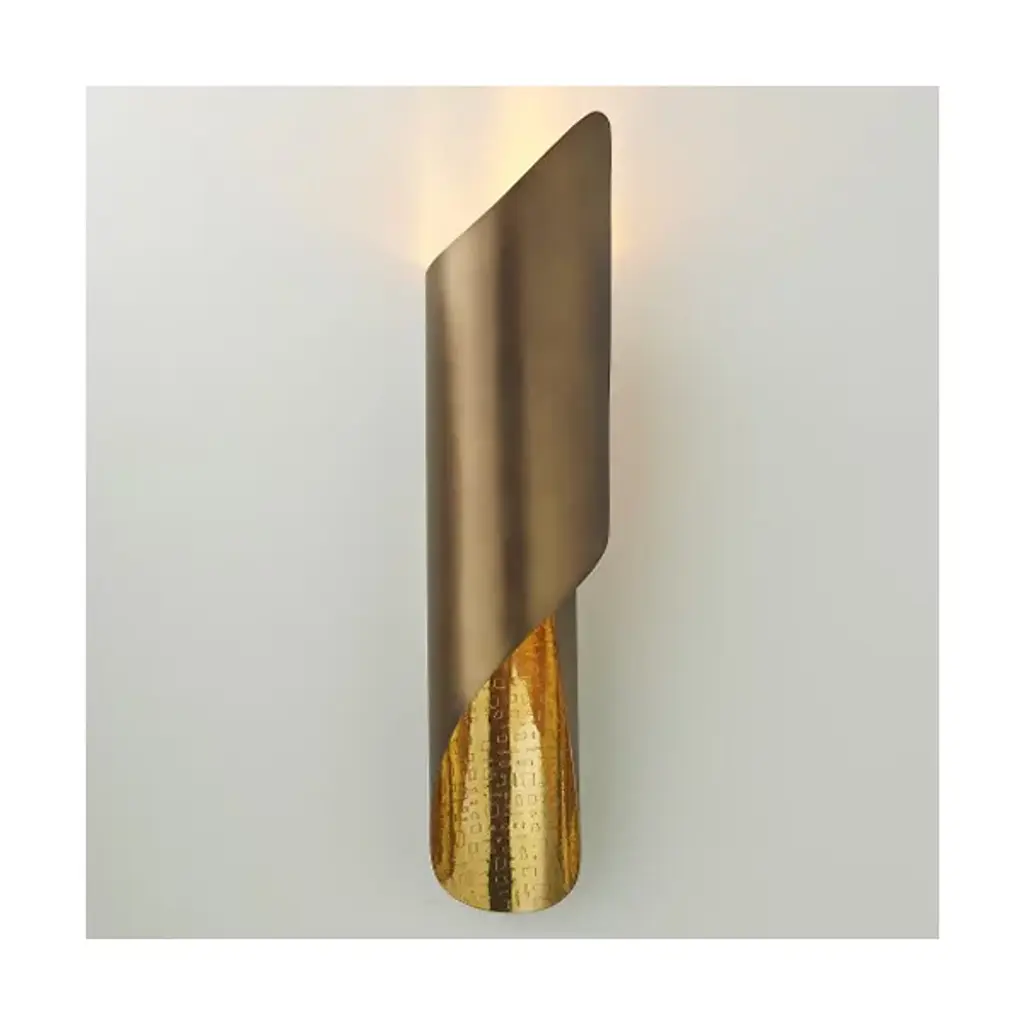 Striking tubular sophistication. The Curl Wall Sconce by Global Views showcases a steel sheet metal shade wrapped in a tubular shape, exposing its textured interior that reflects light in a luxurious manner. It also comes in more than one finish, with each boasting its own distinctive upscale shimmer to coordinate with your established décor scheme. Install this sconce in a hallway or large foyer and a heightened sense of welcome and elegance will emerge.