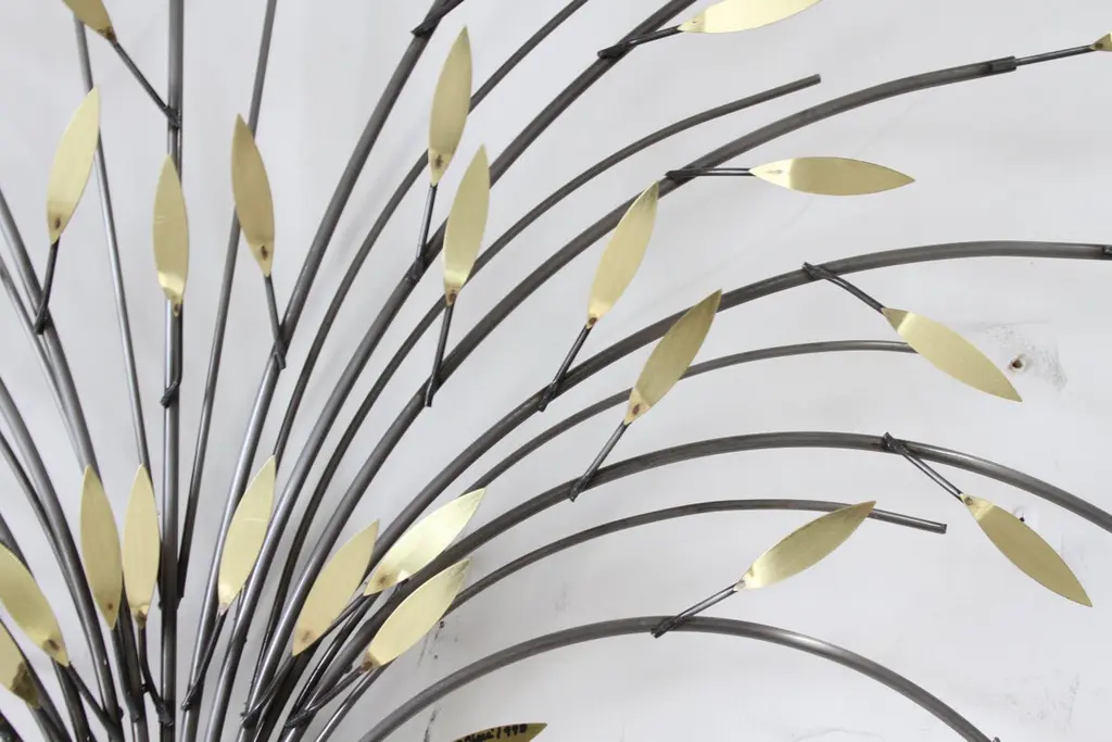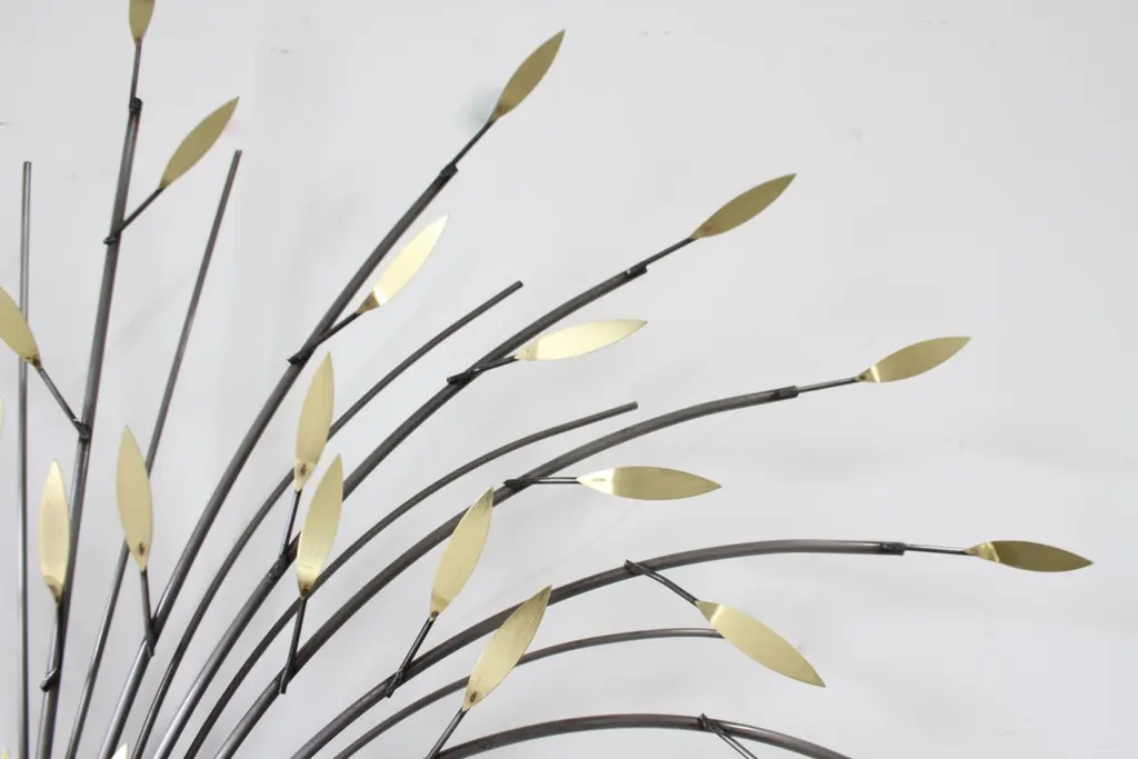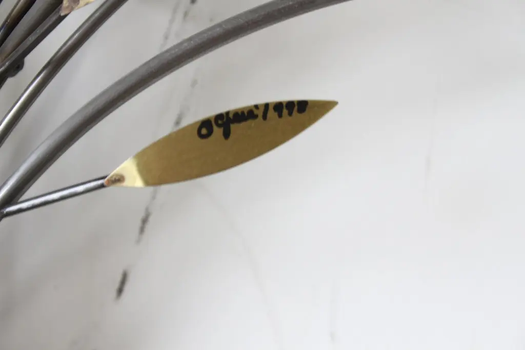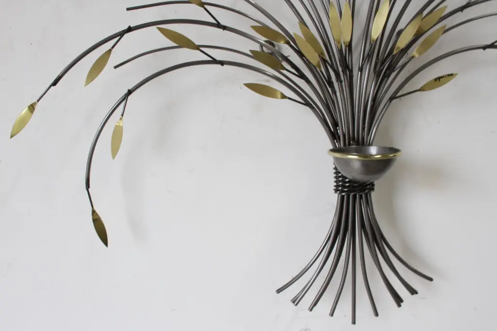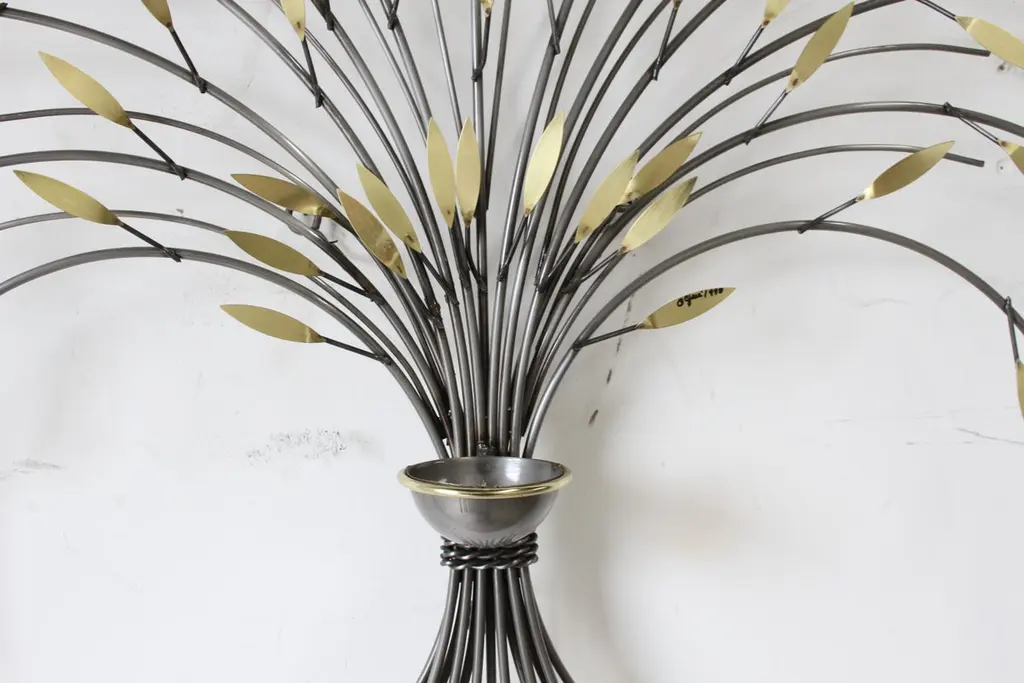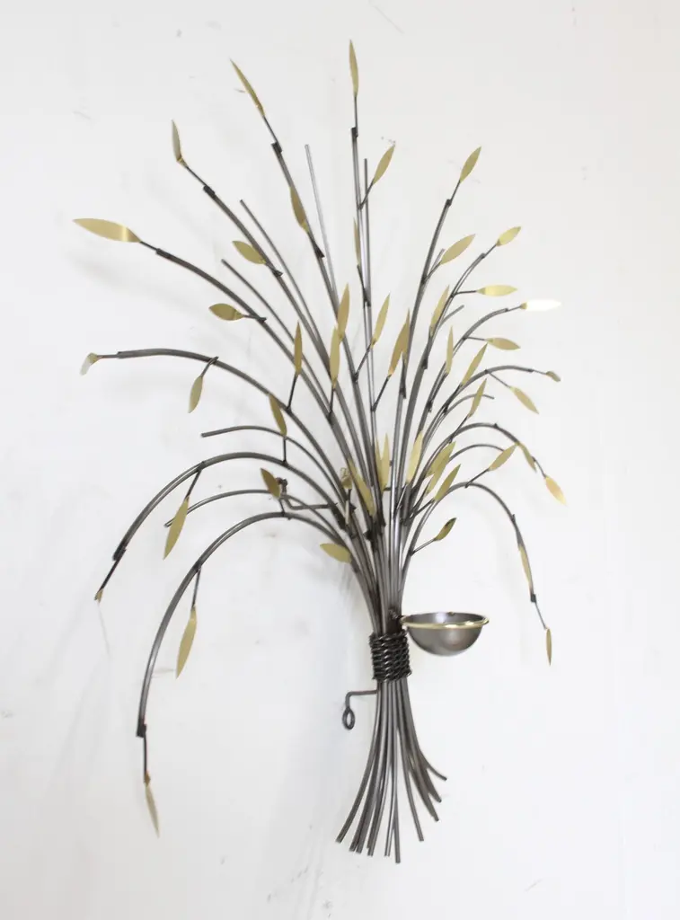 C. Jeré wall candleholder sconce sculpture in the form of a tree or sheaf of wheat, made of brass and steel. I have three of these, so you can use as a pair or singles. Two of the three are signed C. Jeré 1998 on a leaf. In very nice condition. The candleholders, takes a 2" candle.