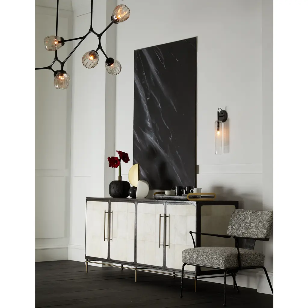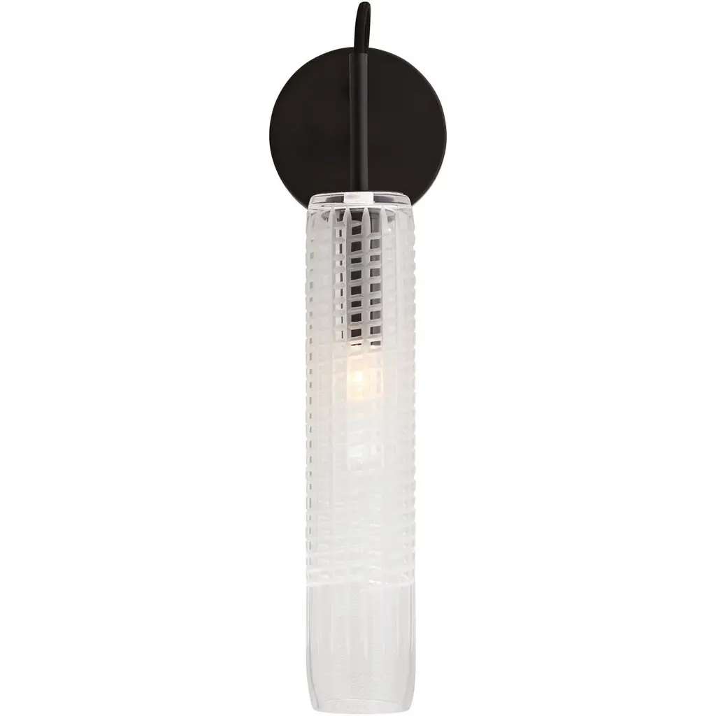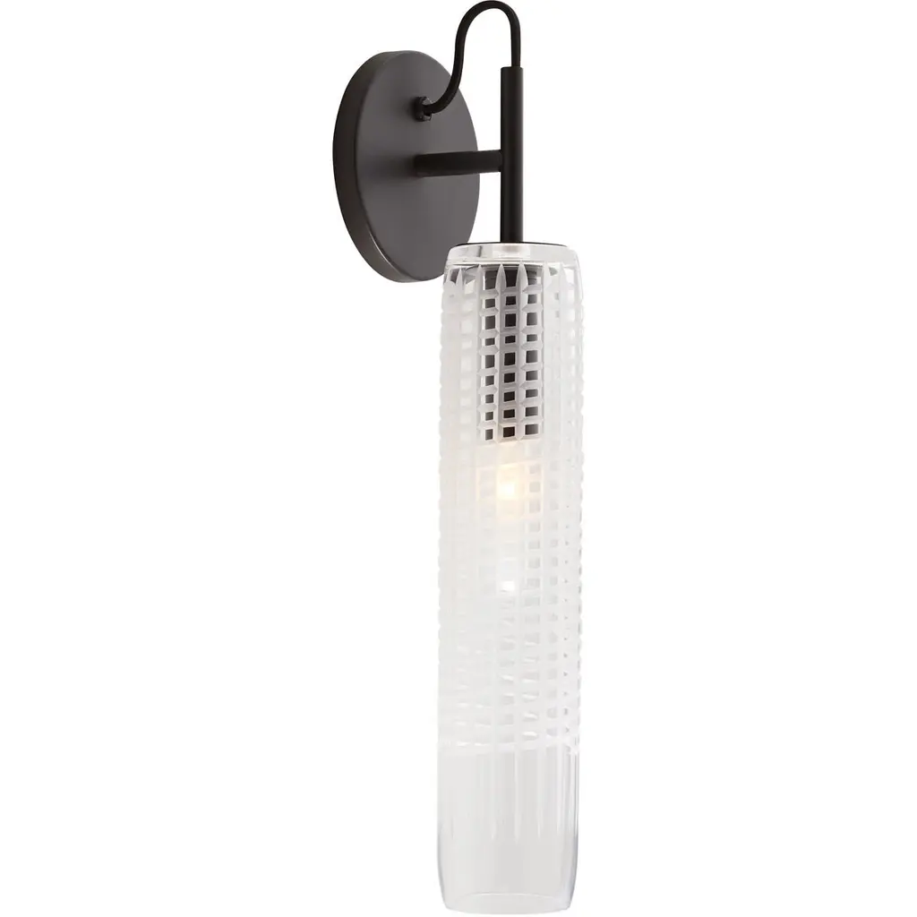 The Cut Tall Sconce is a study in circular and cylindrical forms. The Sconce's clear etched-glass shade is reminiscent of cut crystal, offering a contemporary twist on a timeless technique. The long, narrow shade's deeply grooved texture casts beautifully patterned light and shadow. With a focus on material connections, the Sconce's cylindrical glass shade cuffs its blackened steel top, which is suspended from a metal armature, with a draped black cloth cord detail.