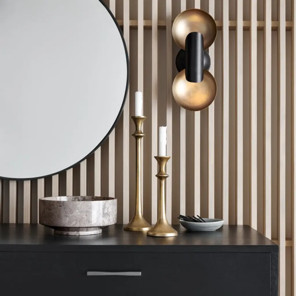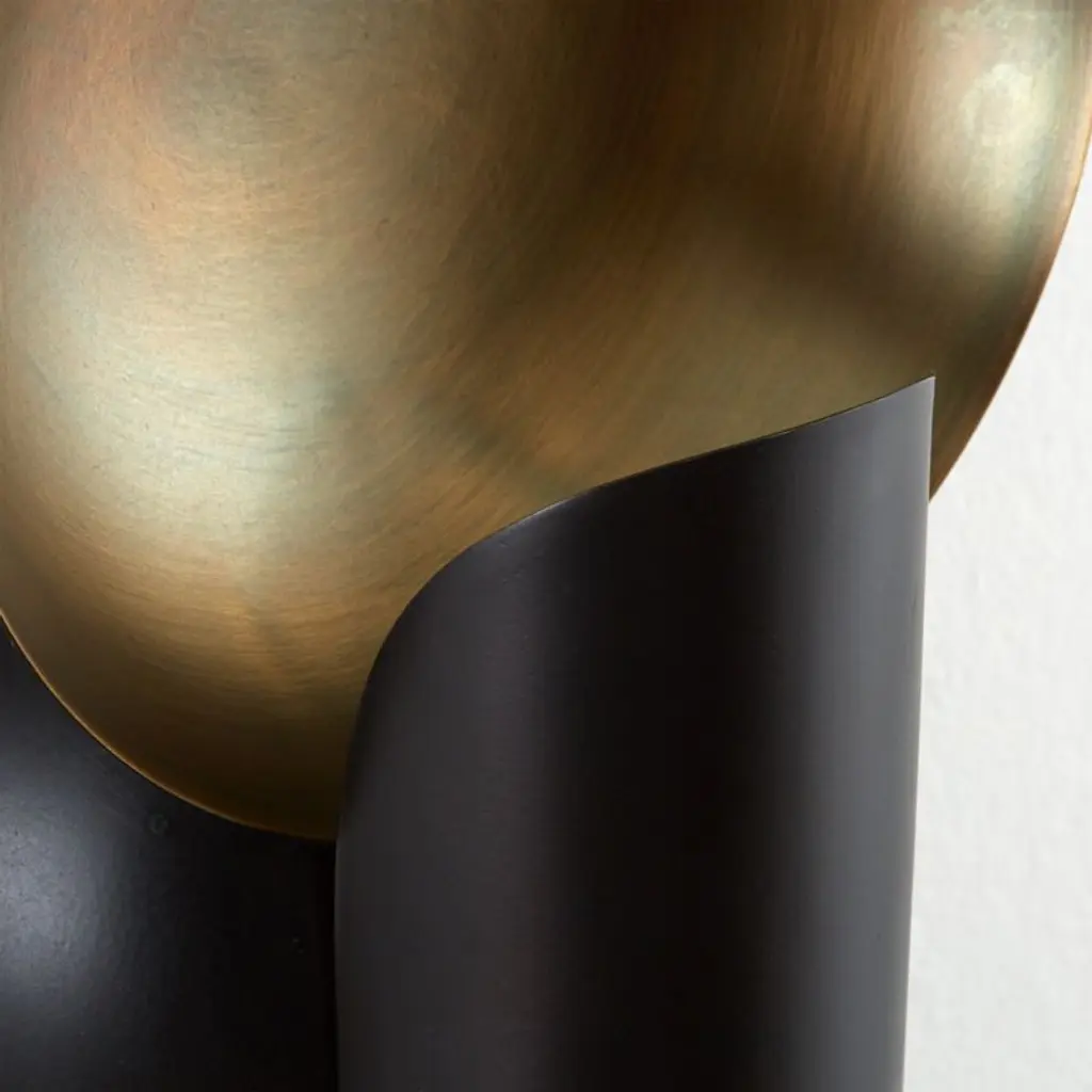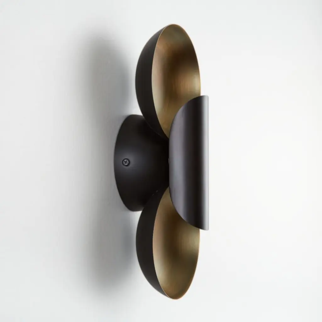 Cyril updates the classic candle reflector sconce for modern decor. Finished in black and antique brass shallow disc-like bowls reflect the light from LED bulbs concealed in the black cylindrical "candle." The result is a soft golden glow that instantly creates a warm atmosphere. Ideal for hallways and other narrow spaces, the wall light hangs horizontally or vertically. Artisans press, spin, cut and weld our exclusive Cyril decorative sconce by hand.