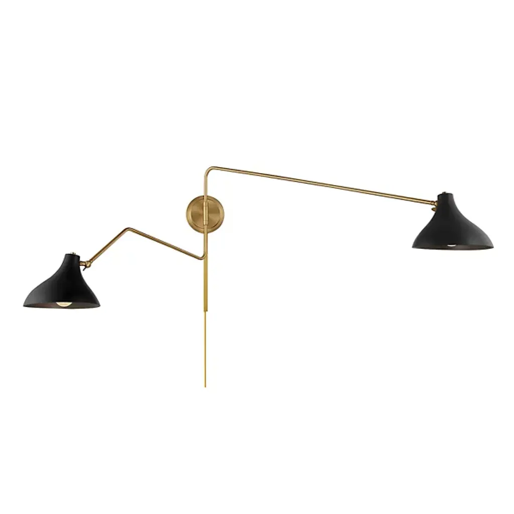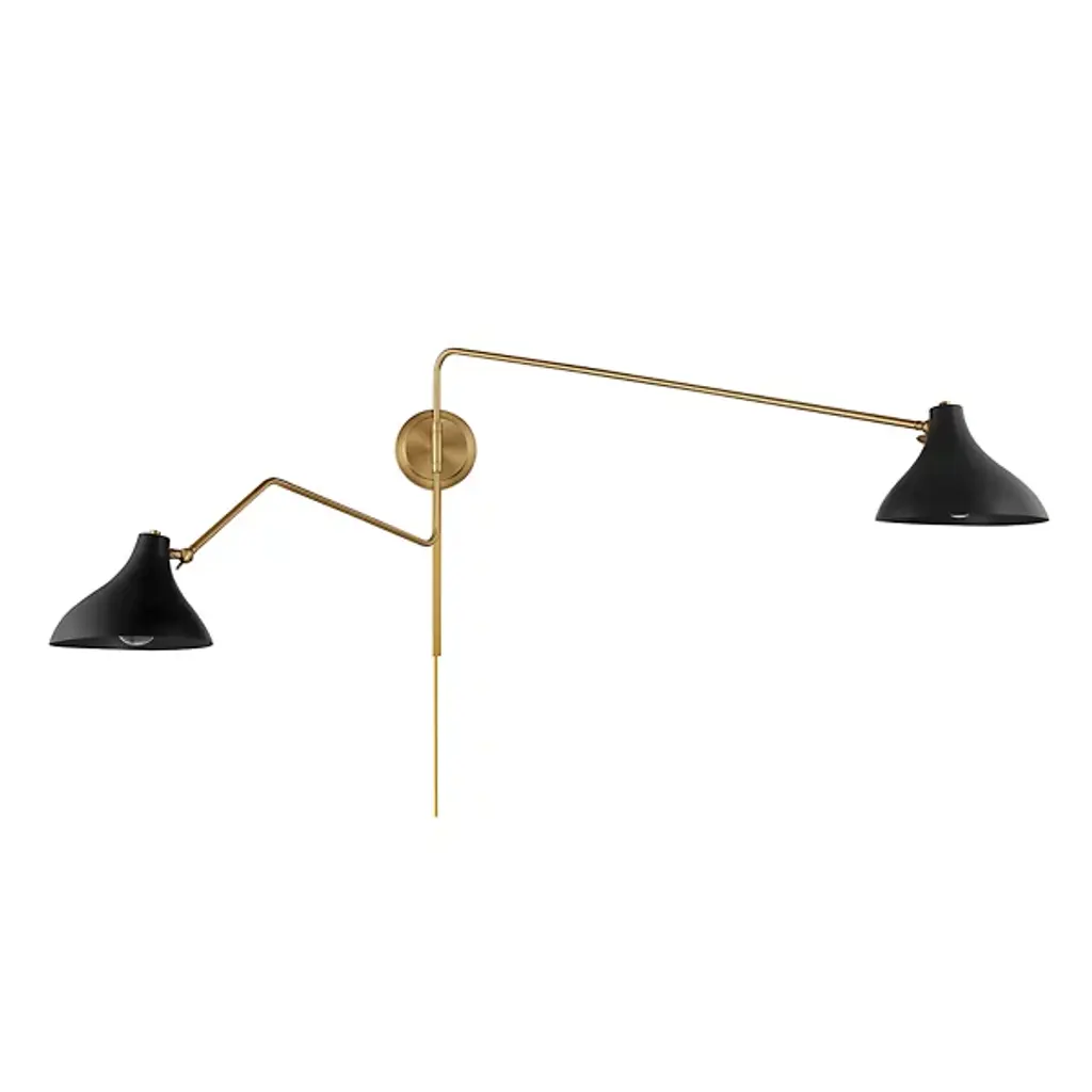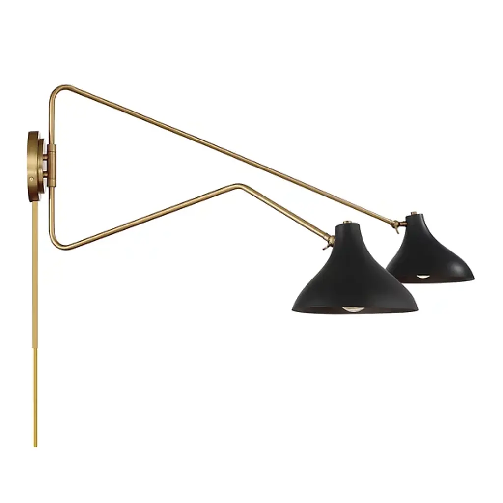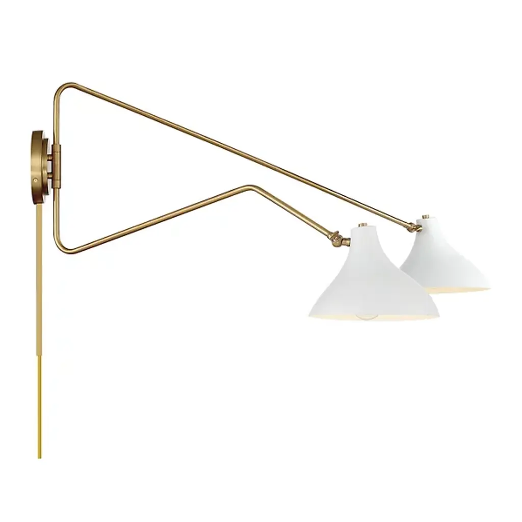 The Cyril Wall Sconce from Alder & Ore is an adjustable 2-light design with curving vintage-styled shades on long, tubular arms, with a stylish pairing of finishes. This transitional piece offers versatility with its scoop-shaped vintage shades and the option to install as either a plug-in or hardwired fixture, keeping a simple setup at the forefront. Its strong metal construction and damp rating blend classic charm with modern functionality, mixing poseable task lighting with reflected radiance.
