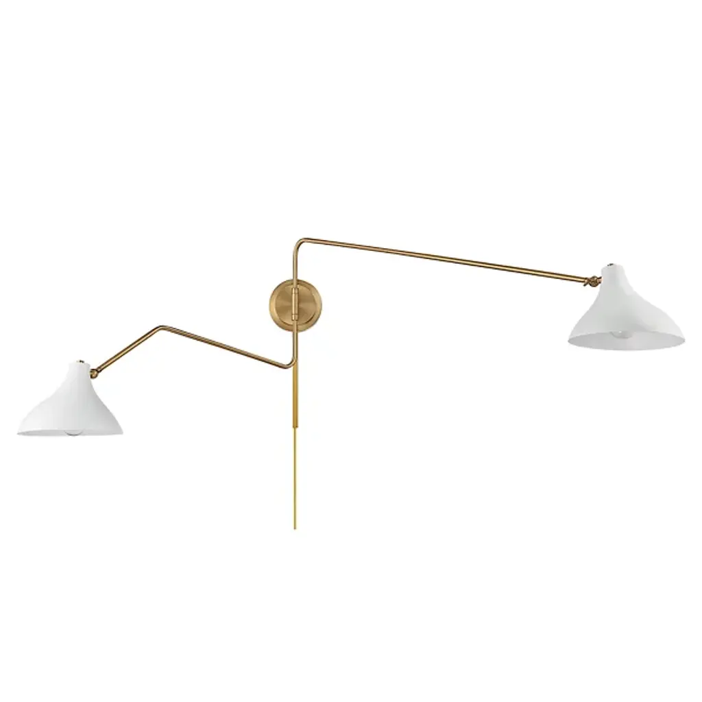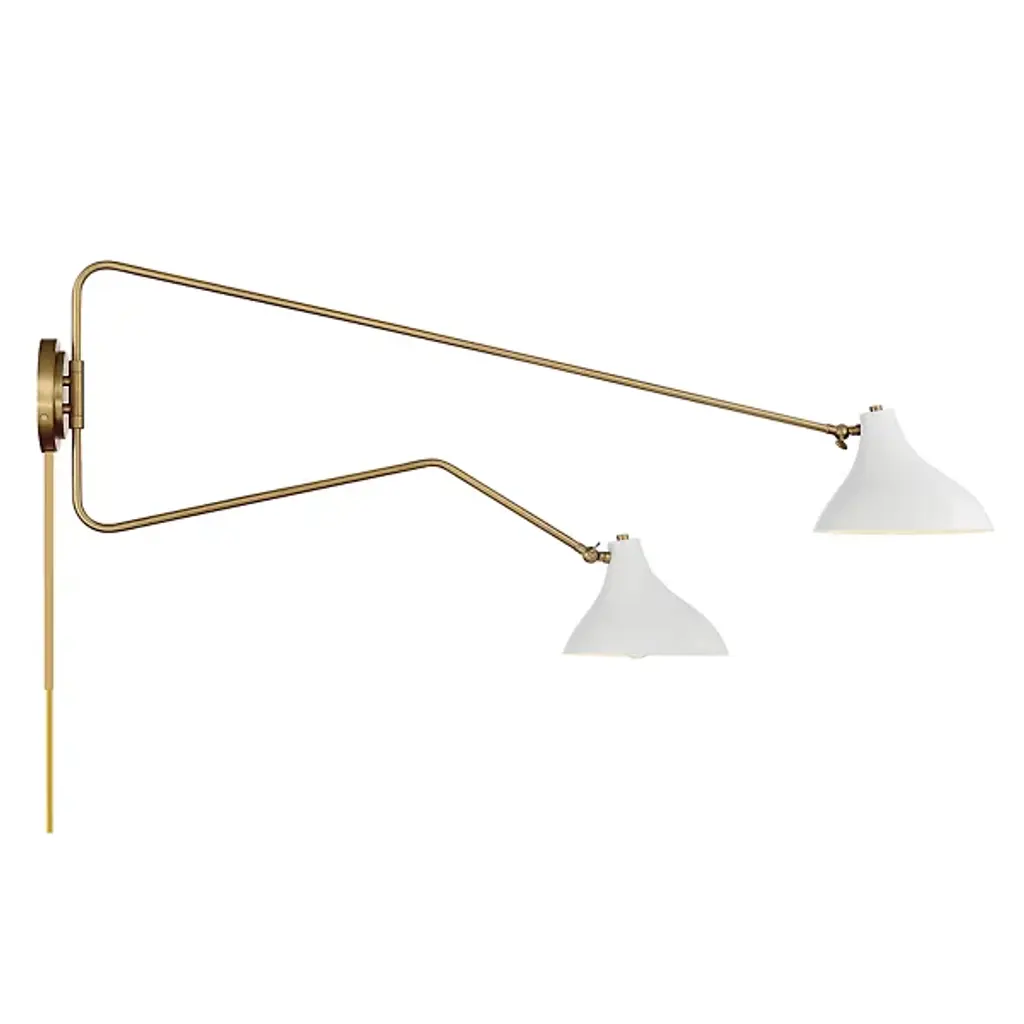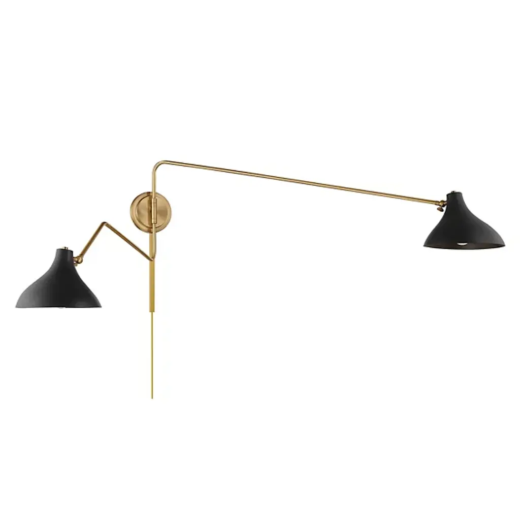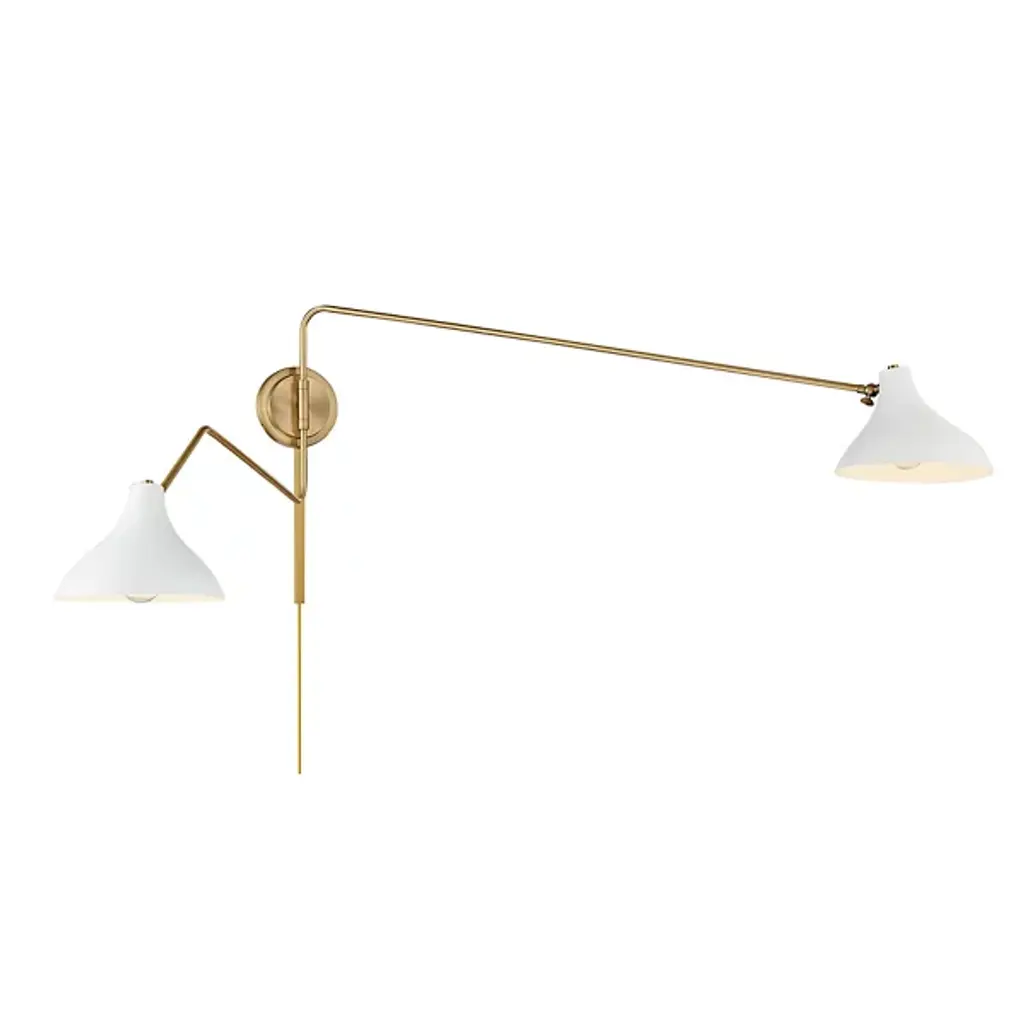 The Cyril Wall Sconce from Alder & Ore is an adjustable 2-light design with curving vintage-styled shades on long, tubular arms, with a stylish pairing of finishes. This transitional piece offers versatility with its scoop-shaped vintage shades and the option to install as either a plug-in or hardwired fixture, keeping a simple setup at the forefront. Its strong metal construction and damp rating blend classic charm with modern functionality, mixing poseable task lighting with reflected radiance.