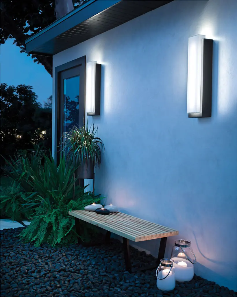 This large LED outdoor wall light from the Dahlia collection features a sophisticated, crisp edge. The interior of its white, fish tank glass produces a clean light.
