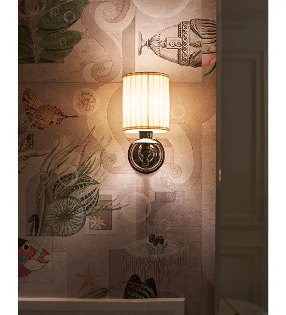 An elegant wall lamp with lampshade in plissé fabric and brass rounded arm inspired by the twentieth-century.