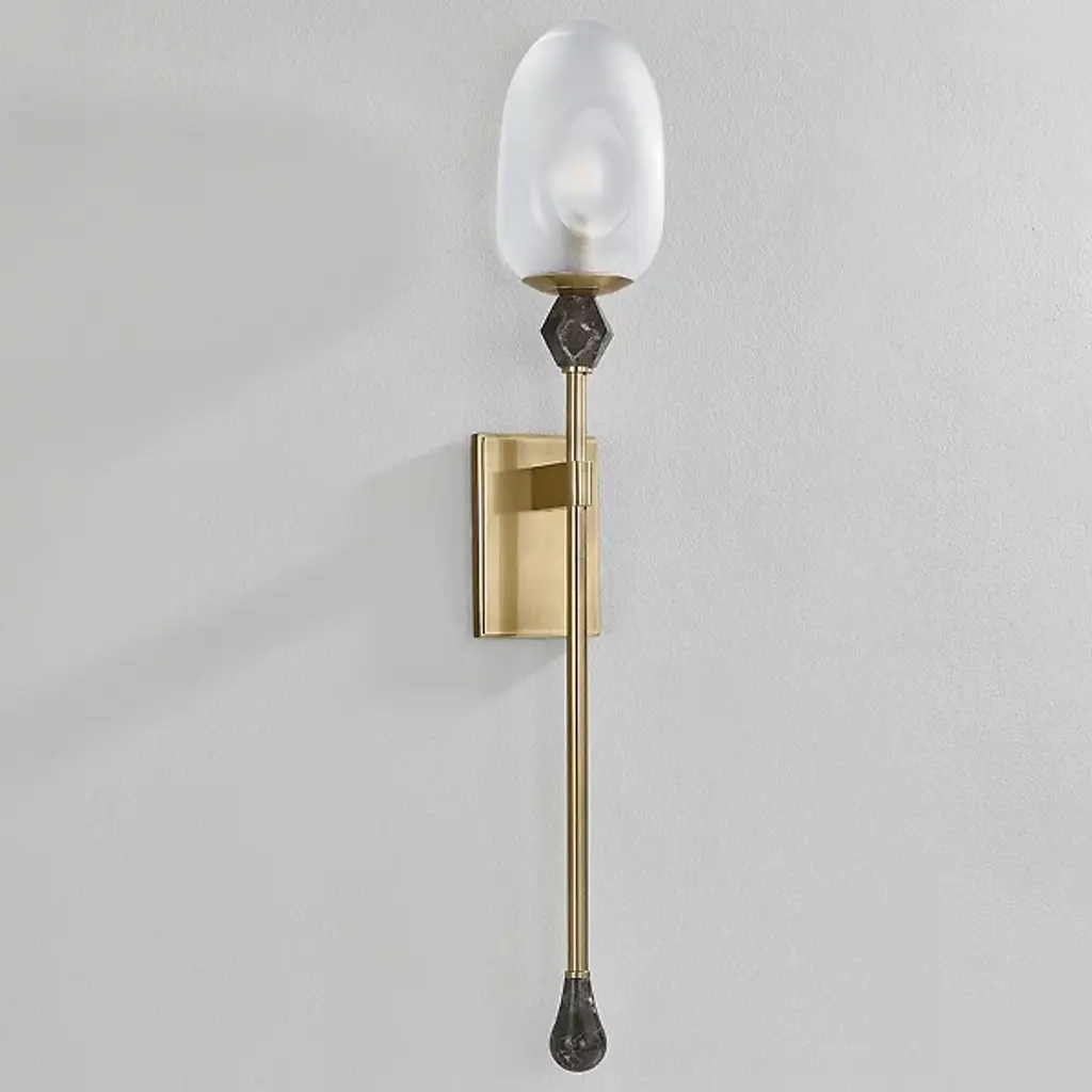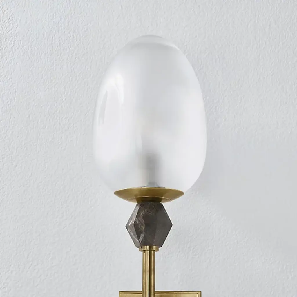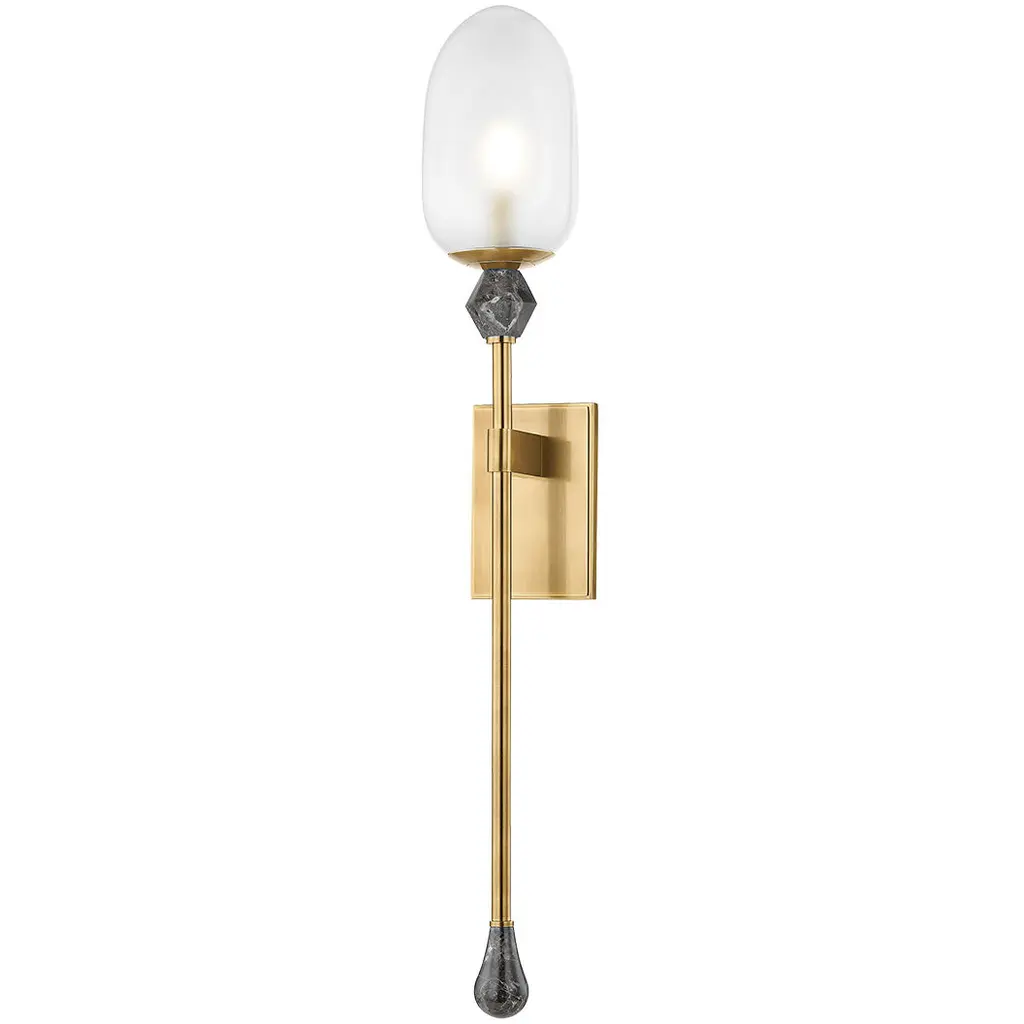 The Daith Wall Sconce from Corbett Lighting is a sculptural masterpiece featuring a rounded glass shade secured from a stepped rectangular wall plate canopy and a horizontal bar. This elegant arrangement creates a graceful metal structure that securely holds robust lamping. Inspired by the 'sugarloaf' gemstone cut, the fixture's rounded shades are crafted from thick, clear, etched glass and contrast with a Vintage Brass finish. Damp-listed and gloriously warm, this lamp contrasts its delicate appeal with practicality, matching vintage style with contemporary elegance to offer a captivating blend of aesthetic allure and striking sophistication.