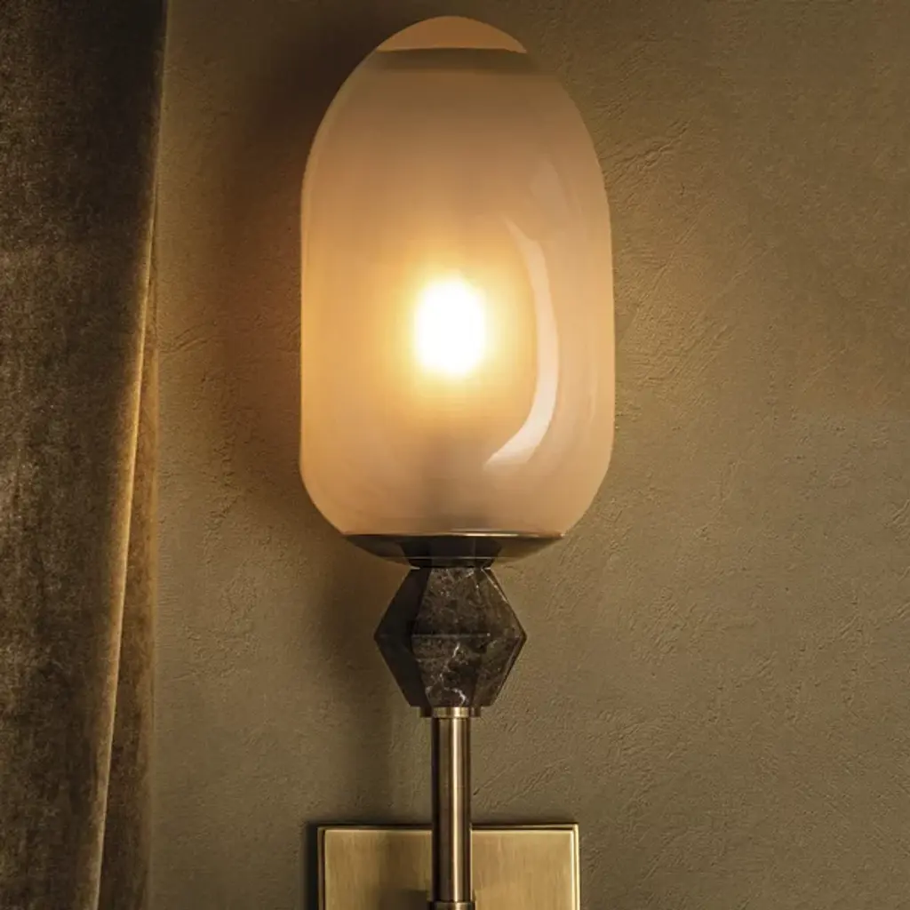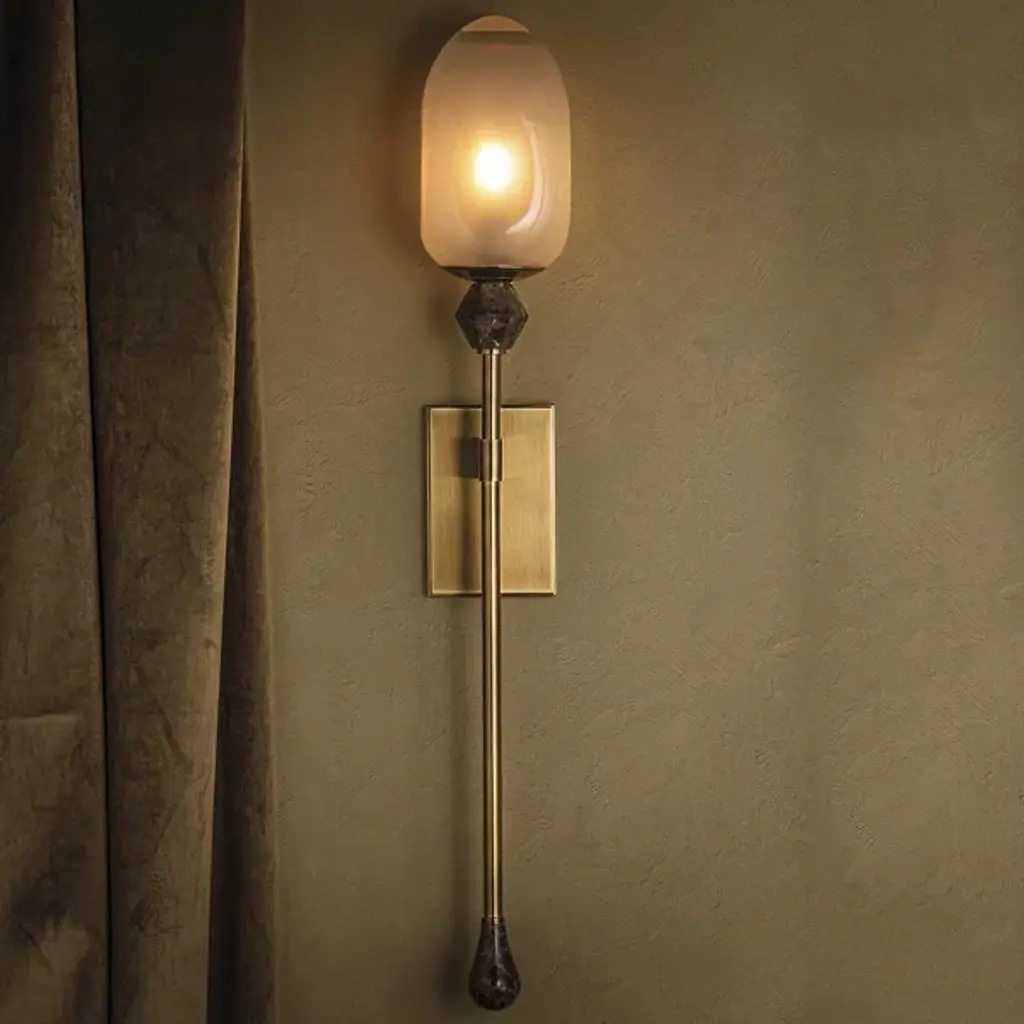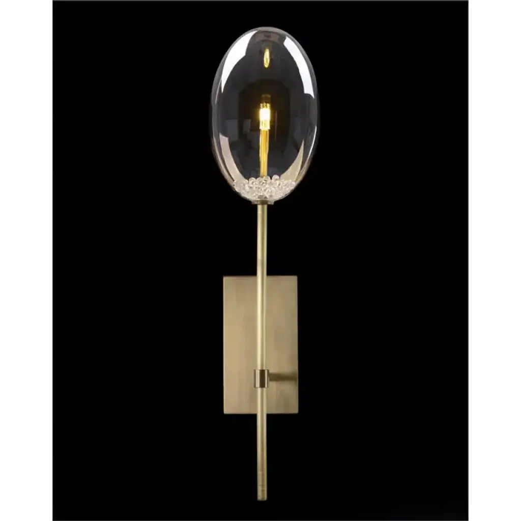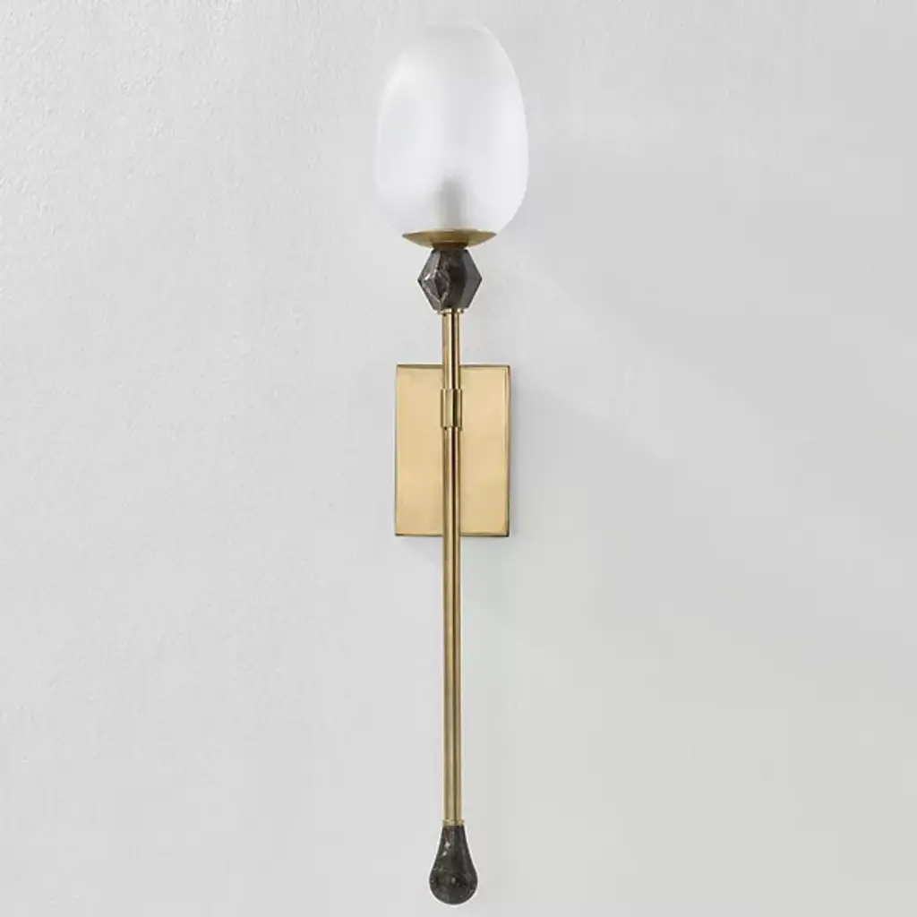 The Daith Wall Sconce from Corbett Lighting is a sculptural masterpiece featuring a rounded glass shade secured from a stepped rectangular wall plate canopy and a horizontal bar. This elegant arrangement creates a graceful metal structure that securely holds robust lamping. Inspired by the 'sugarloaf' gemstone cut, the fixture's rounded shades are crafted from thick, clear, etched glass and contrast with a Vintage Brass finish. Damp-listed and gloriously warm, this lamp contrasts its delicate appeal with practicality, matching vintage style with contemporary elegance to offer a captivating blend of aesthetic allure and striking sophistication.