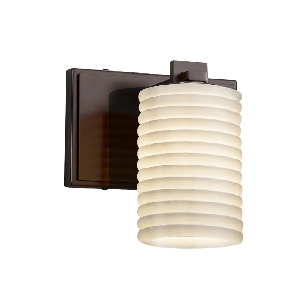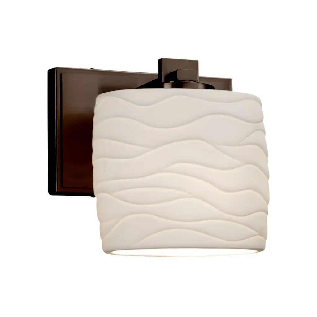 Limoges - Dakota Wall Sconce - Cylinder with Flat Rim - Dark Bronze Finish with Waves Shade - IncandescentThe Limoges Collection offers translucent porcelain lighting with a contemporary flair. Classic in design, these exquisite fixtures are notable for the delicate "Impressions" embossed into fine porcelain shades.Features:Shade Shape: Cylinder with Flat Rim (-10)Location Rating: DampUL CertifiedSpecifications:Wattage: 60Bulb Type: IncandescentVoltage: 120Bulb Shape: G16 1/2Bulb Included: NoBulb Count: 1
