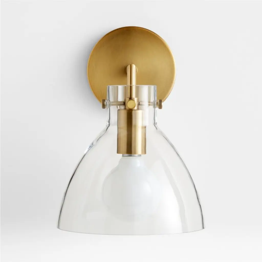 Detailed with oversized knurled screws, our Dakota sconce balances clean modernity with subtle industrial beauty. The result is a timeless wall light with a straightforward presence above a buffet, flanking a bathroom mirror or lining a hallway. Hand-blown by talented artisans, the small clear glass shade shapes a smartly tapered dome that shows off the gleaming brass fixture and your choice of bulb. Our exclusive mix-and-match Dakota collection offers versatile lighting options with a custom feel.