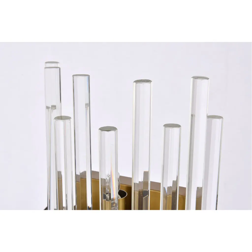 This stately fixture combines timeless elegance with modern and attractive sophistication. The delicate juxtaposition of upright and hanging clear glass rods creates a truly stunning visual statement, seamlessly woven together within a sleek gold frame. This expressive piece would be a welcomed and treasured addition to a wide range of contemporary residential styles.