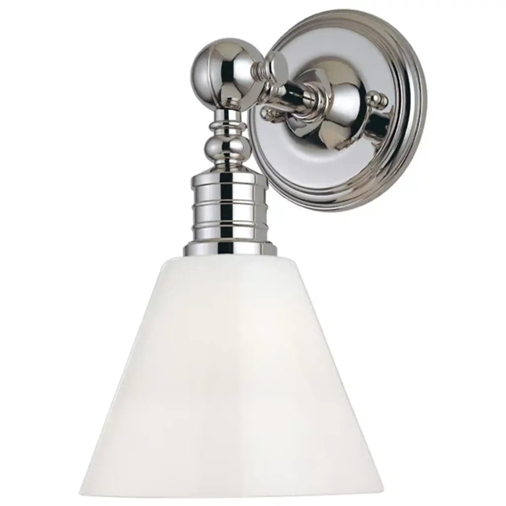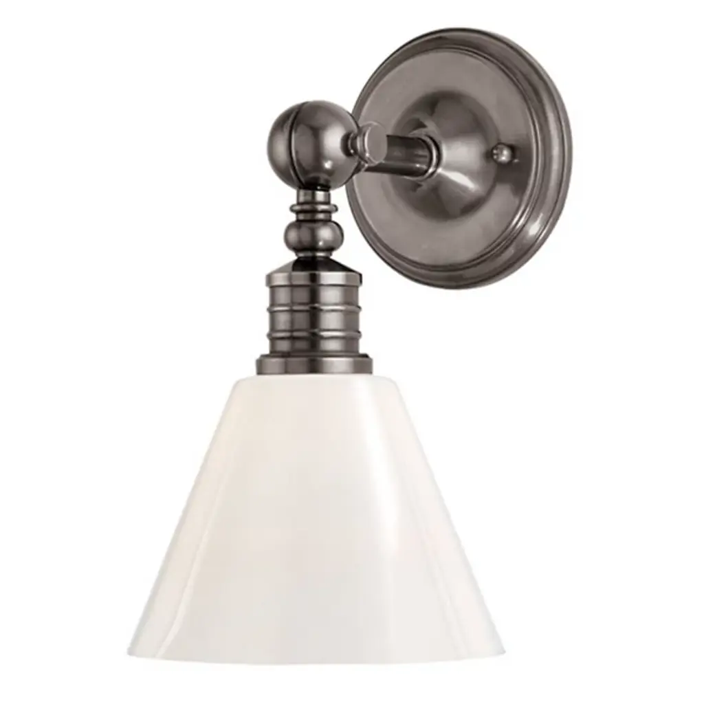 The Hudson Valley Darien Wall Sconce offers charming character to the American Traditional home. A uniquely designed piece, the Darien Wall Sconce features a cone-shaped White glass shade accented by one of three classic finishes: Distressed Bronze, antiqued Historic Nickel, or shiny Polished Nickel.