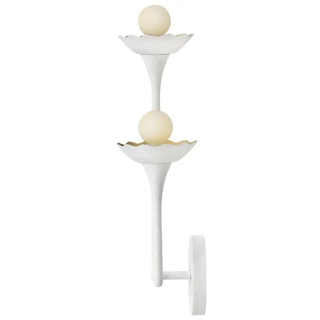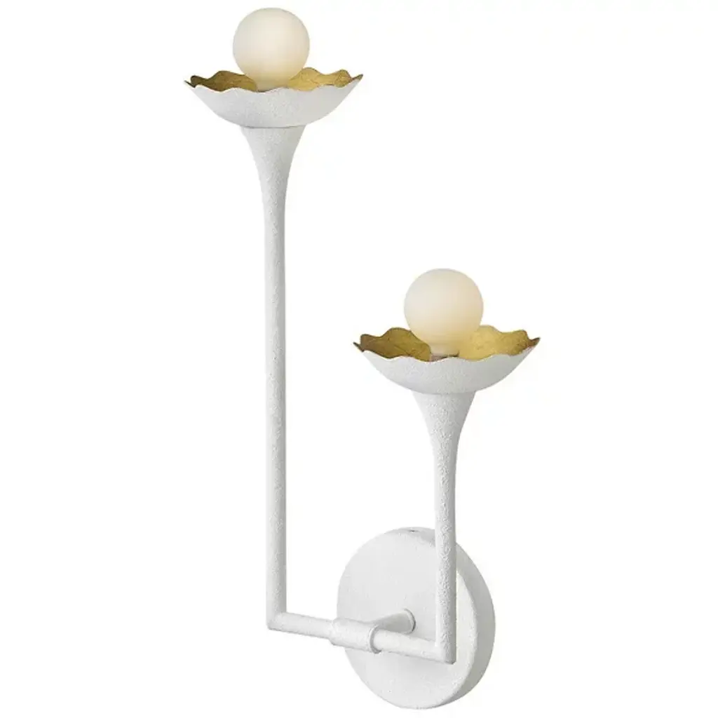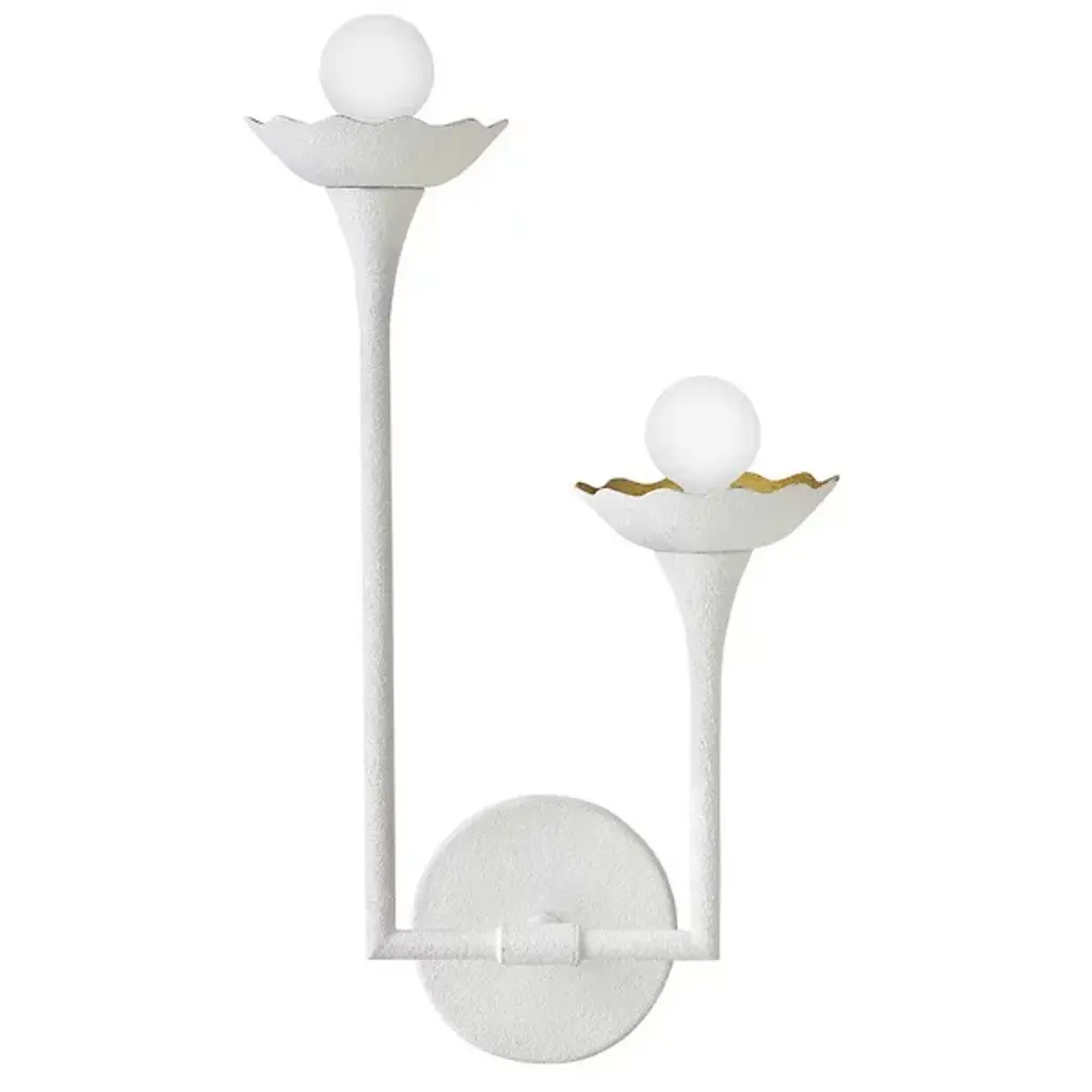 The Darla 2-Light Wall Sconce from Lark presents a botanical profile with dual flower-inspired lights. Two globes rest within scalloped cups reminiscent of blossoming petals, creating an organic feel that enlivens wall spaces. The varying stem heights produce a natural rhythm, mimicking flowers at different stages of growth. A unified backplate anchors the composition while maintaining a minimalist appearance. The textured finish adds a subtle dimension that catches and plays with light. This nature-inspired fixture elevates hallways, living spaces, and bedrooms while providing practical illumination where needed.