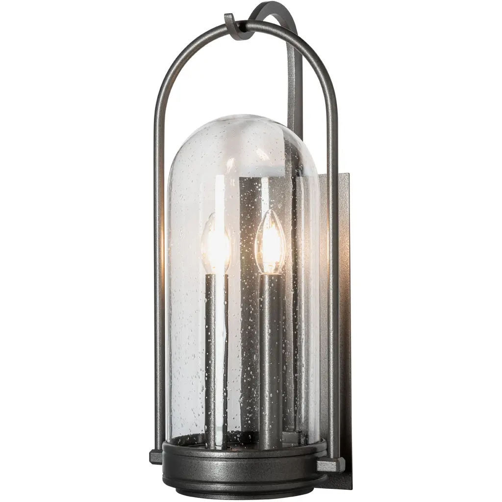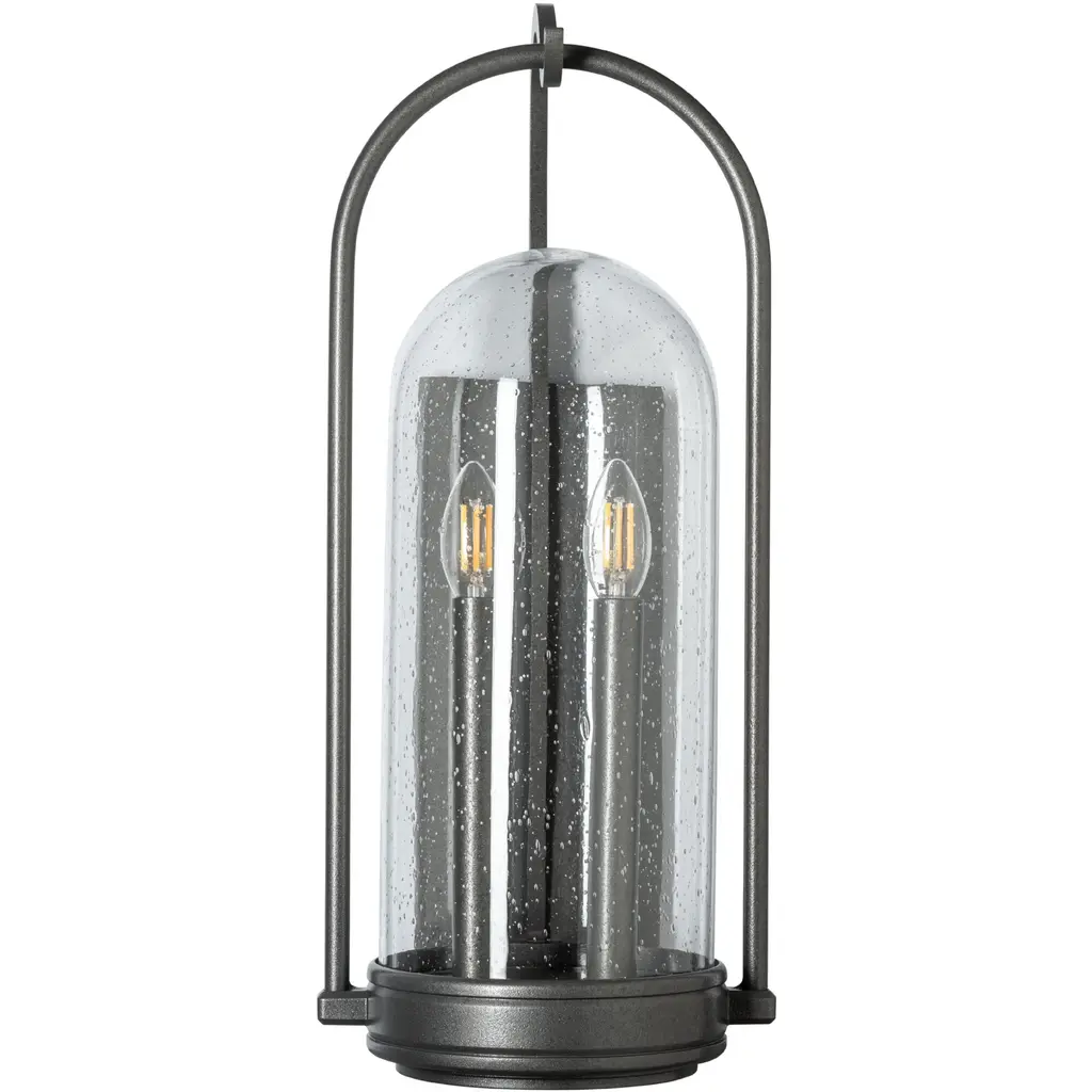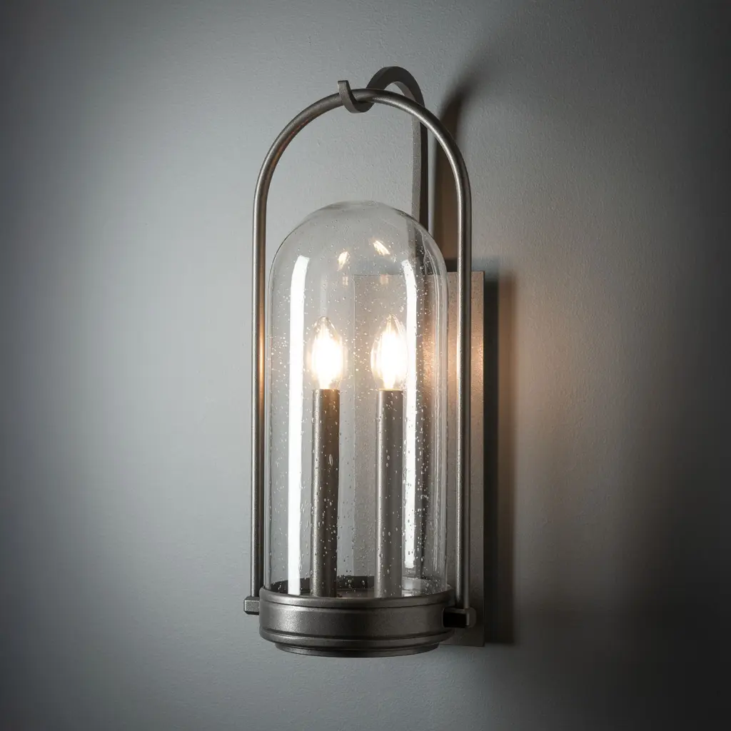 A fresh interpretation of a traditional, hook-style exterior wall mounted fixture, the Davis features a clear, seeded glass bell, exposing two "candlesticks" within. An aluminum backplate serves as the backdrop for this beautifully designed sconce. Available in a choice of AAMA 2604-rated Coastal Outdoor Finishes.