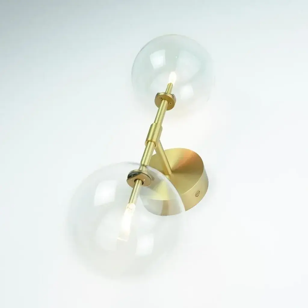 Dawn dual brass wall sconce by schwung dimensions: w 19 x d 15 x h 47.5 cm materials: natural brass, hand blown glass globes finishes available: black gunmetal, polished nickel schwung is a german word, and loosely defined, means energy or momentumm of a positive manner. Synonyms: verve, zest, panache, momentum. Mission developing lighting fixtures through simple and timeless materials, sustainably; we are committed to creating quality products that last. Beginning with the design we are constantly refining aesthetic and function. Both in the lamps themselves and throughout the manufacturing process we pursue a holistic approach to efficiency, and the reduction of environmental impact. up to 250v (europe/uk standard).
