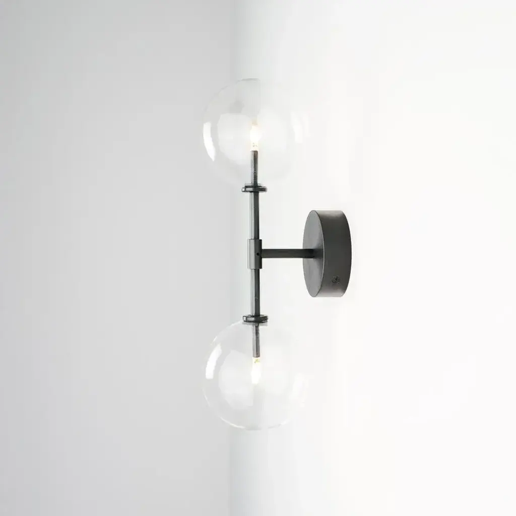 Dawn dual brass wall sconce by schwung dimensions: w 19 x d 15 x h 47.5 cm materials: black gunmetal, hand blown glass globes finishes available: black gunmetal, polished nickel, brass schwung is a german word, and loosely defined, means energy or momentumm of a positive manner. Synonyms: verve, zest, panache, momentum. Mission: developing lighting fixtures through simple and timeless materials, sustainably; we are committed to creating quality products that last. Beginning with the design we are constantly refining aesthetic and function. Both in the lamps themselves and throughout the manufacturing process we pursue a holistic approach to efficiency, and the reduction of environmental impact. up to 250v (europe/uk standard).