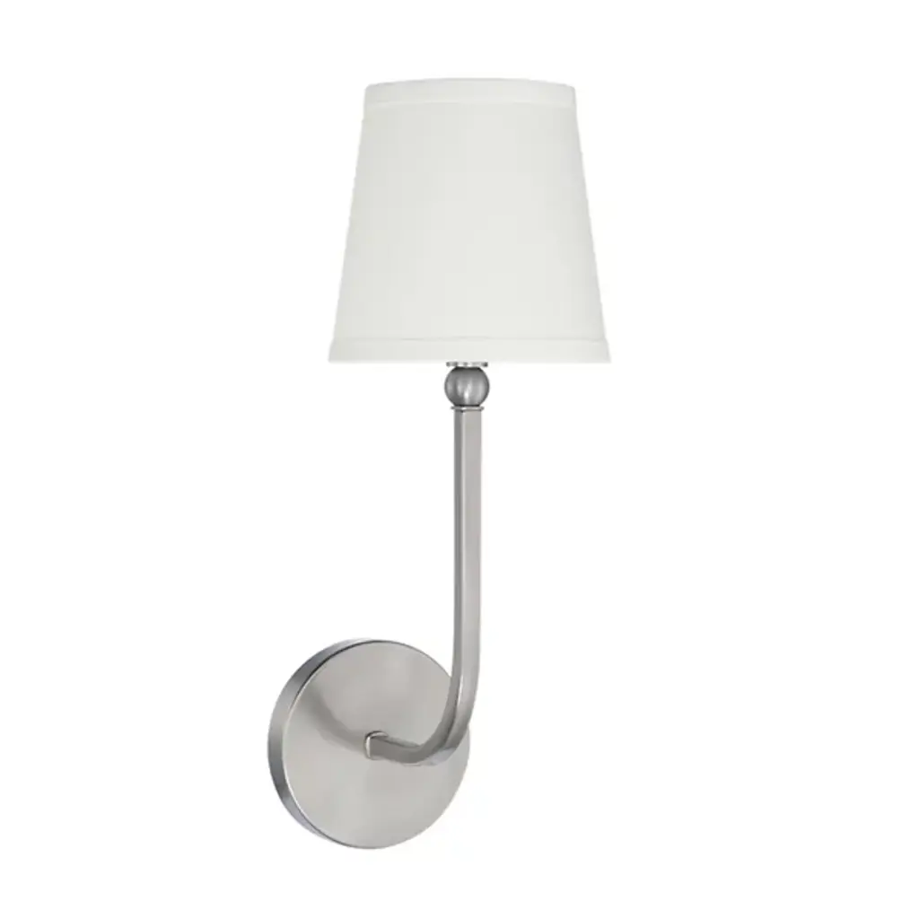 The Dawson Wall Sconce from Capital Lighting brings a timeless appeal to your home, suitable for classical home decors. Simplicity is key to appreciating the design of this piece. A single, gently curved arm extends from a minimalist backplate and ends with a small sphere accent and a white fabric shade which lowers the light into a warm, ambient glow. With a pleasing visual aesthetic, the Dawson brings the room together with its simplicity.