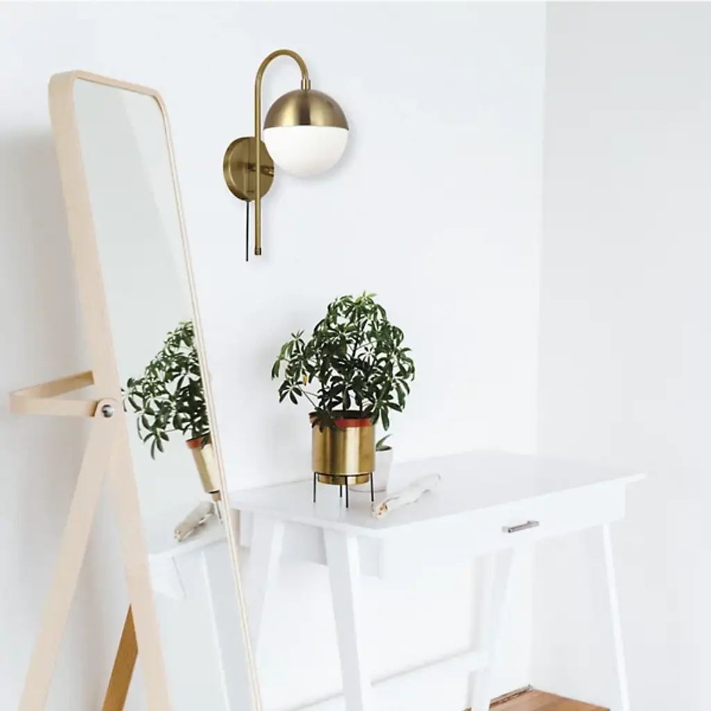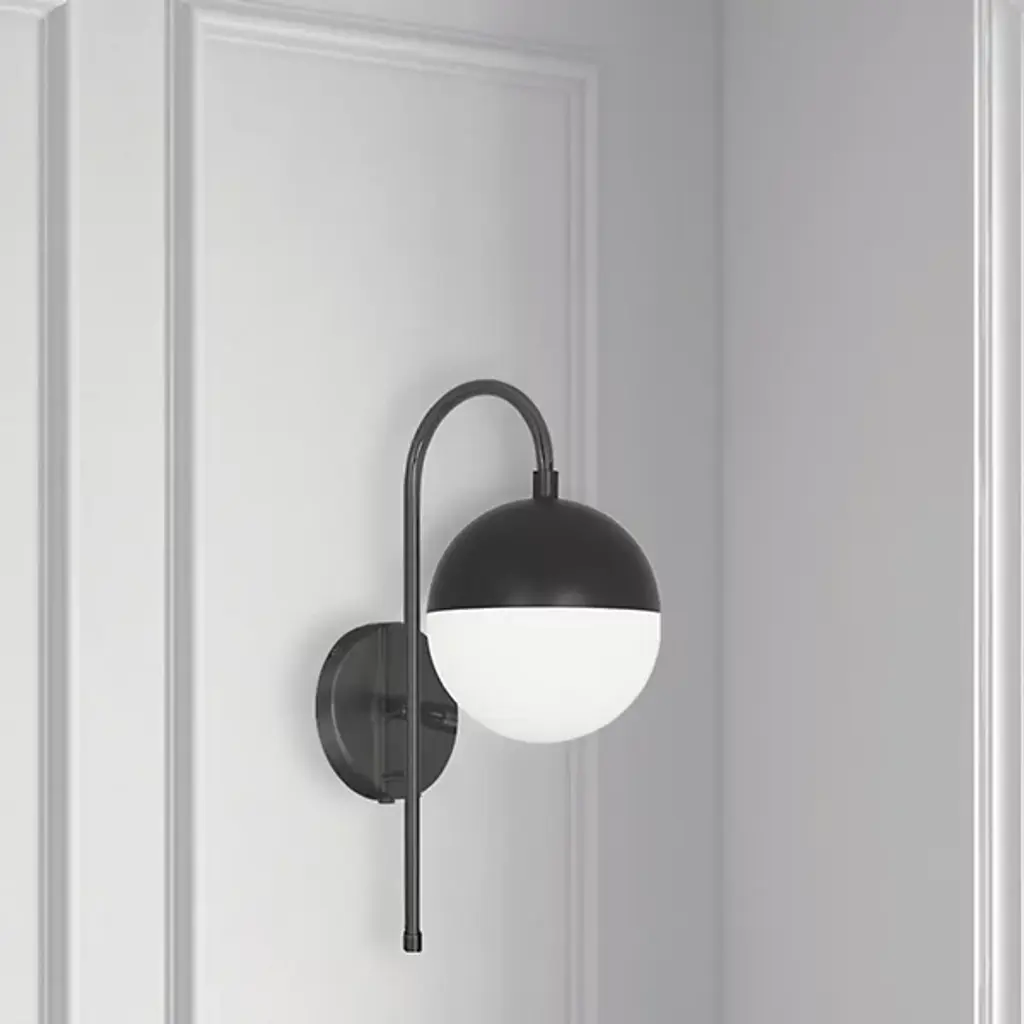 Add smooth modern refinement to your walls and hallways with the Dayana Wall Sconce by Dainolite. Anchored to its mounting surface by a sleek disc wall mount, it sends out two short rods to secure a single vertical stem that arcs outward to terminate in a downward-facing socket. The lamping itself is tucked inside a globe arrangement that combines a metal half-sphere with a translucent glass shade that gentles harsh glare into a pleasant warmth around it.