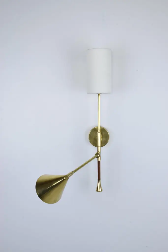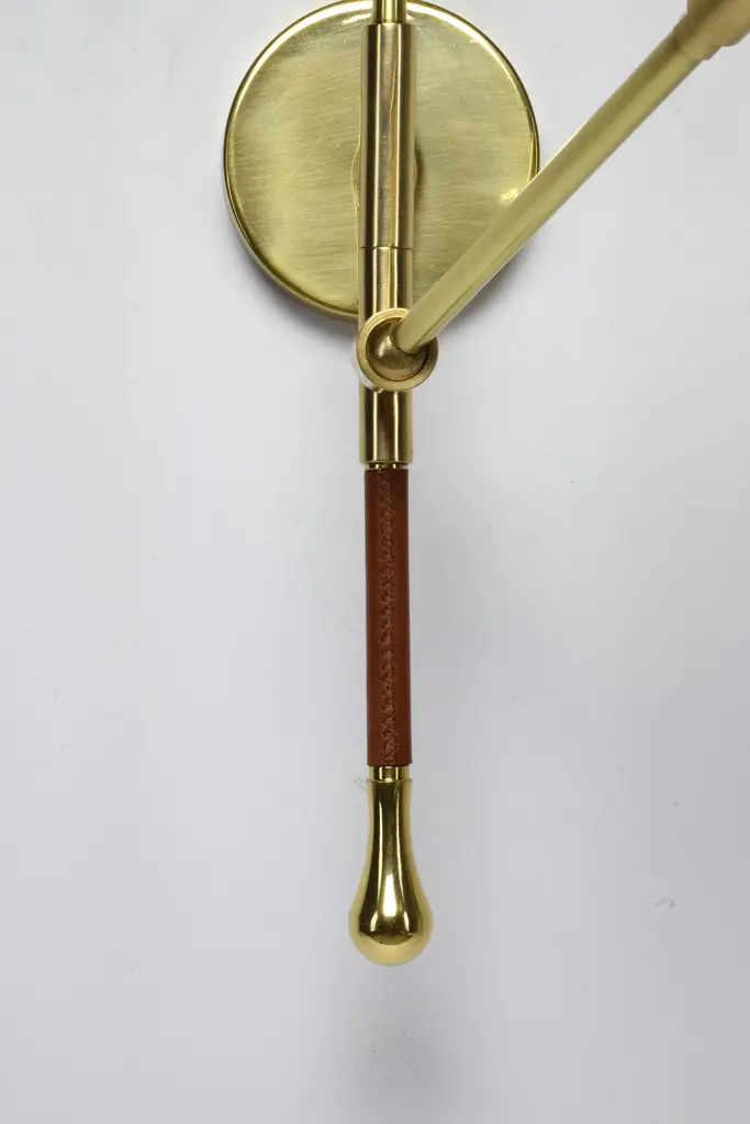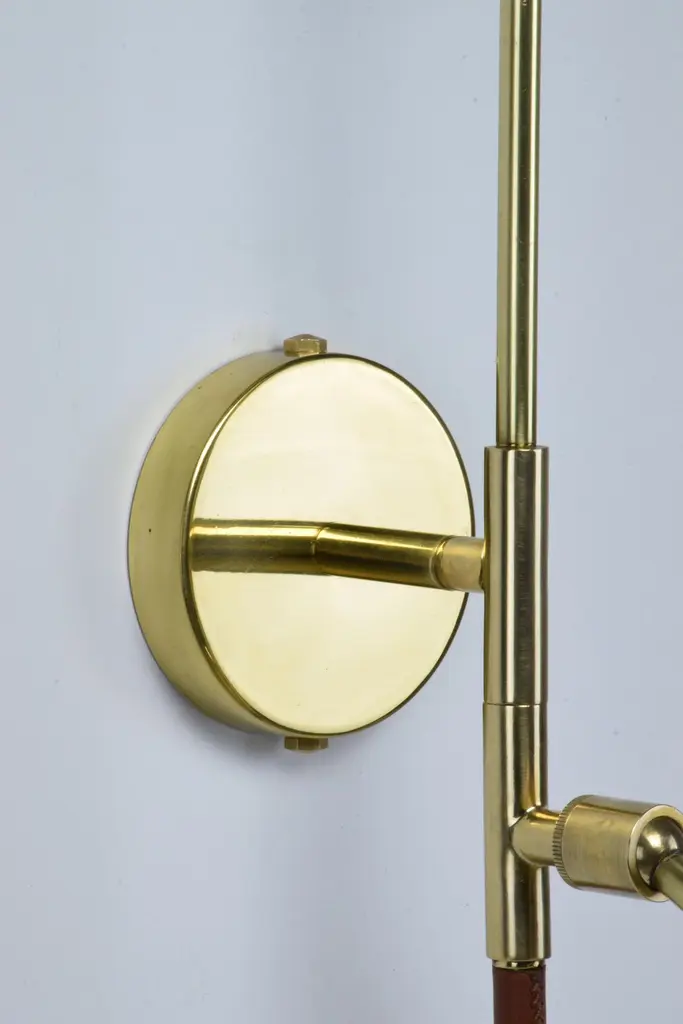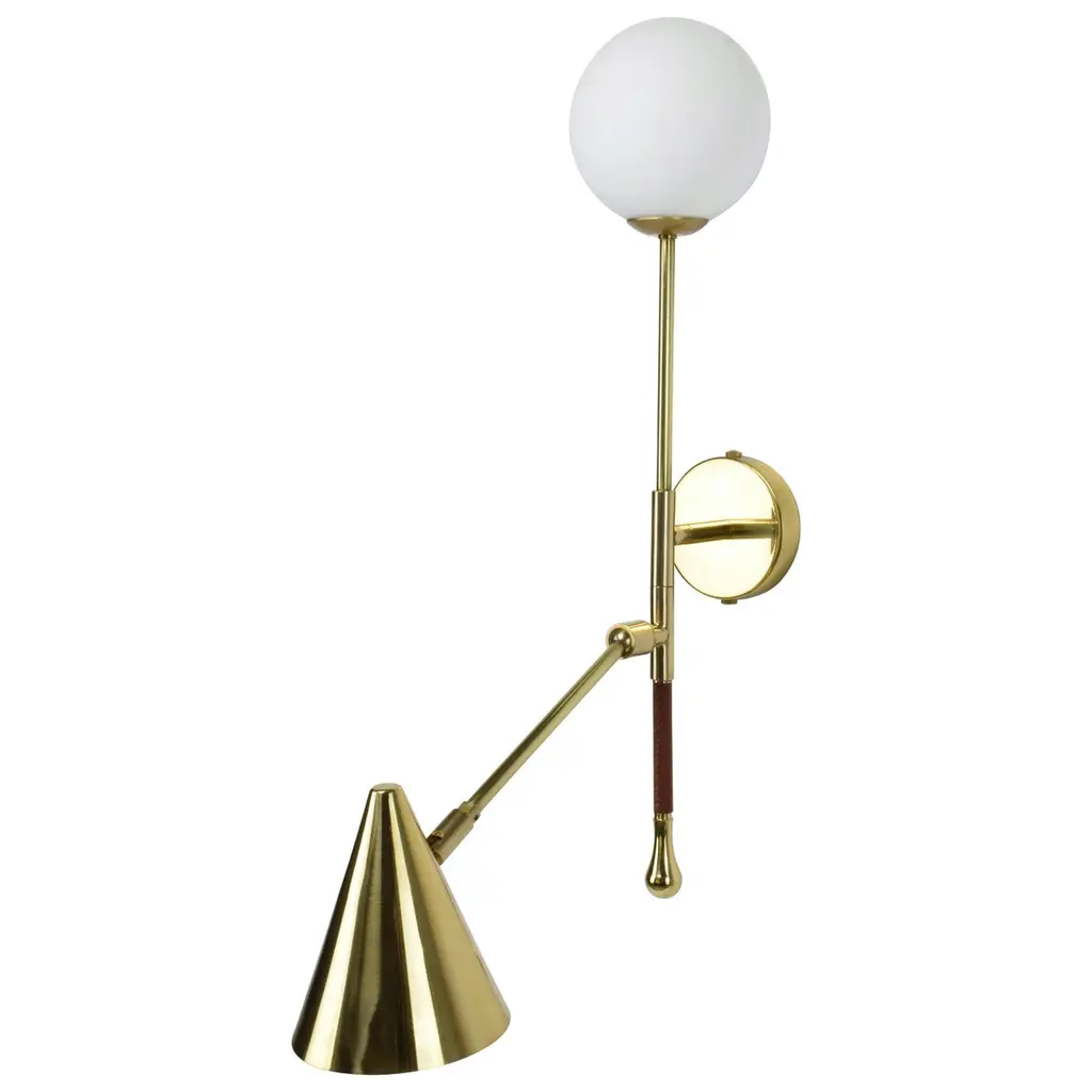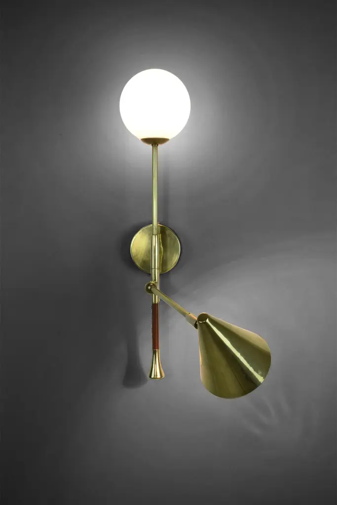 The De.Light is a solid brass double wall light with a leather sheathed stem detail. The main structure tops an opal glass di user or a cylinder fabric shade and the Directional stem features a conic shade mounted with a moveable joint. Perfect as a bedside reading lamp or to illuminate wall art.For hotels and restaurants, where lighting optimization is often a Challenge, De.Light W1 redefines layout possibilities with functionality and design. In private spaces, this model is an ideal addition to any living room, bedroom or vanity. Various dimensions, brass finishes and leather colors are available upon request.Universally compatible. A specification sheet with technical details is available. G9 2 x 60 W Max 120v LED 230 LED integrated The Flow collection is an ode to movement designed by Jonathan Amar composed of artisanal articulating lamps and side tables following three years of research and development between his office in Paris and his atelier in Rabat and Leiria. It represents 35 years of passion and know-how in the fields of decorative arts and interior design.