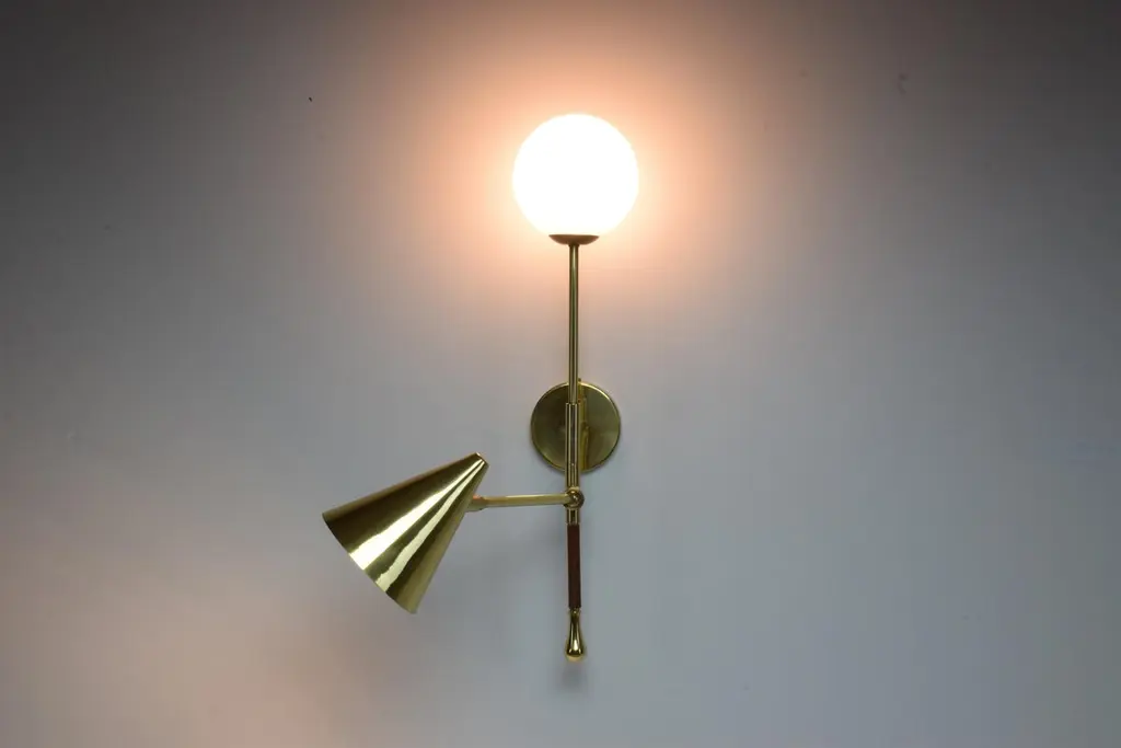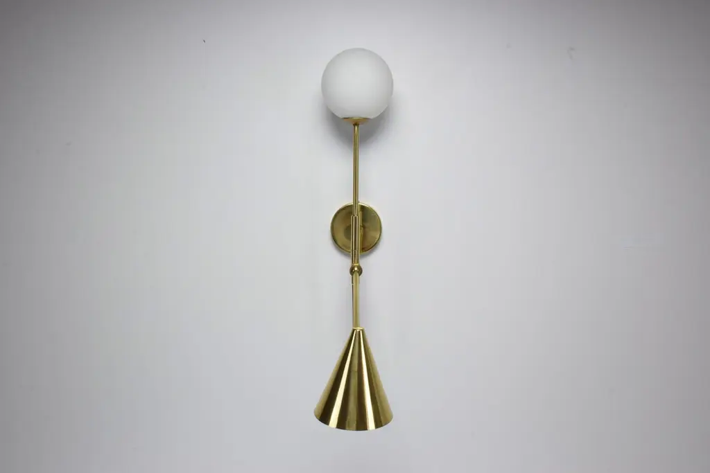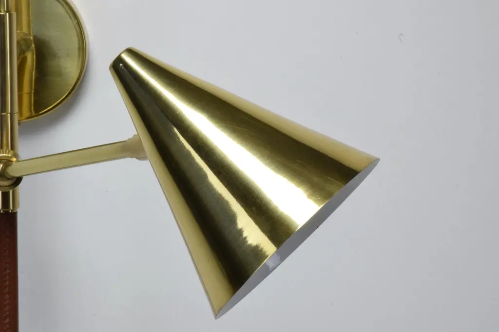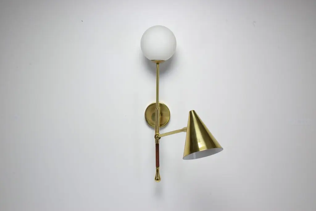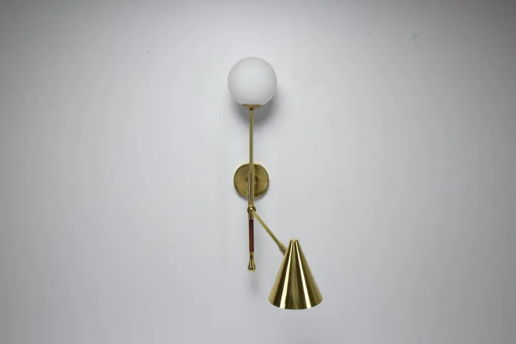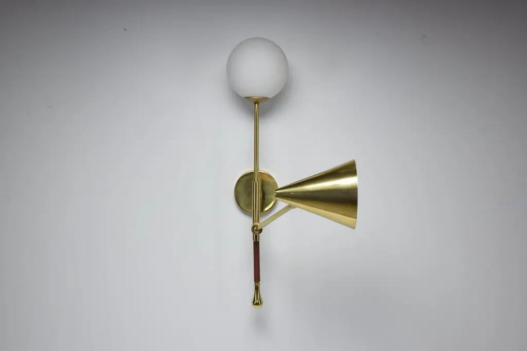 The De.Light is a solid brass double wall light with a leather sheathed stem detail. The main structure tops an opal glass di user or a cylinder fabric shade and the Directional stem features a conic shade mounted with a moveable joint. Perfect as a bedside reading lamp or to illuminate wall art.For hotels and restaurants, where lighting optimization is often a Challenge, De.Light W1 redefines layout possibilities with functionality and design. In private spaces, this model is an ideal addition to any living room, bedroom or vanity. Various dimensions, brass finishes and leather colors are available upon request.Universally compatible. A specification sheet with technical details is available. G9 2 x 60 W Max 120v LED 230 LED integrated The Flow collection is an ode to movement designed by Jonathan Amar composed of artisanal articulating lamps and side tables following three years of research and development between his office in Paris and his atelier in Rabat and Leiria. It represents 35 years of passion and know-how in the fields of decorative arts and interior design.