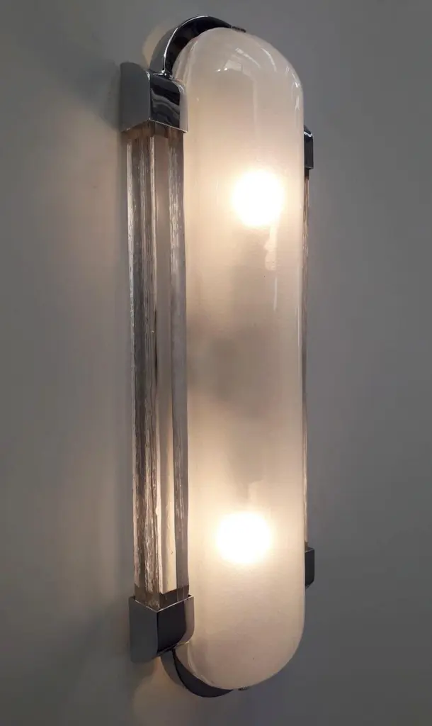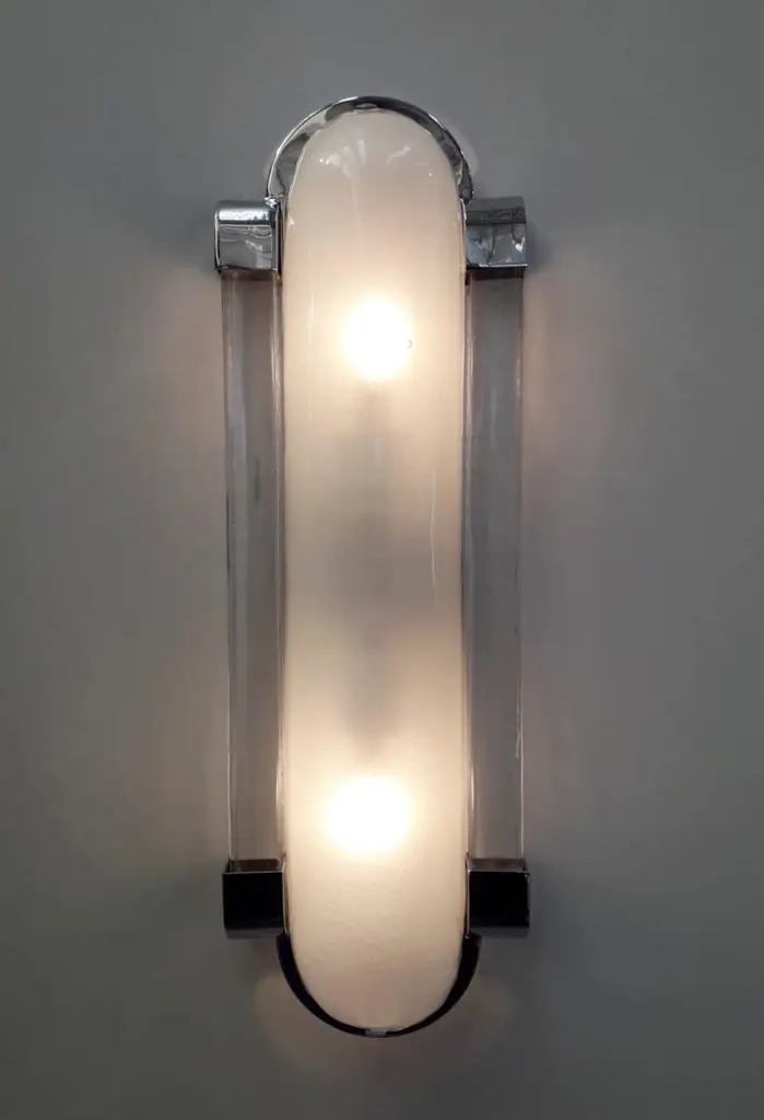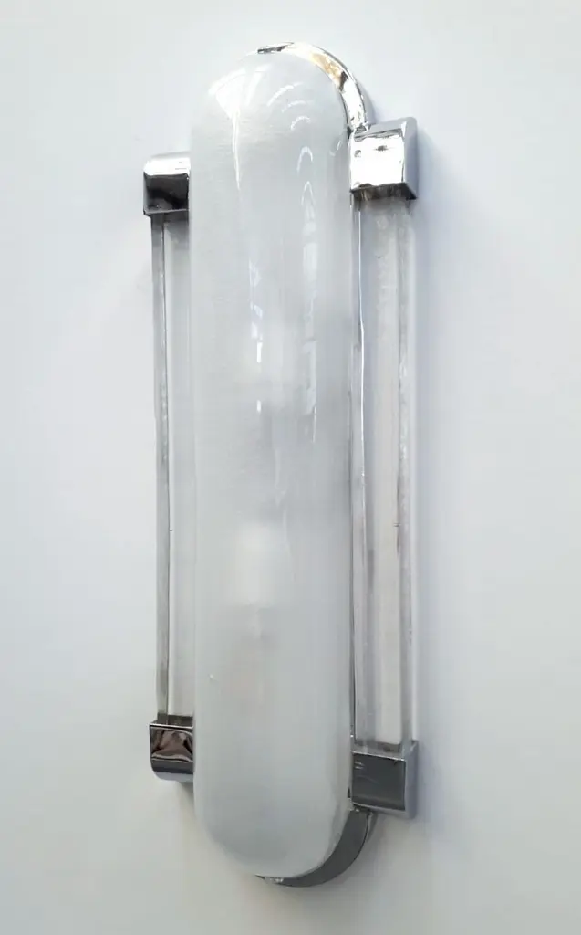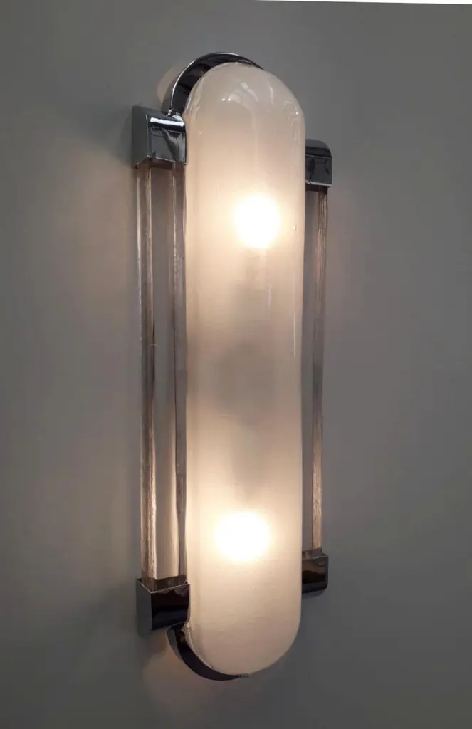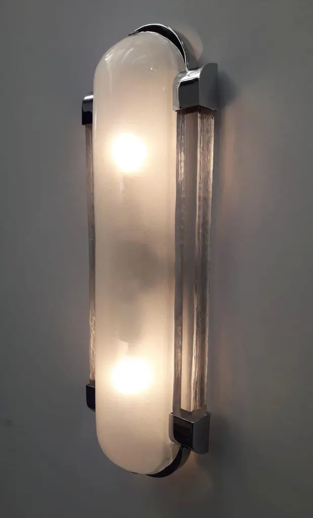 Italian Art Deco style wall light or flushmount with frosted Murano glass mounted on polished chrome frame / Designed by Fabio Bergomi for Fabio Ltd / Made in Italy2 lights / E12 or E14 max 40W each.Measures: height 18.5 inches, width 6.5 inches, depth 3 inchesOrder only / This item ships from Italy.