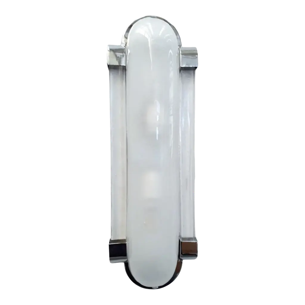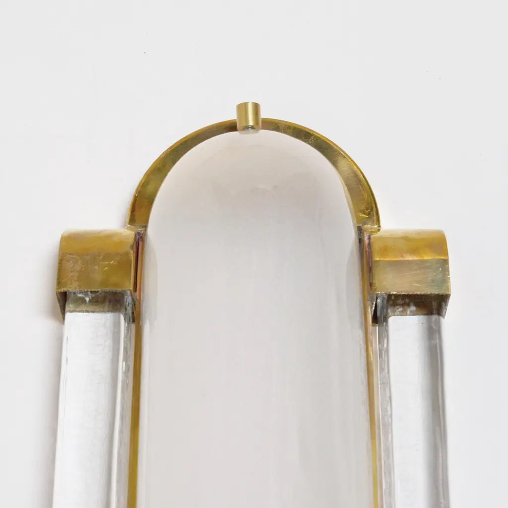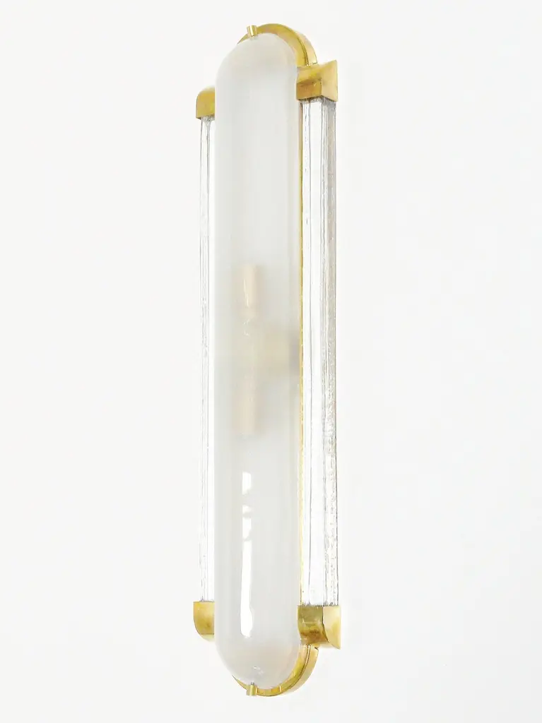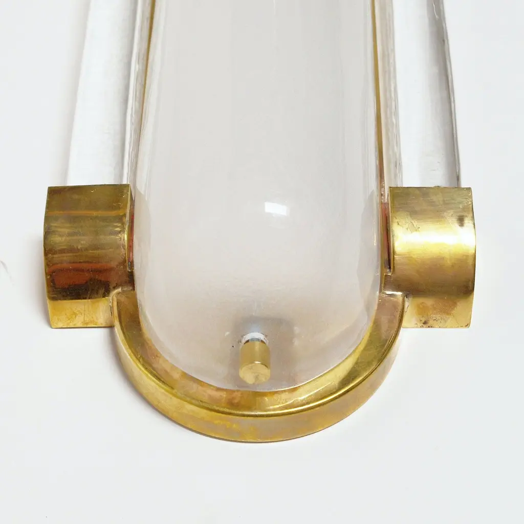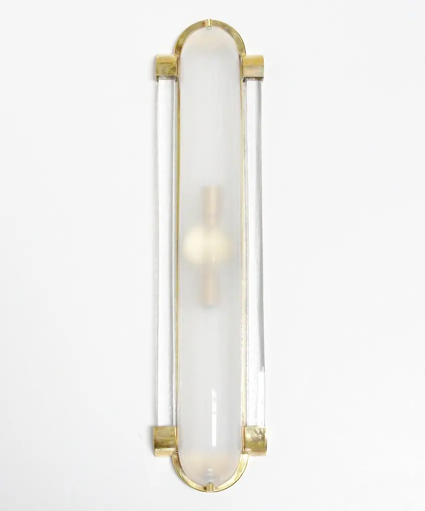 Italian Art Deco style wall light or flushmount shown in frosted Murano glass mounted on unlacquered natural brass frame / Designed by Fabio Bergomi for Fabio Ltd / Made in Italy2 lights / E12 or E14 type / max 40W eachMeasures: Height 27.5 inches, width 6 inches, depth 3 inchesOrder only / This item ships from ItalyOrder Reference #: FABIOLTD W37 TALL