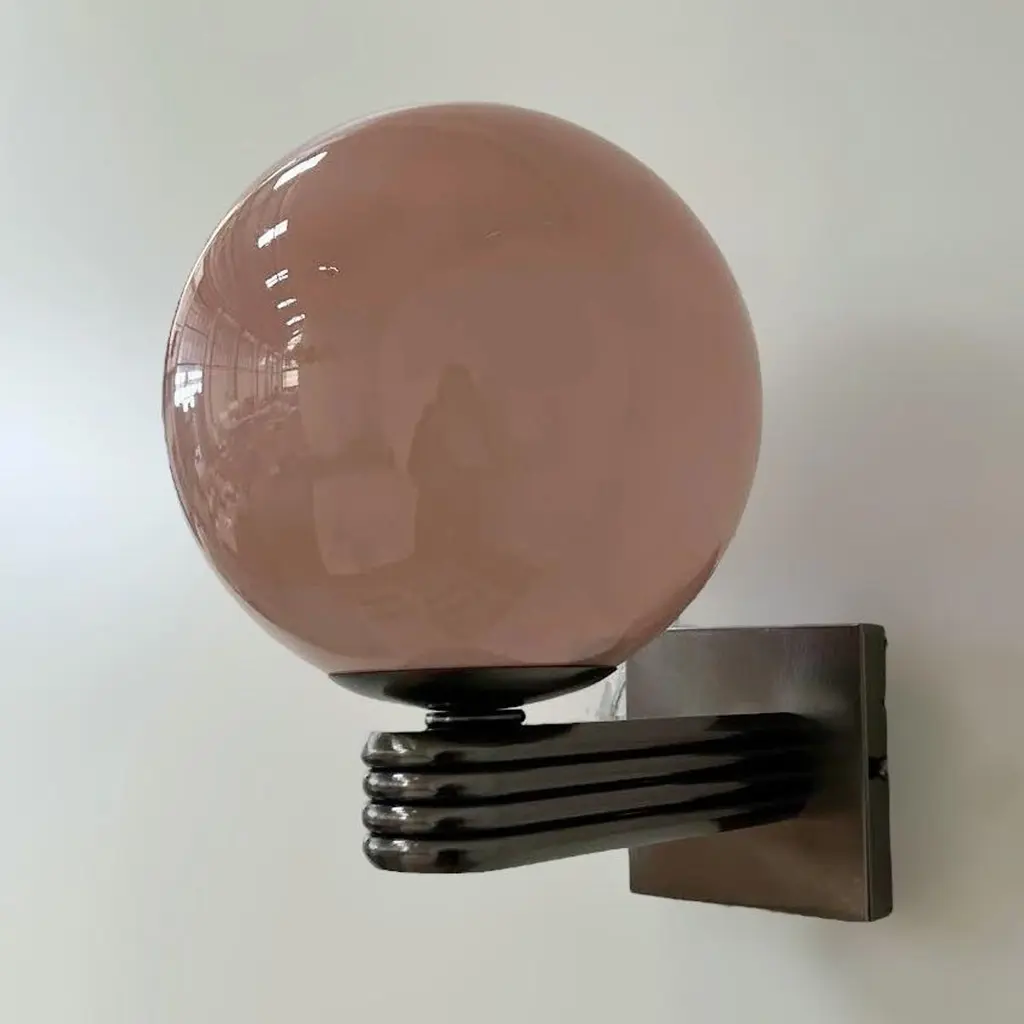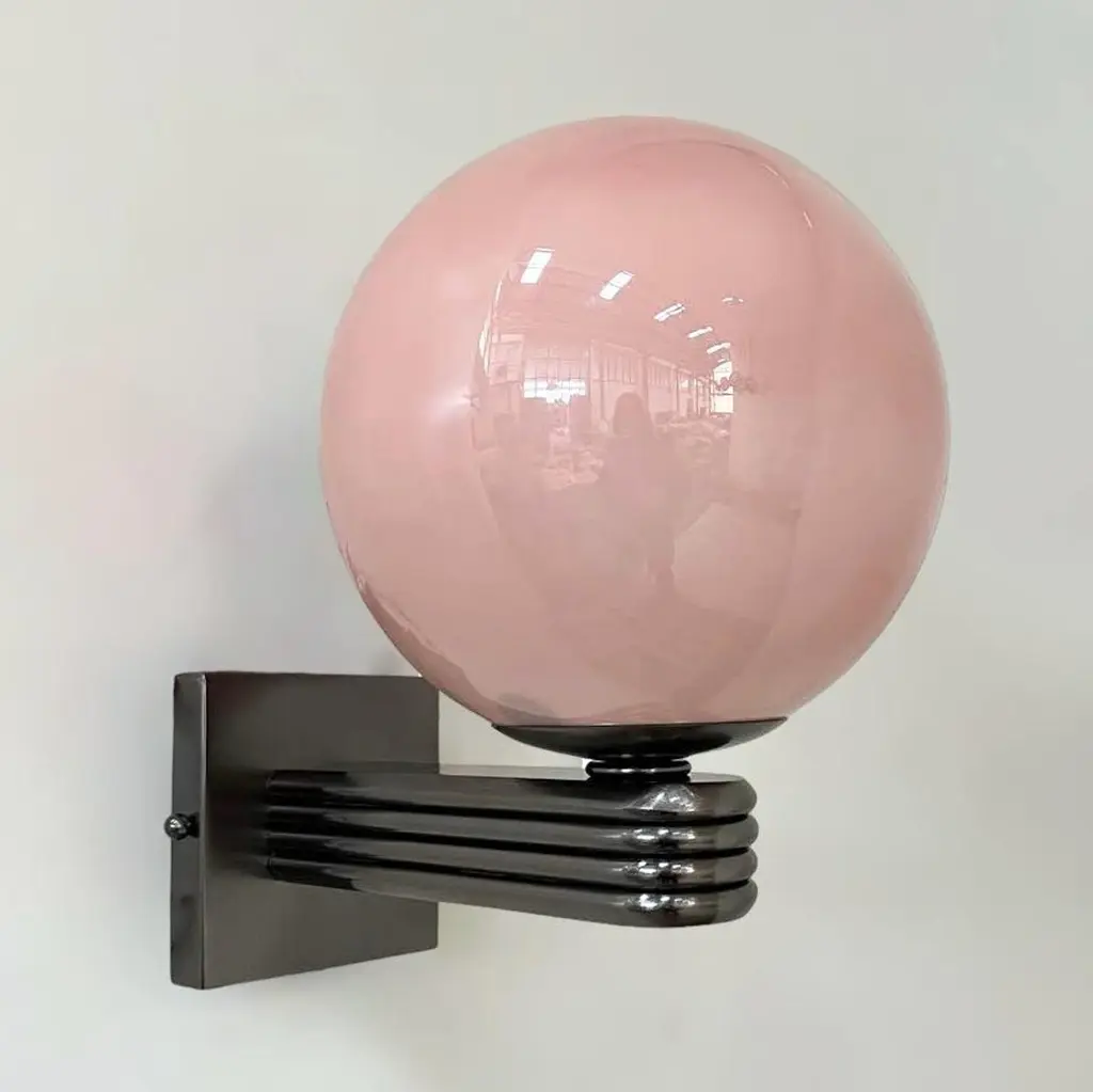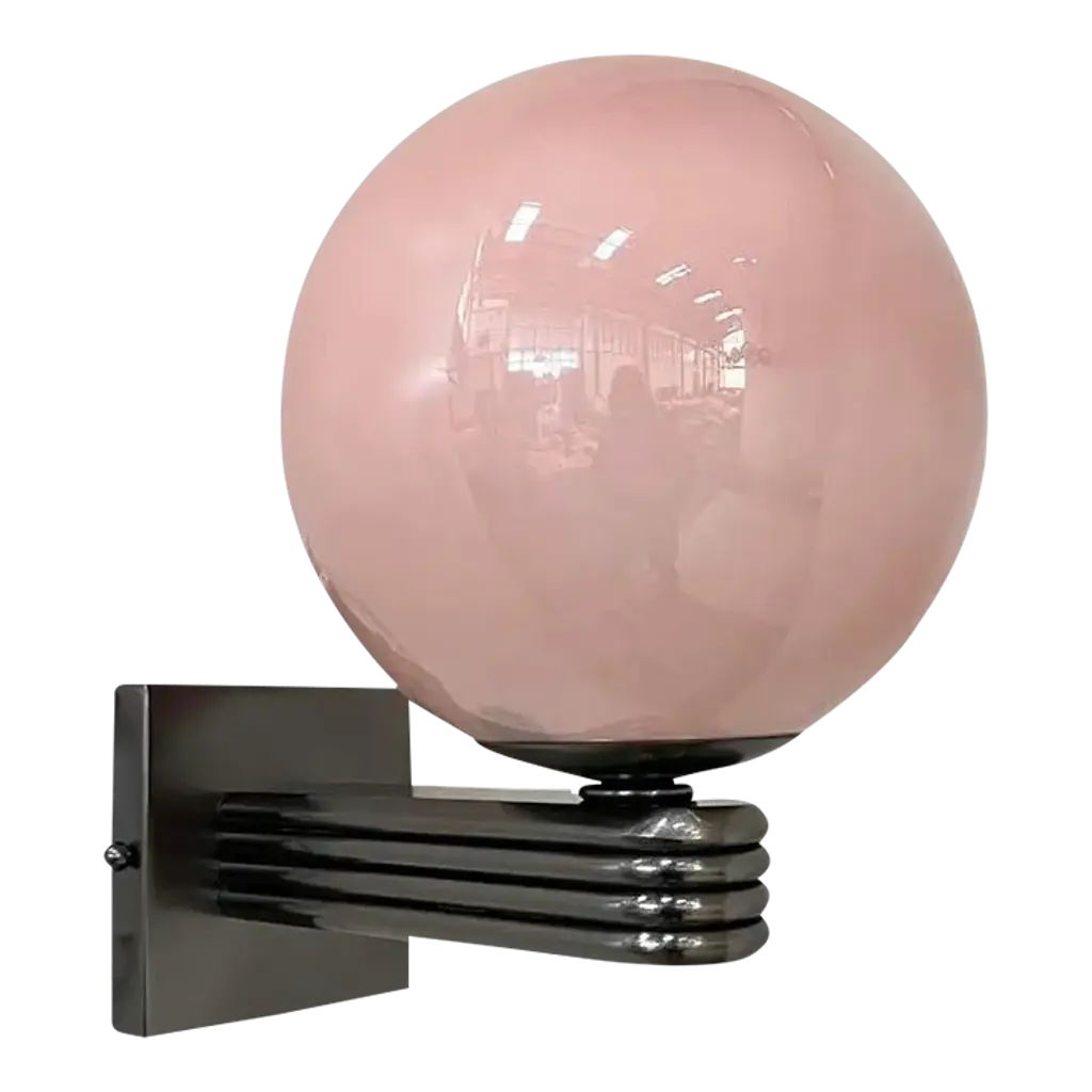 Italian Art Deco style wall light with opaque pink coral Murano glass globe mounted on satin black nickel finish frame, designed by Fabio Bergomi for Fabio Ltd, made in Italy1 light / E12 or E14 type / max 40WMeasures: Height 12 inches, width 8 inches, depth 10 inchesOrder only / This item ships from ItalyPlease inquire for custom options / pricing / current lead timesOrder Reference #: FABIOLTD W757 OPAQUE CORAL