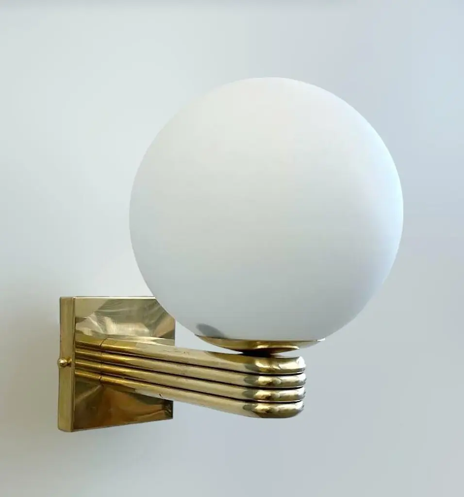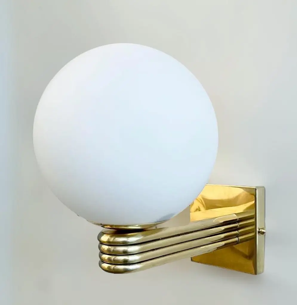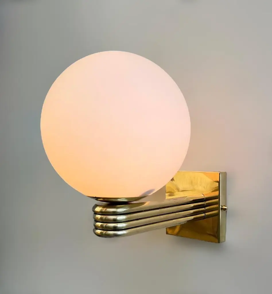 Italian Art Deco style wall light with matte white Murano glass globe mounted on unlacquered natural brass frame, designed by Fabio Bergomi for Fabio Ltd, made in Italy1 light / E12 or E14 type / max 40WMeasures: Height 12 inches, width 8 inches, depth 10 inchesOrder only / This item ships from ItalyPlease inquire for custom options / pricing / current lead timesOrder Reference #: FABIOLTD W758 MATTE