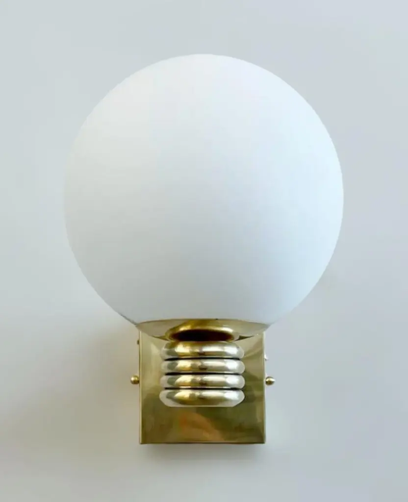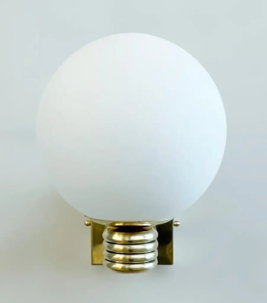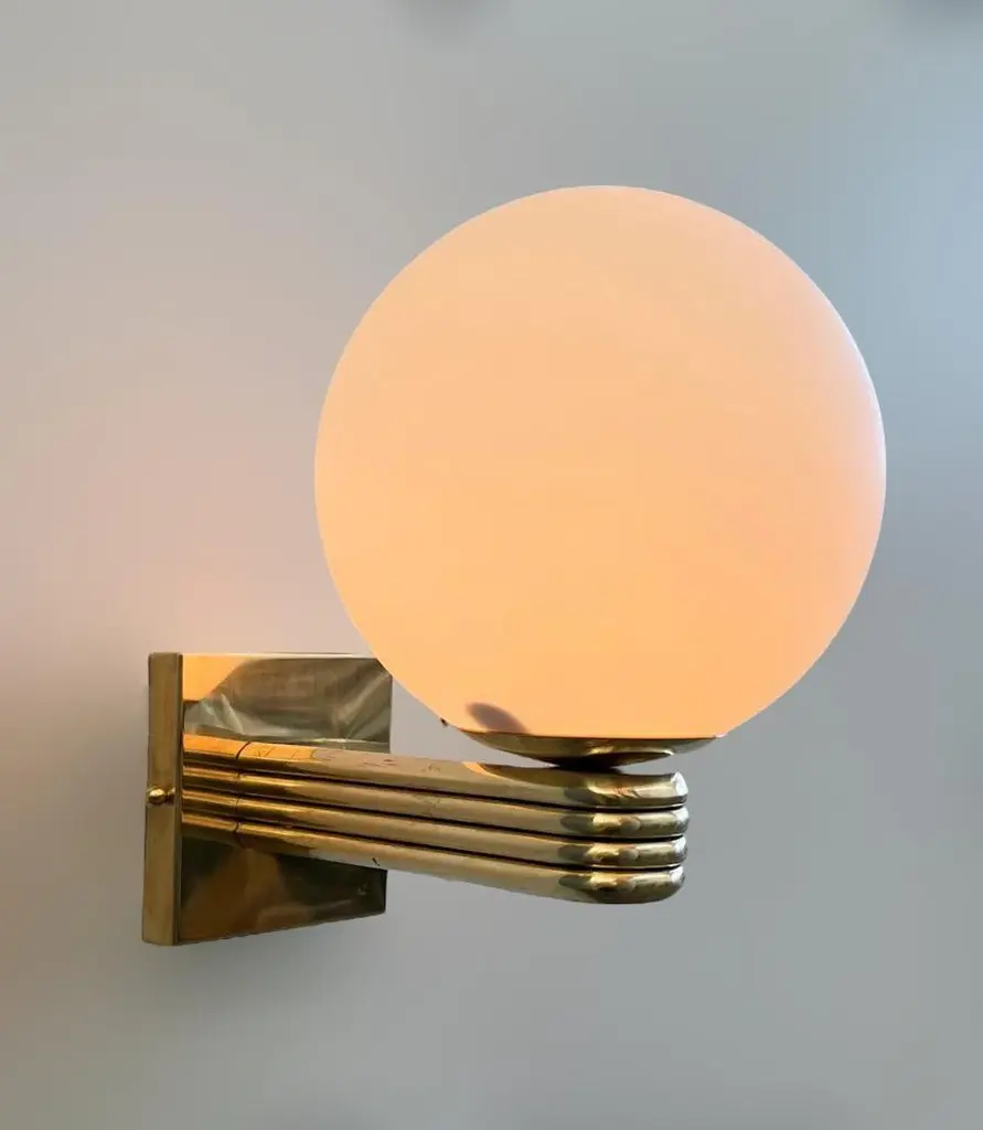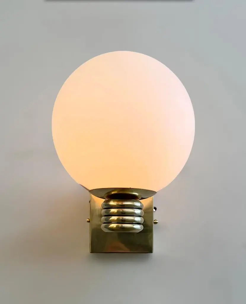 Italian Art Deco style wall light with matte white Murano glass globe mounted on unlacquered natural brass frame, designed by Fabio Bergomi for Fabio Ltd, made in Italy1 light / E12 or E14 type / max 40WMeasures: Height 12 inches, width 8 inches, depth 10 inchesOrder only / This item ships from ItalyPlease inquire for custom options / pricing / current lead timesOrder Reference #: FABIOLTD W758 MATTE