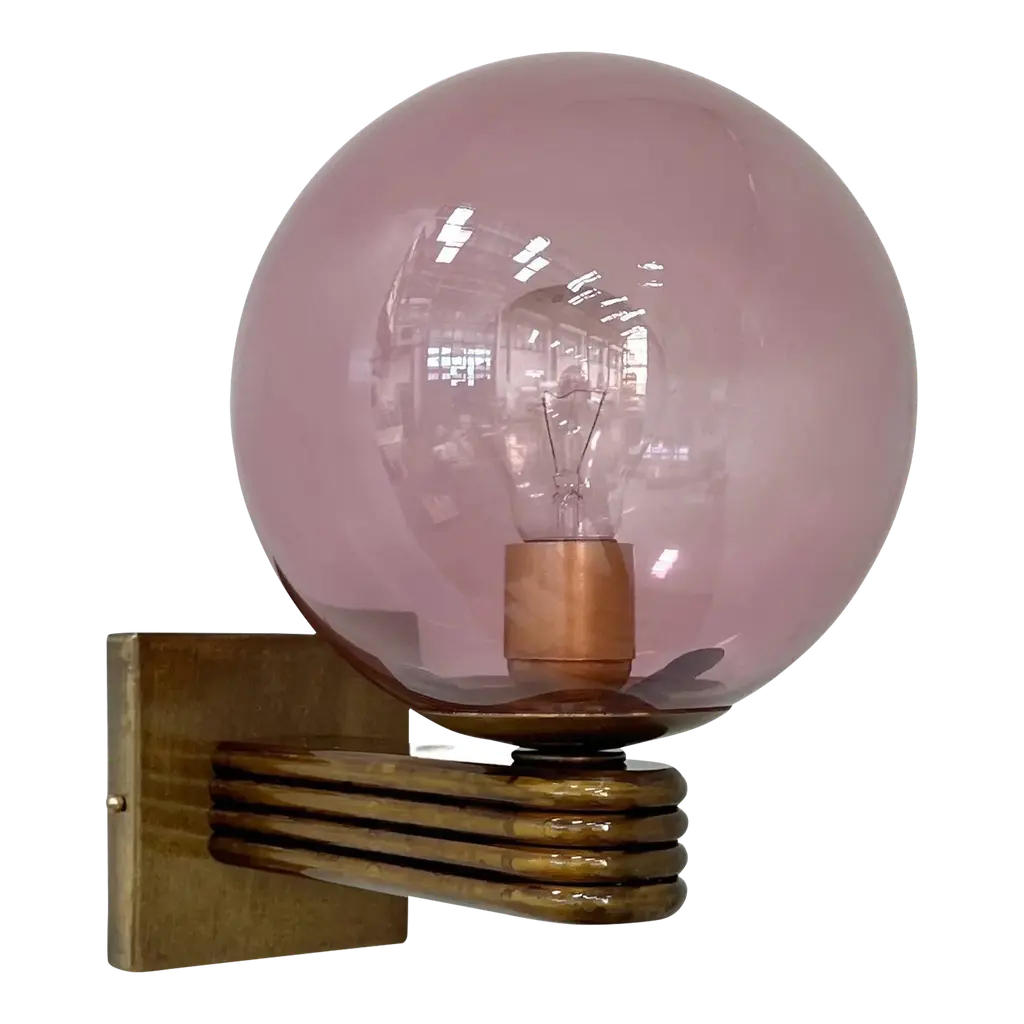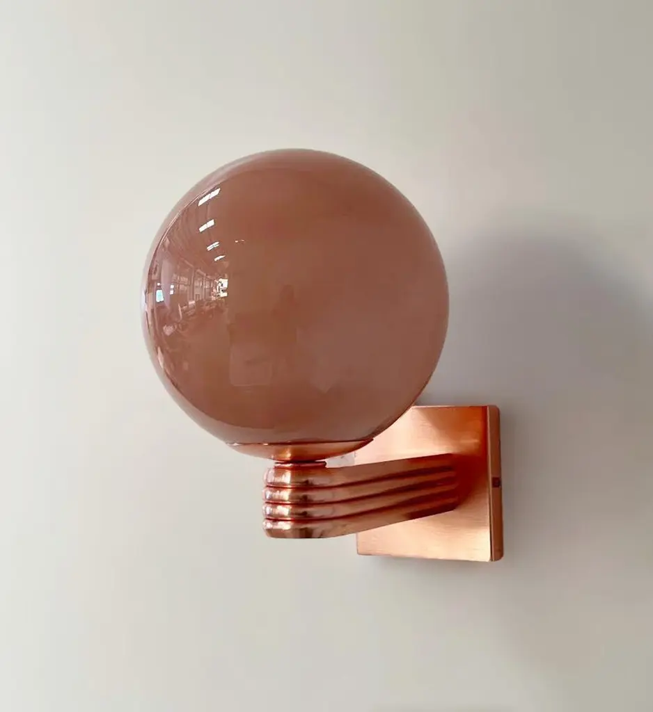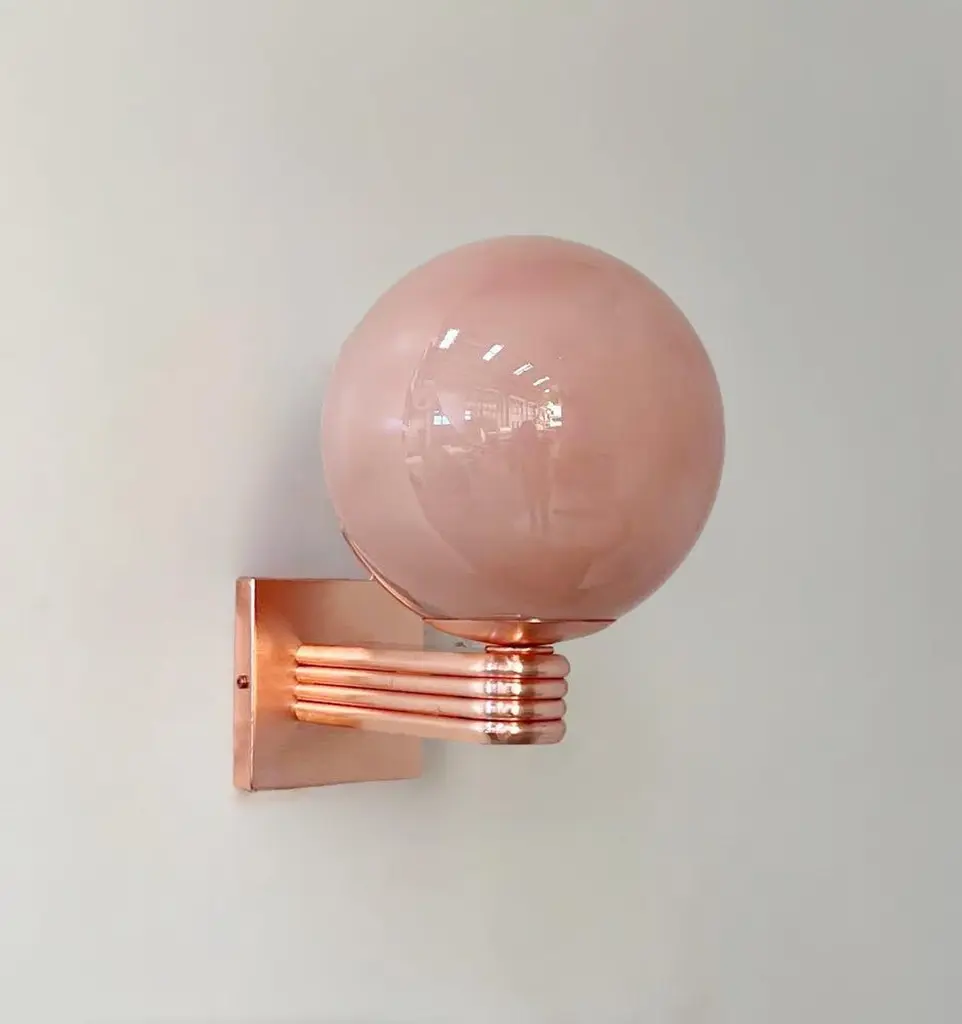 Italian Art Deco style wall light with opaque pink coral Murano glass globe mounted on satin copper finish frame, designed by Fabio Bergomi for Fabio Ltd, made in Italy1 light / E12 or E14 type / max 40WMeasures: Height 12 inches, width 8 inches, depth 10 inchesOrder only / This item ships from ItalyPlease inquire for custom options / pricing / current lead timesOrder Reference #: FABIOLTD W761 OPAQUE CORAL