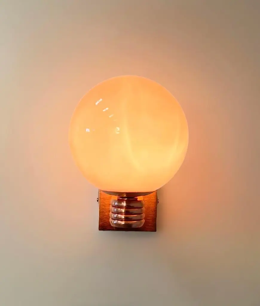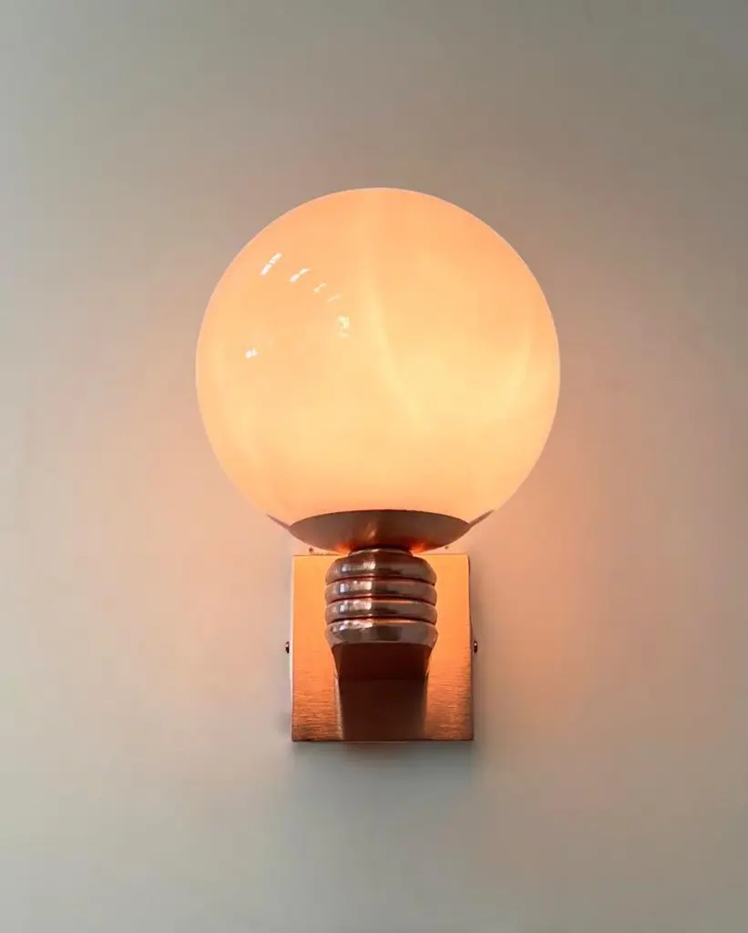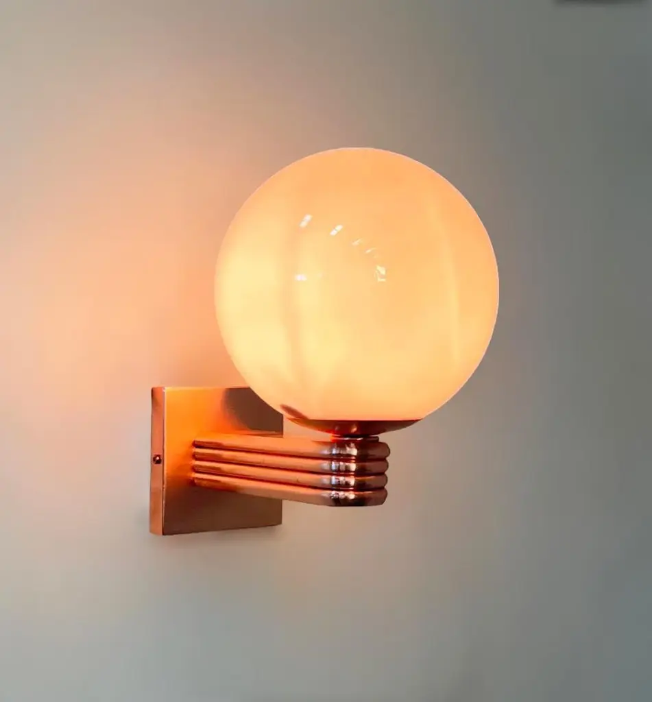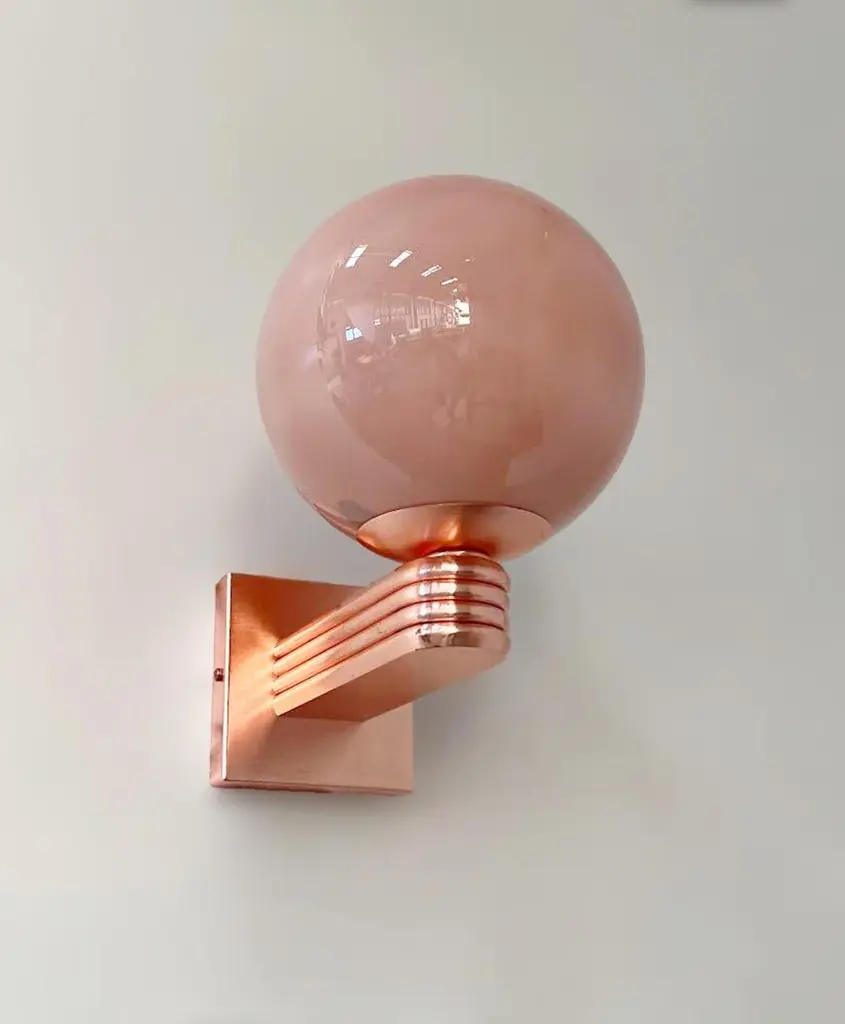 Italian Art Deco style wall light with opaque pink coral Murano glass globe mounted on satin copper finish frame, designed by Fabio Bergomi for Fabio Ltd, made in Italy1 light / E12 or E14 type / max 40WMeasures: Height 12 inches, width 8 inches, depth 10 inchesOrder only / This item ships from ItalyPlease inquire for custom options / pricing / current lead timesOrder Reference #: FABIOLTD W761 OPAQUE CORAL