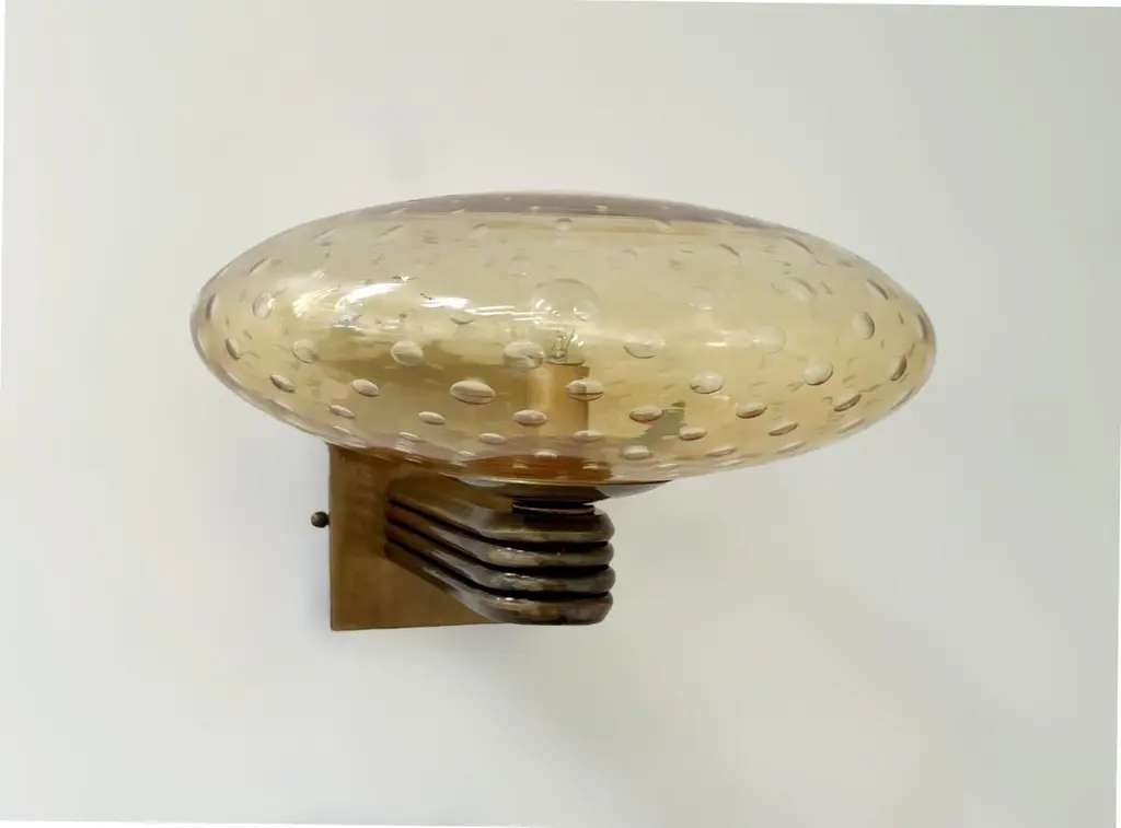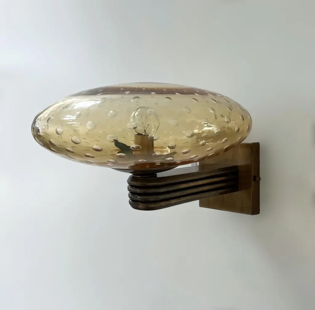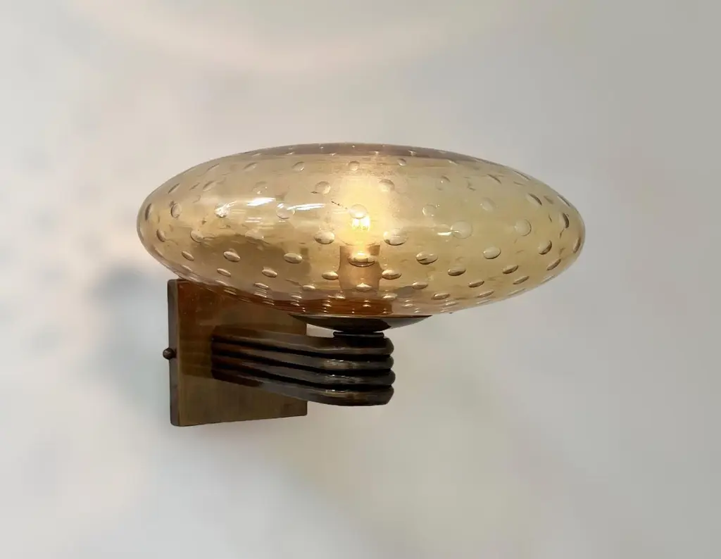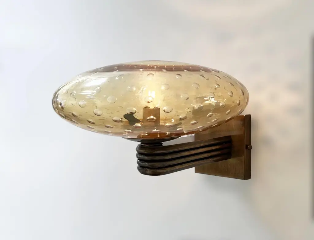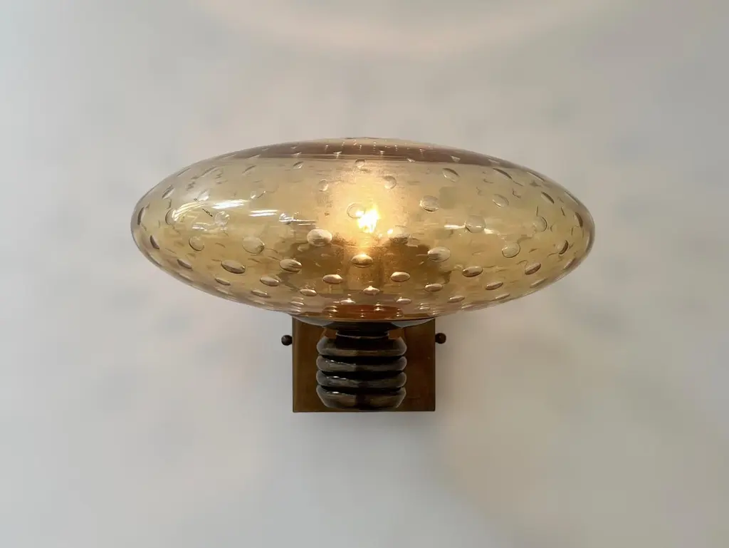 Italian Art Deco style wall light with amber Murano glass shade hand blown with bubbles inside the glass using Bollicine technique, mounted on bronzed finish frame / Designed by Fabio Bergomi for Fabio Ltd / Made in Italy1 light / E12 or E14 type / max 40WMeasures: Height 8.5 inches, width 12 inches, depth 13 inchesOrder only / This item ships from ItalyPlease inquire for custom options / pricing / current lead timesOrder Reference #: FABIOLTD W469 AMBER BUBBLES
