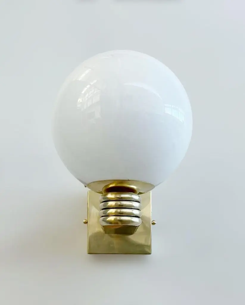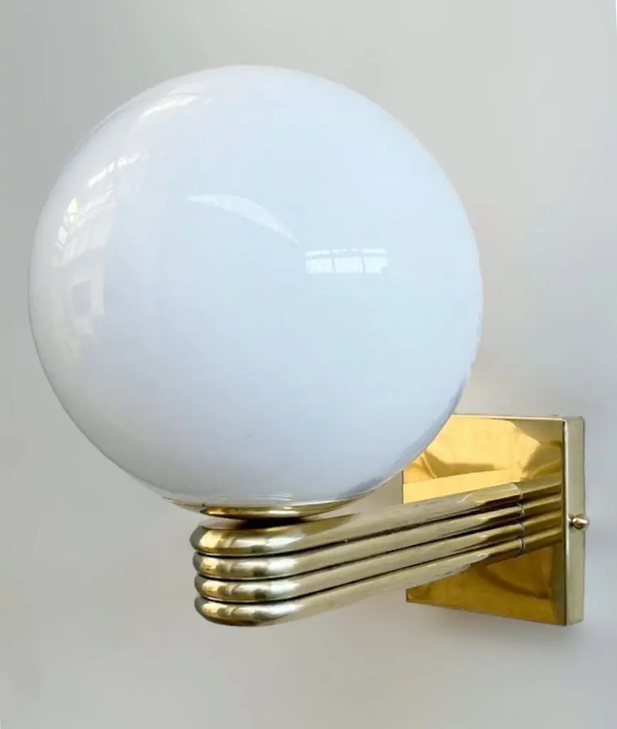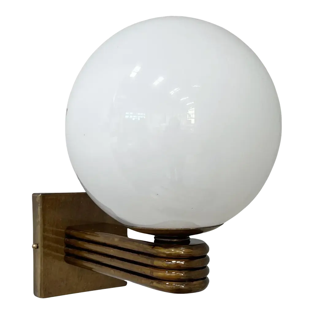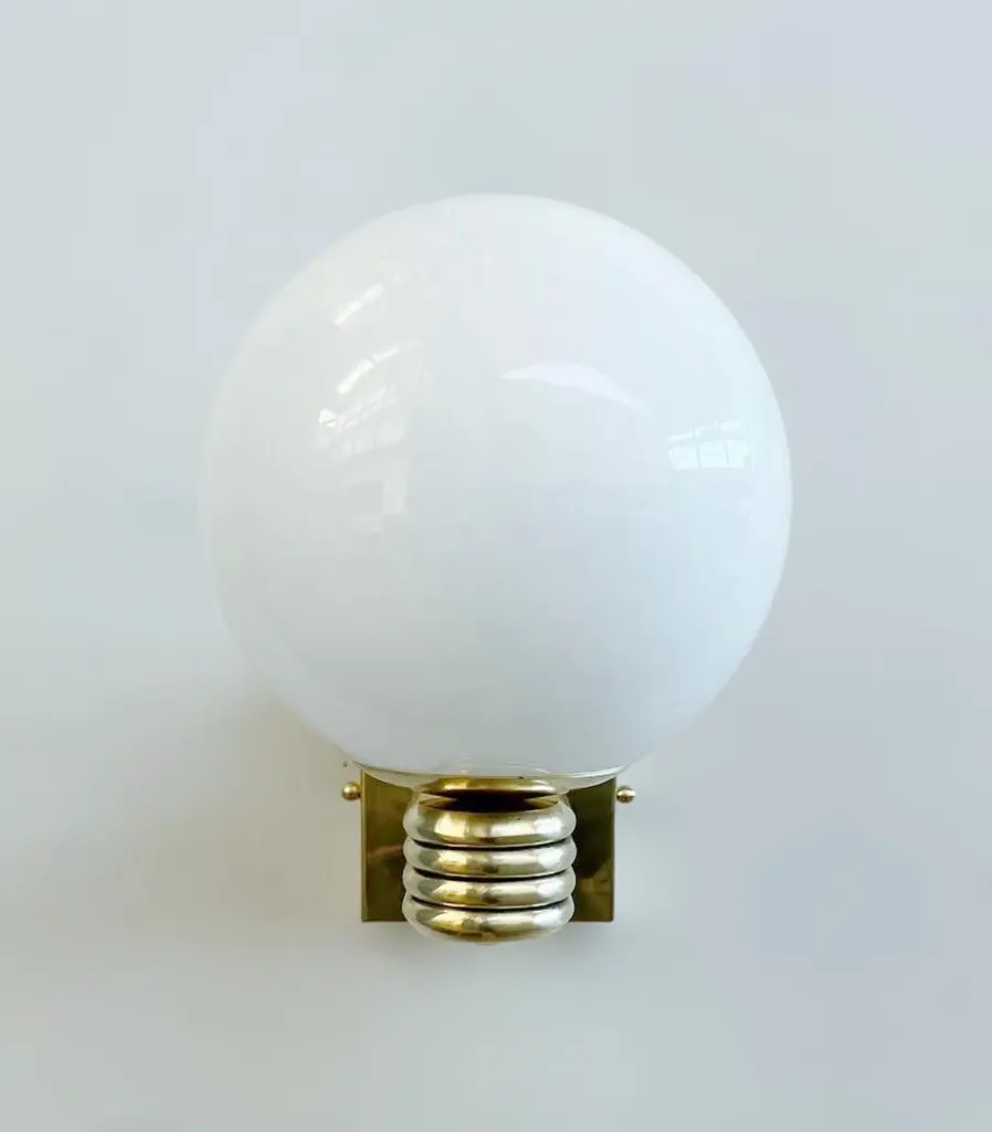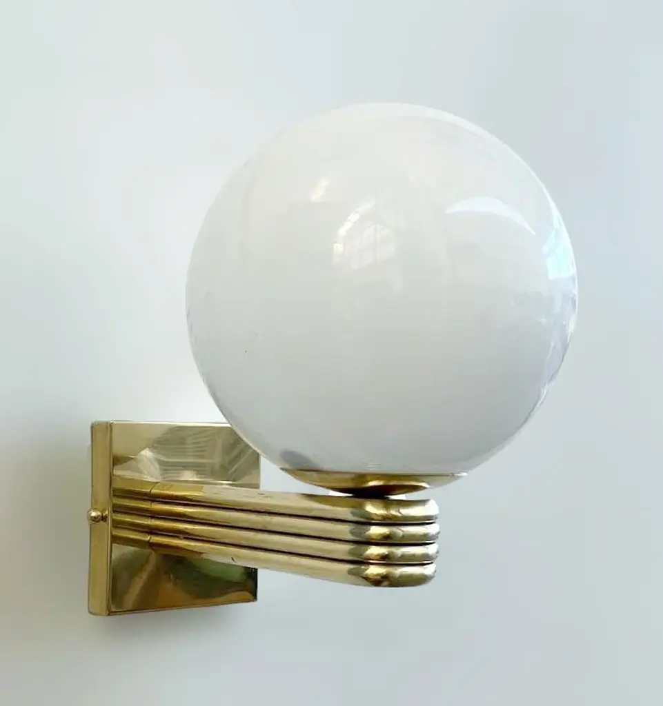 Italian Art Deco style wall light with glossy white Murano glass globe mounted on unlacquered natural brass frame, designed by Fabio Bergomi for Fabio Ltd, made in Italy1 light / E12 or E14 type / max 40WMeasures: Height 12 inches, width 8 inches, depth 10 inchesOrder only / This item ships from ItalyPlease inquire for custom options / pricing / current lead timesOrder Reference #: FABIOLTD W758 WHITE