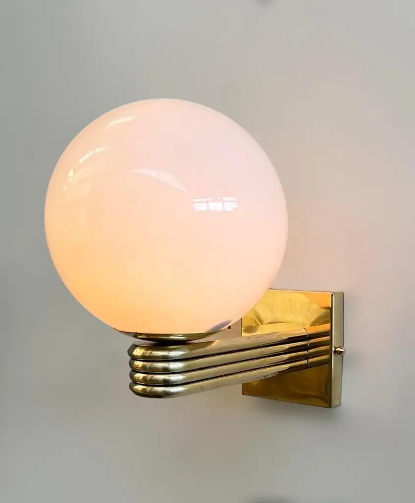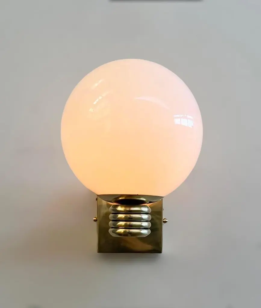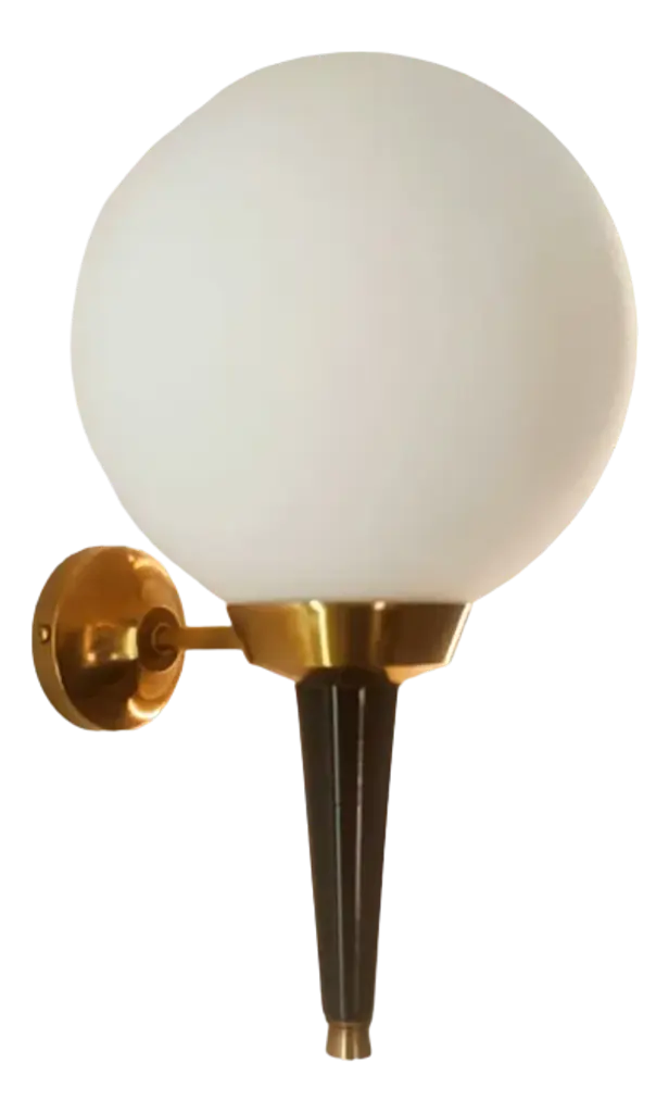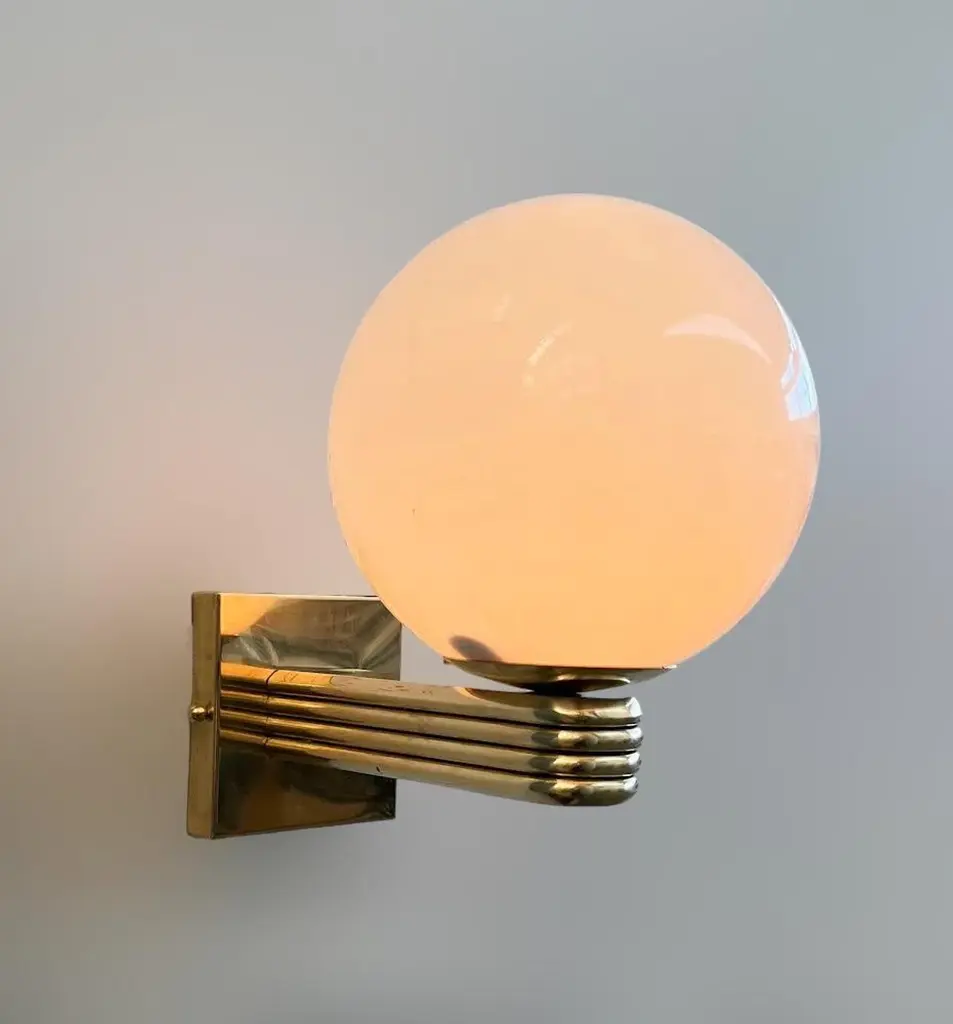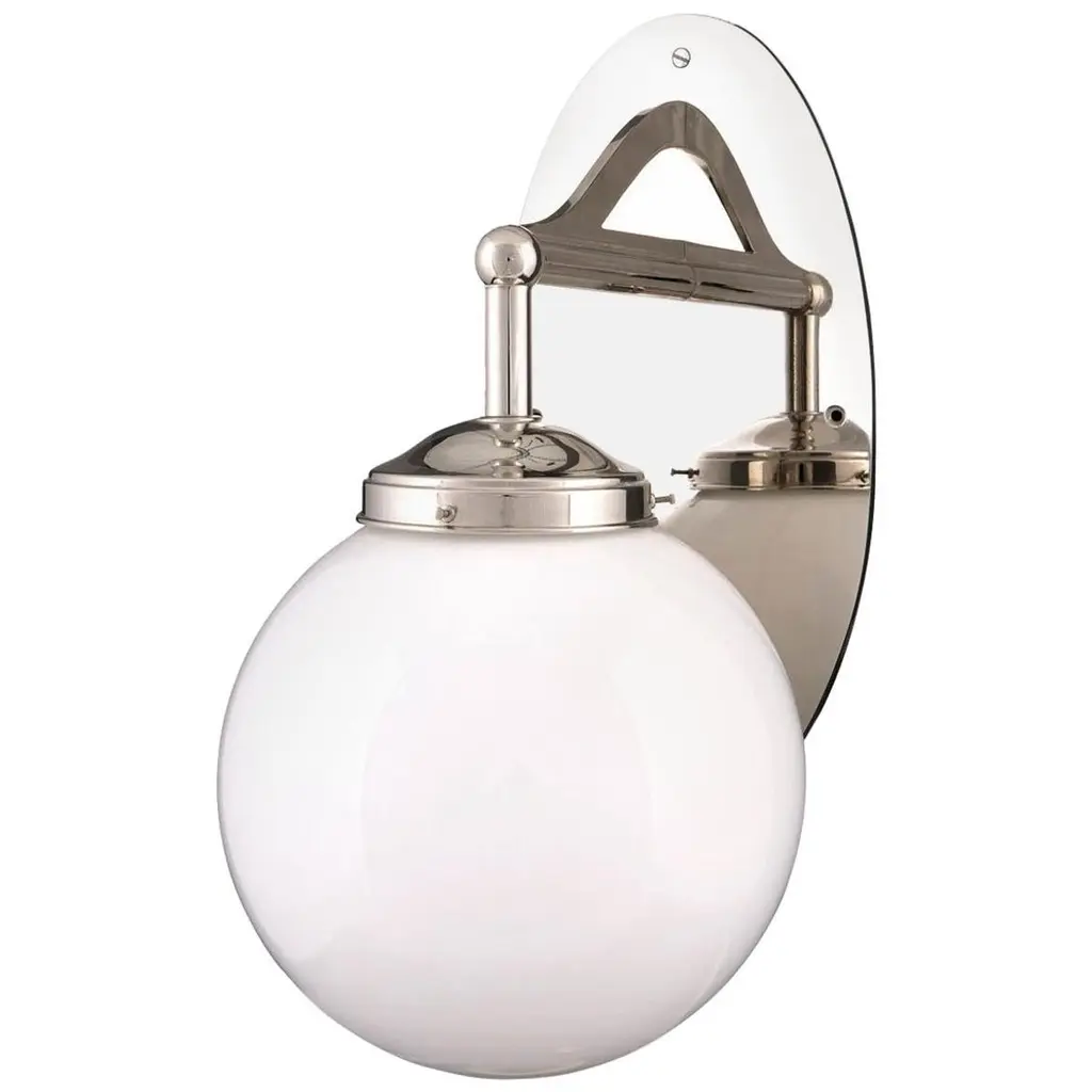 Italian Art Deco style wall light with glossy white Murano glass globe mounted on unlacquered natural brass frame, designed by Fabio Bergomi for Fabio Ltd, made in Italy1 light / E12 or E14 type / max 40WMeasures: Height 12 inches, width 8 inches, depth 10 inchesOrder only / This item ships from ItalyPlease inquire for custom options / pricing / current lead timesOrder Reference #: FABIOLTD W758 WHITE