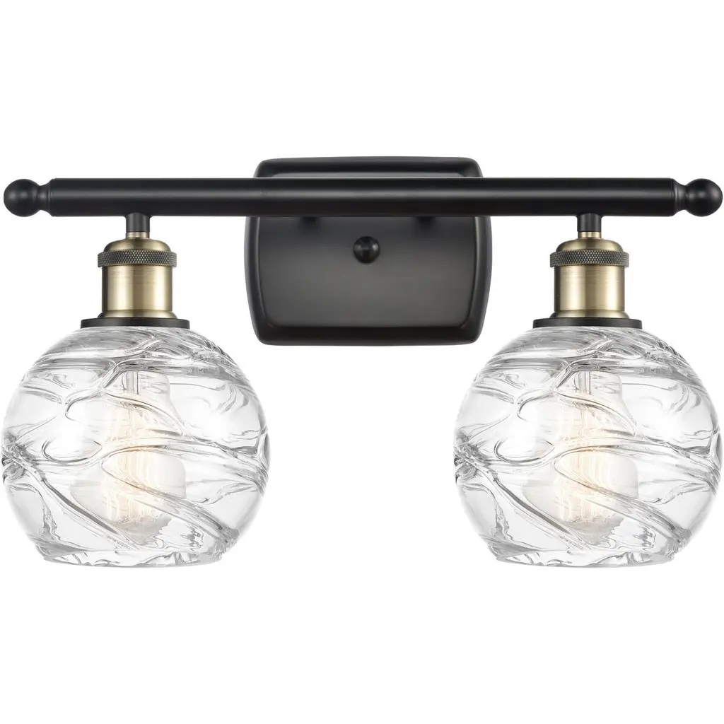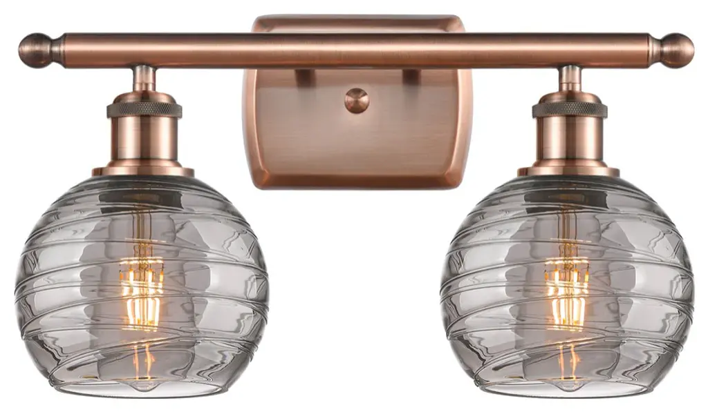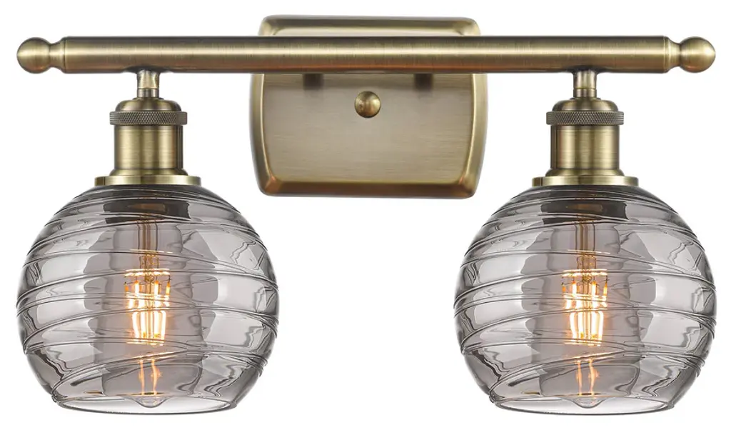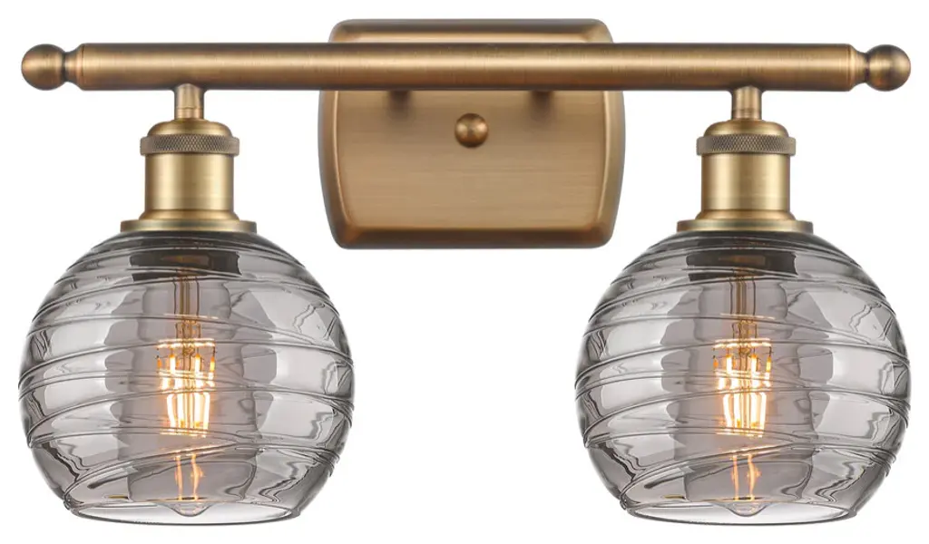INNOVATIONS 516-2W-SG-G1213-6SM Deco Swirl 2 Light 16 inch Bath Vanity Light Satin Gold. Style: Industrial, Modern Contempo, Restoration-Vintage, Transitional . Collection Name: Ballston. Metal Finish(Body): Satin Gold. Metal Finish(Canopy/Backplate): Satin Gold. Material: Steel, Cast Brass, Glass. Dimension(in): 9.125(H) x 15.875(W) x 7.0625(Ext). Bulb: (2)60W Medium Base Incandescent(Not Included). Voltage: 120. Dimmable: Yes. Color Temperature (Kelvin): 2200. Color Rendering Index (CRI): 99.9. Lumens: 220. Life Expectancy (Hours): 2000. Glass Shade Description: Light Smoke Athens Deco Swirl 8". Glass Type: Smoked. Shade Shape: Globe/Orb. Glass or Metal Shade Color: Light Smoke Deco Swirl. Shade Material: Glass. Shade Dimension(in): 5.875(W) x 5.125(H). Fitter Measurement (Glass Or Metal Shade Fitter Size): Neckless with a 1.675 inch opening. Backplate Dimension(in): 4.5(H) x 6(W) x 0.75(Depth). ADA Compliant: No. California Proposition 65 Warning Required: Yes. UL/ETL Certification Type: Damp Location.